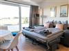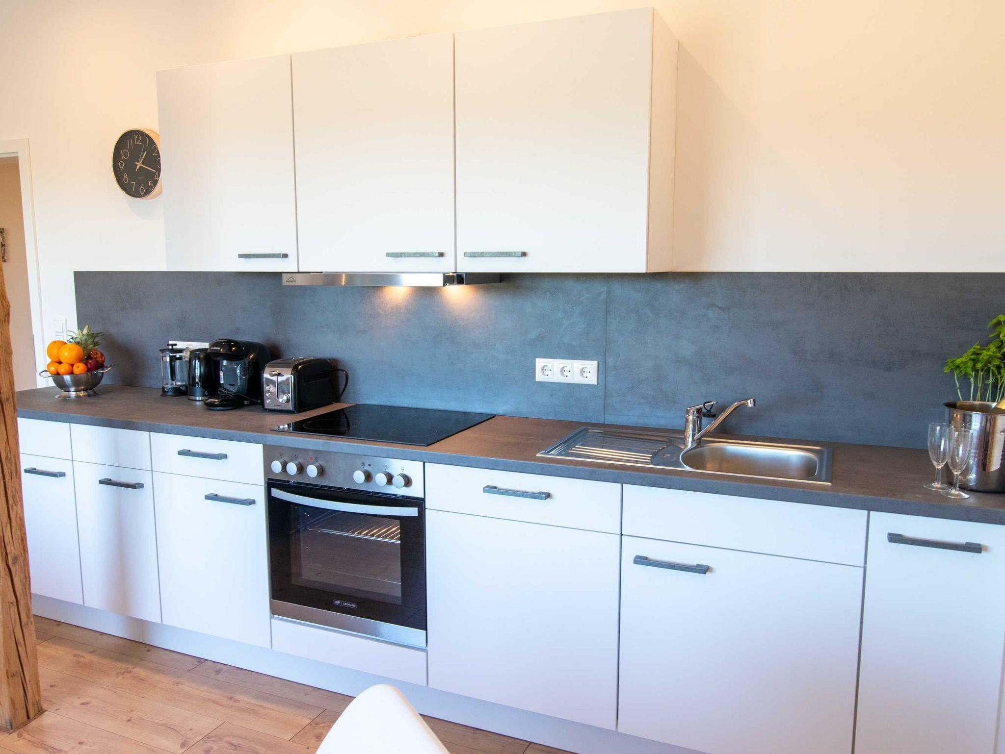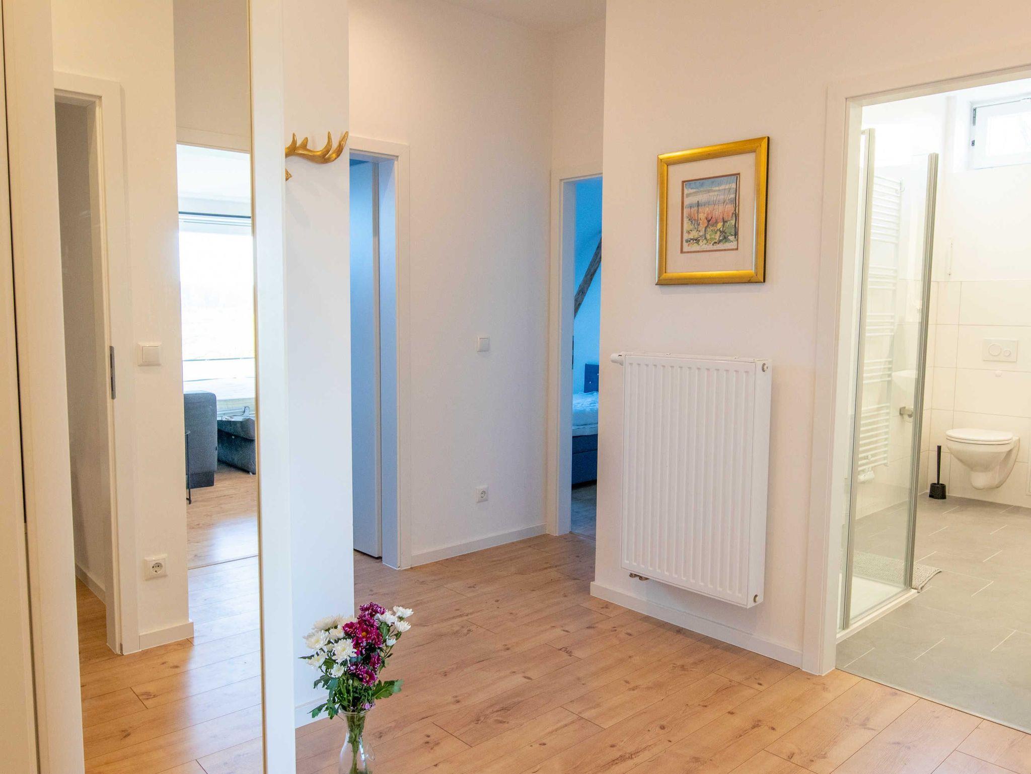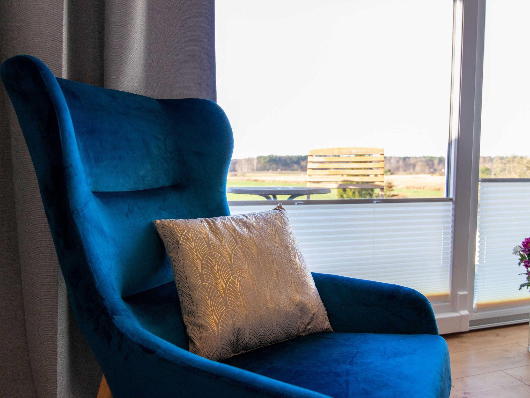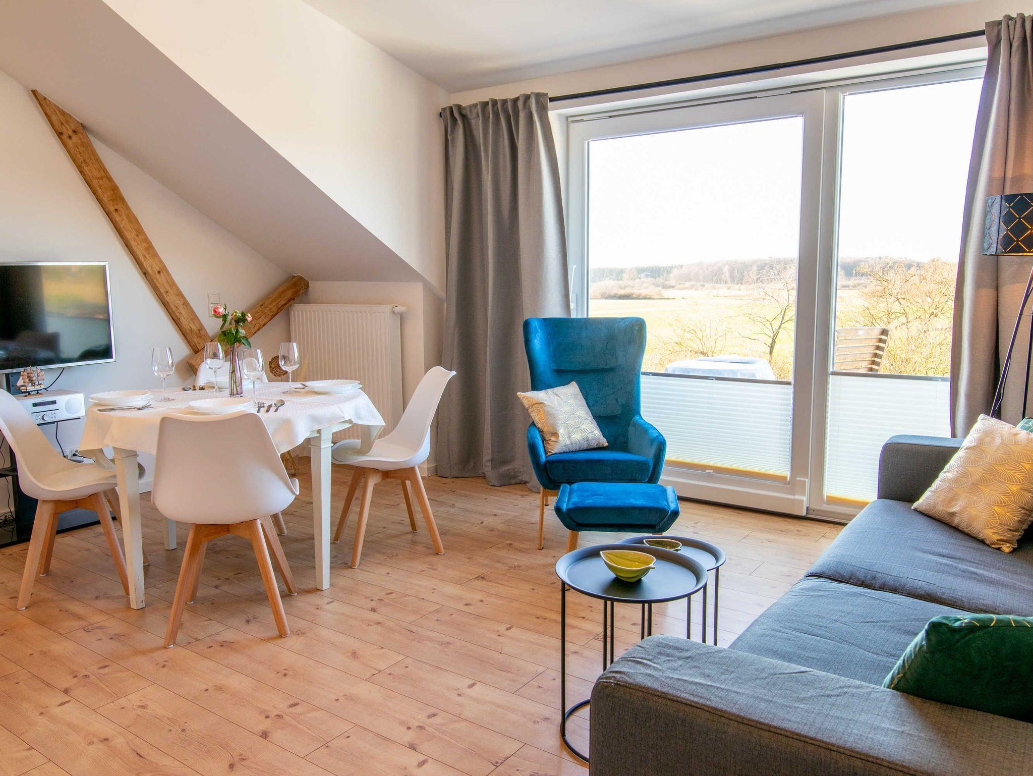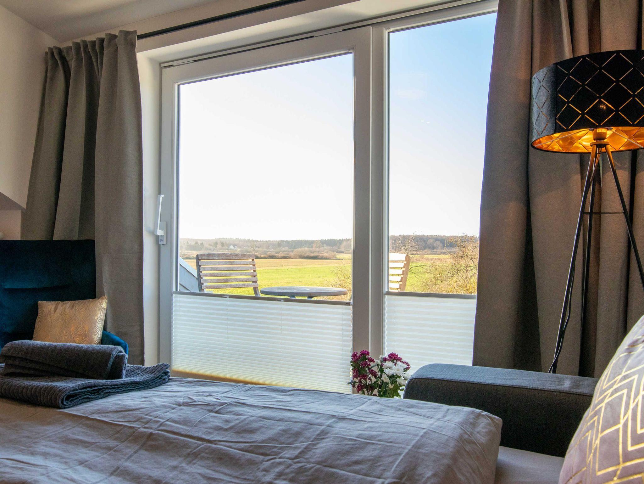 Die Ferienwohnung Panoramablick 2 im Landhaus Wiesenblick in Zarrendorf ist für bis zu 6 Personen geeignet und verfügt auf 75m² Fläche über 1 Wohnbereich mit offener Küche und Essbereich, sowie einer Schlafcouch die zu einem vollwertigen Bett (160x200) umgebaut werden kann. Die zwei separaten Schlafzimmer beinhalten jeweils ein Doppelbett (160x200) und eine Garderobe. Das Badezimmer ist abschließbar und mit einer ebenerdigen Dusche, Badewanne, Waschbecken und WC ausgestattet. Die Küche enthält neben einer Spüle, Geschirrspüler, Backofen, Cerankochfeld, Kühlschrank mit Gefrierfach, Wasserkocher, Toaster, Tassimo Kaffeemaschine auch Küchenhelfer, Besteck und Geschirr. Der Balkon kann zum Sonnen und Entspannen genutzt werden, auf der Terrasse im Erdgeschoss steht ein Grill bereit.