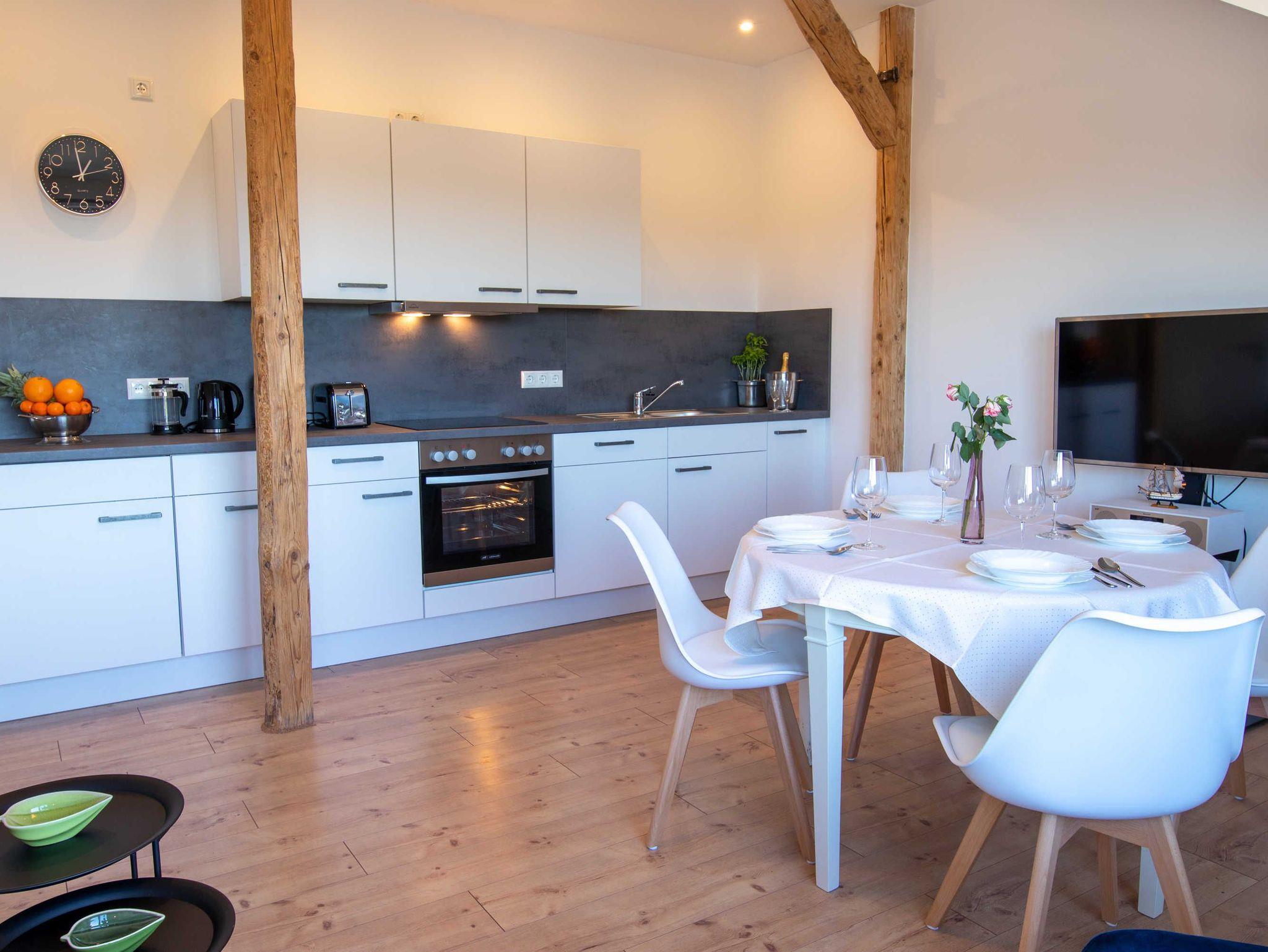 Das Landhaus Wiesenblick in Zarrendorf umfasst neben 3 Ferienwohnungen noch einen separat mietbaren Tanzsaal und eine Gaststube für eigene Feiern und Veranstaltungen. Die Ferienwohnungen Panoramablick 1 und 2 sind für jeweils 6 Personen ausgelegt und befinden sich im 1. OG und sind über einen gemeinsamen Zugang erreichbar. Die Ferienwohnung Wiesenglück für 8 Personen befindet sich im Erdgeschoss und besitzt einen separaten Eingang. Die sehr stilvoll eingerichteten Ferienwohnungen verfügen über jeweils 1 Wohnzimmer mit offener Küche und Essbereich, sowie 2 bzw. 3 getrennten Schlafzimmern. Das Badezimmer ist separat abschließbar und mit Dusche, WC und Badewanne ausgestattet. Die Küche beinhaltet eine Spüle, Geschirrspüler, Backofen, Cerankochfeld, Kühlschrank mit Gefrierfach, Wasserkocher, Toaster, Tassimo Kaffeemaschine, täglichen Küchenhelfern, Besteck und Geschirr für bis zu 6 bzw. 8 Personen. Auf dem Grundstück stehen Parkplätze und eine große Terrasse sowie Grillmöglichkeiten zur Verfügung.