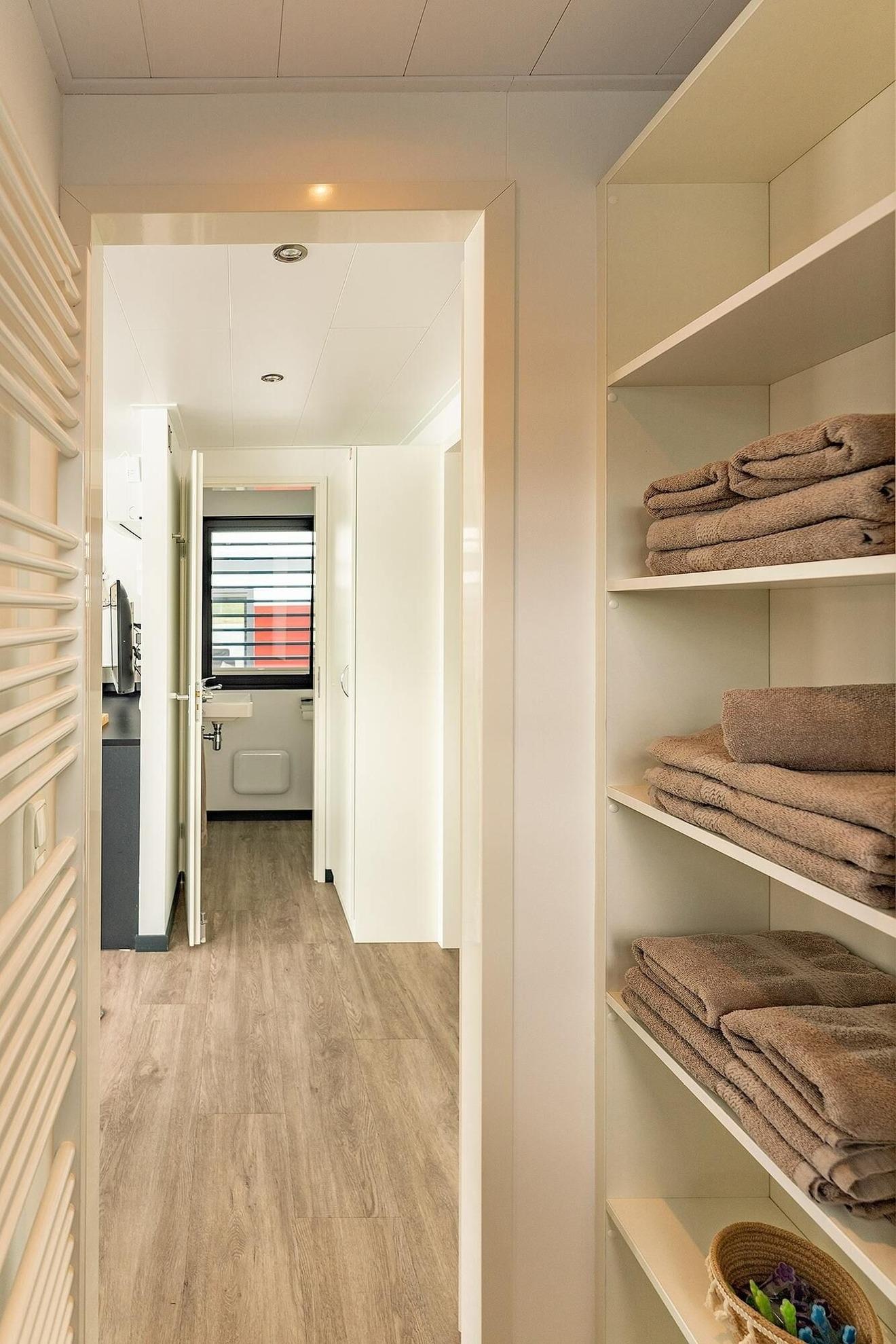 Das Hausboot ist ein floating 44. Es besitzt 2 Schlafzimmer mit je einem Doppelbett. Das Badezimmer ist mit einer Dusche ausgestattet und einem separaten WC. Der Wohn- und Essbereich ist ein stilvoll eingerichteter Raum mit einer dreiseitigen Glasfront.