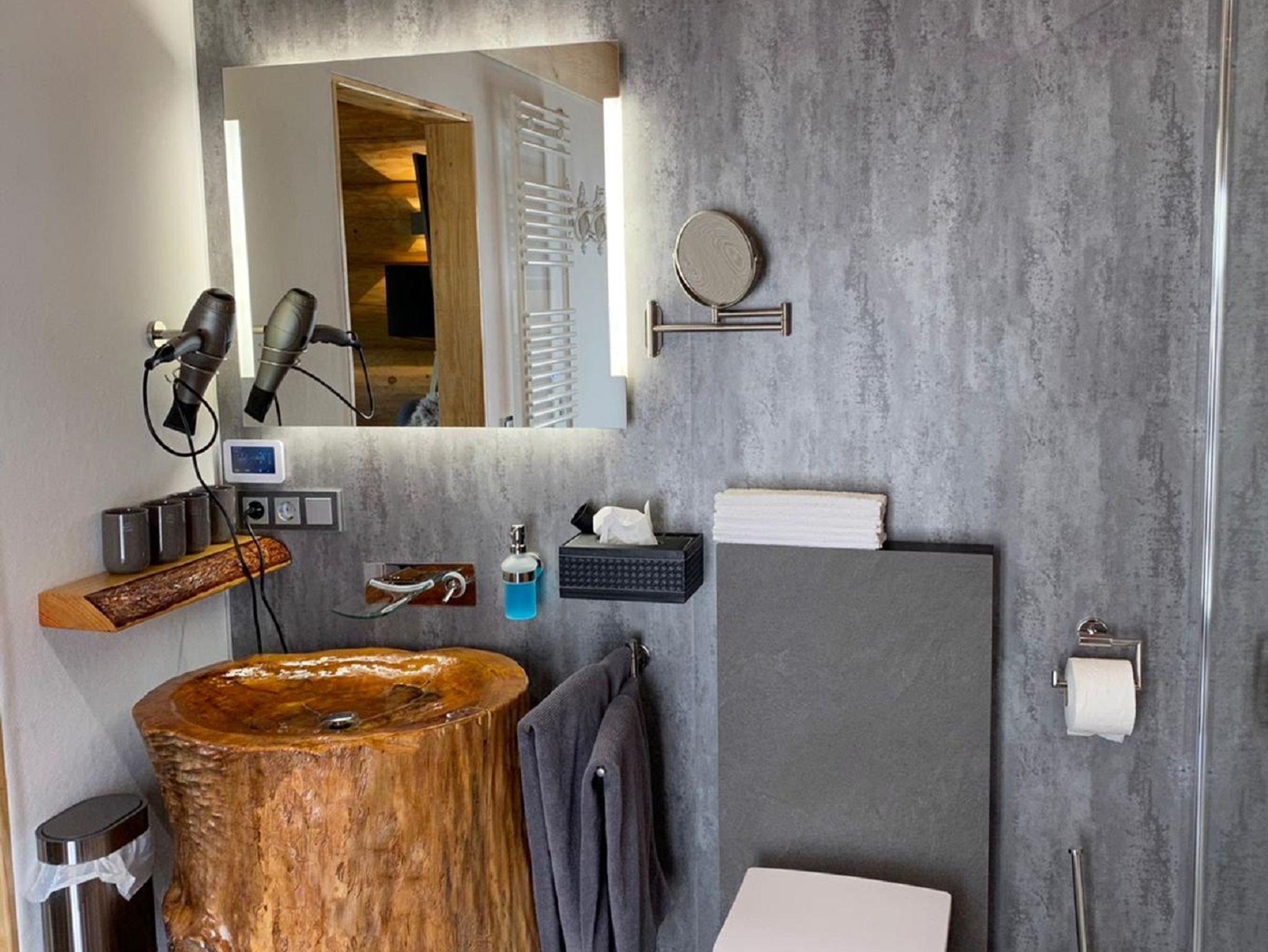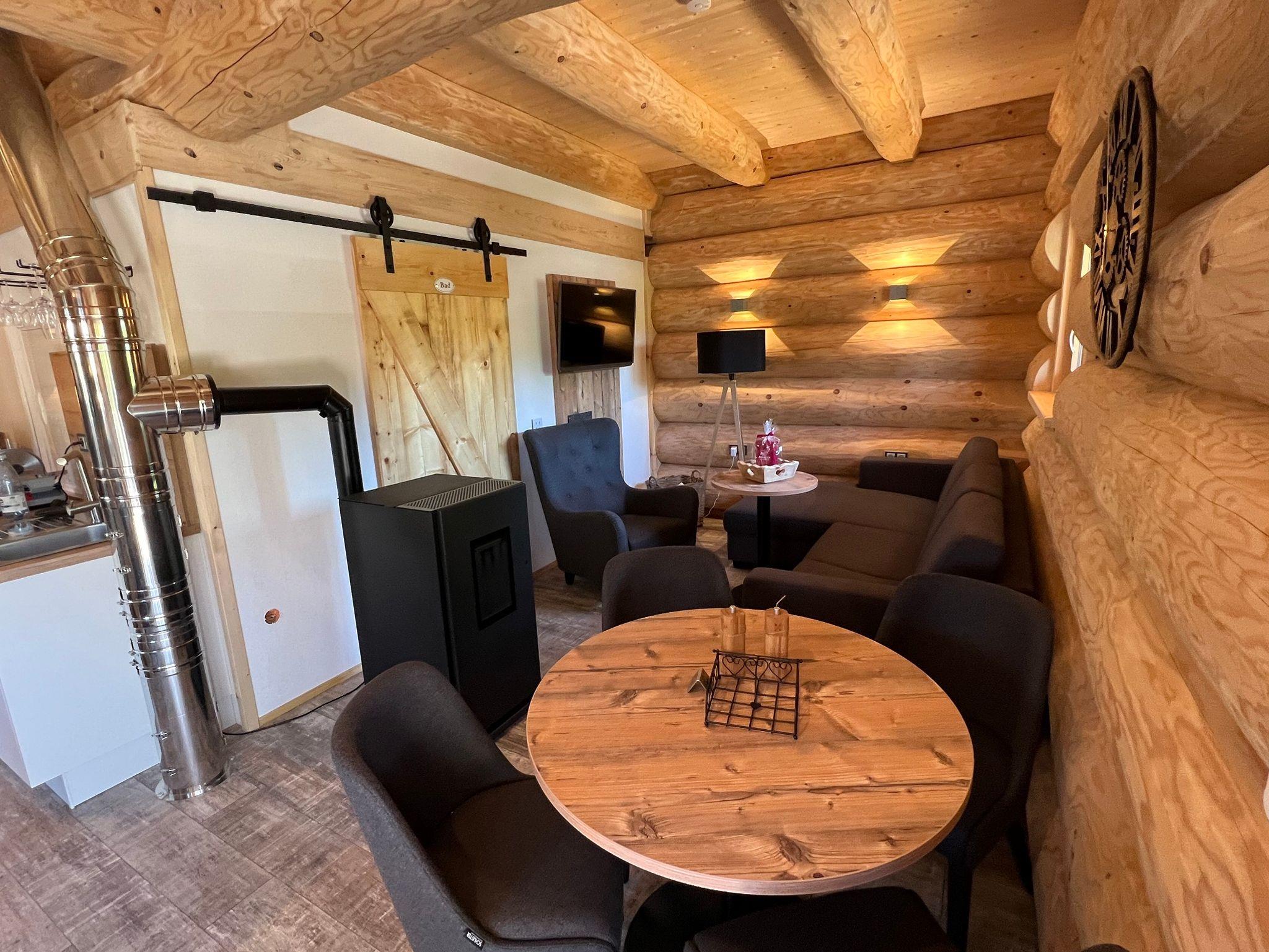 Wir wollen keine Sterne verkaufen, sondern Sie in ein Lebensgefühl der besonderen Art entführen. Sie werden ein Blockhaus beziehen, welches nachhaltig und nach traditioneller kanadischer Bauweise mit heimischen Hölzern aus Deutschland erstellt wurde. Innenausbau, diverse Möbel, Türen als auch die Unikate von Waschbecken und vieles mehr wurden nicht nur von uns selbst entworfen, sondern auch selbst angefertigt. Das Chalet ist ca. 110 qm groß und bietet Platz für bis zu 6 Personen. Auf zwei Etagen befinden sich 2 Schlafzimmer, eines mit einem Doppelbett, das zweite mit 2 Einzelbetten, eine voll ausgstattete Küche (mit Induktionsherd, Spülmaschine und natürlich auch ein Mikrowellenherd, Spülmaschine, Kaffeevollautomat), ein Wohnzimmer, ein Badezimmer mit Dusche und WC. Im Wohn-Essbereich befindet sich ein Esstisch, eine Couch (Schlafcouch) sowie ein Fernseher. Wlan und ein Parkplatz stehen kostenfrei zur Verfügung. Ein Pallets-Ofen sorgt für wohlige Wärme. Besondere Highlights sind der Whirlpool im Freien und die Fasssauna, sowie eine Wellnessdusche und ein Sitzbad. Diese Annehmlichkeiten stehen exklusiv zur Verfügung. Zudem erwartet Sie ein reichhaltig gefüllter Begrüßungskorb mit selbst gemachten Köstlichkeiten.
