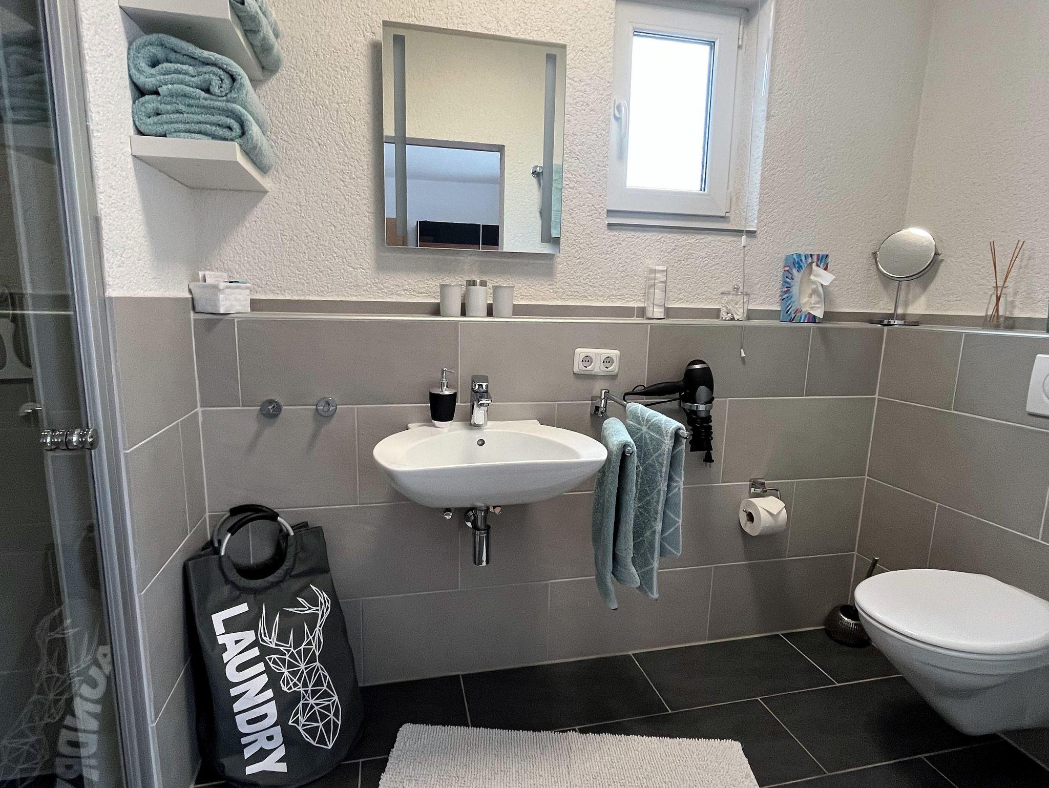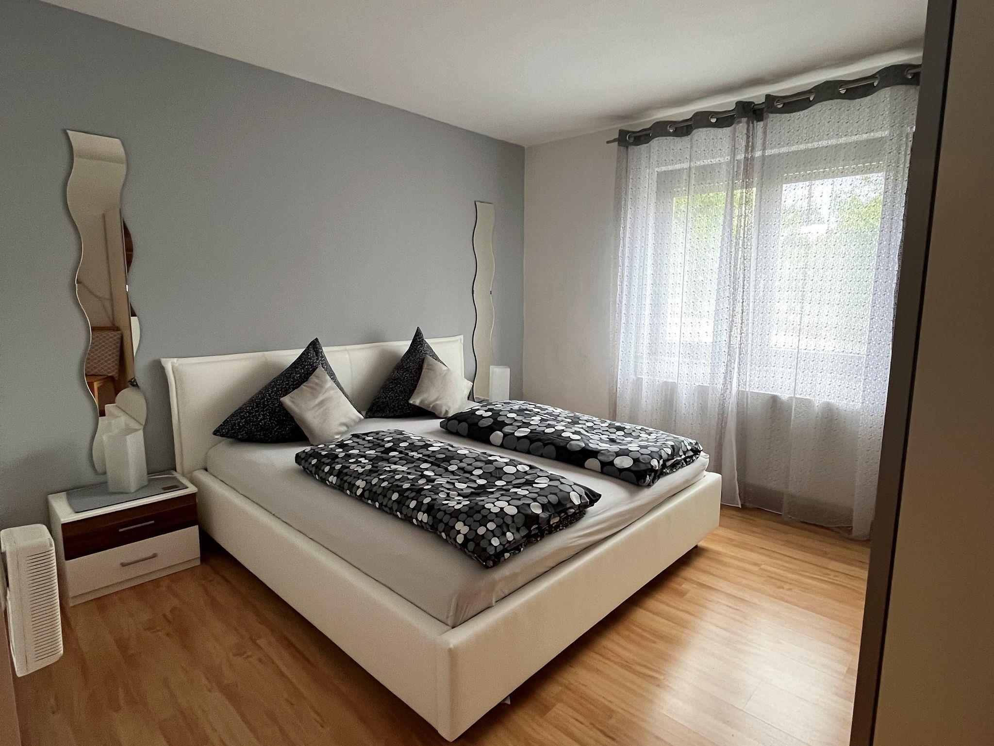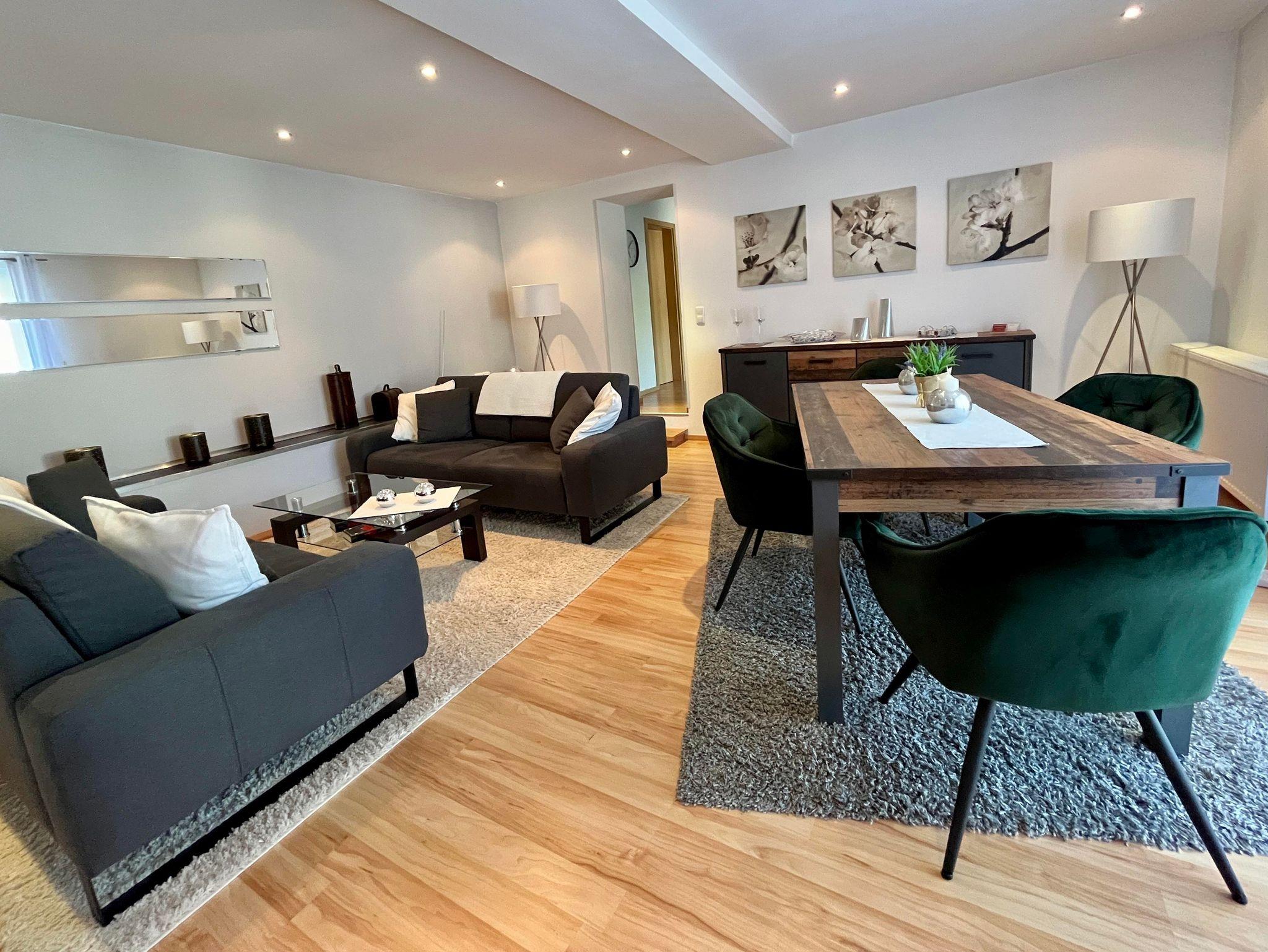 Moderne,helle Ferienwohnung mit 85 qm und großem Freisitz für bis zu 4 Personen, 2 Schlafzimmer mit eigenem modernem Bad und Flachbildschirm. Die Küche ist komplett ausgestattet, offener Ess- und Wohnraum. Parkplatz vor der Wohnung, freies W-LAN . Bei Nutzung beider Schlafzimmer für 2 Personen erheben wir einmalig einen Aufpreis von 30.- Euro.