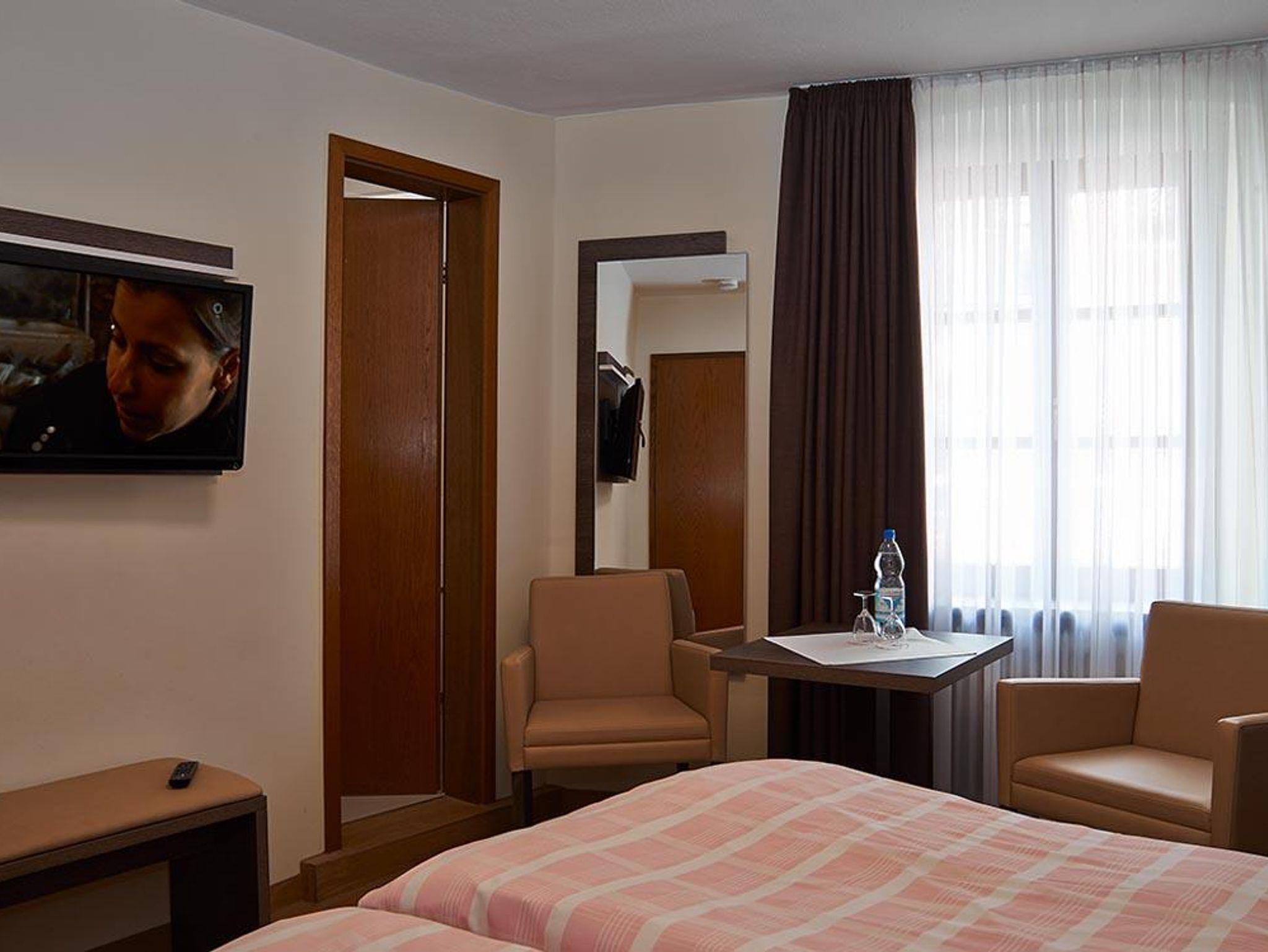 Dreibettzimmer mit DU/WC, Sat-TV, Radiowecker, kleiner Sitzgruppe und Balkon.