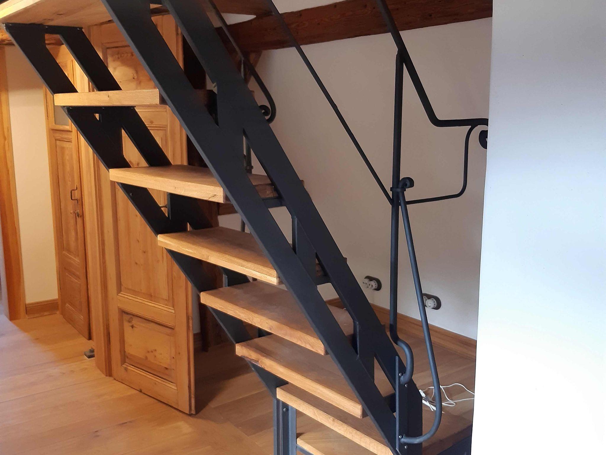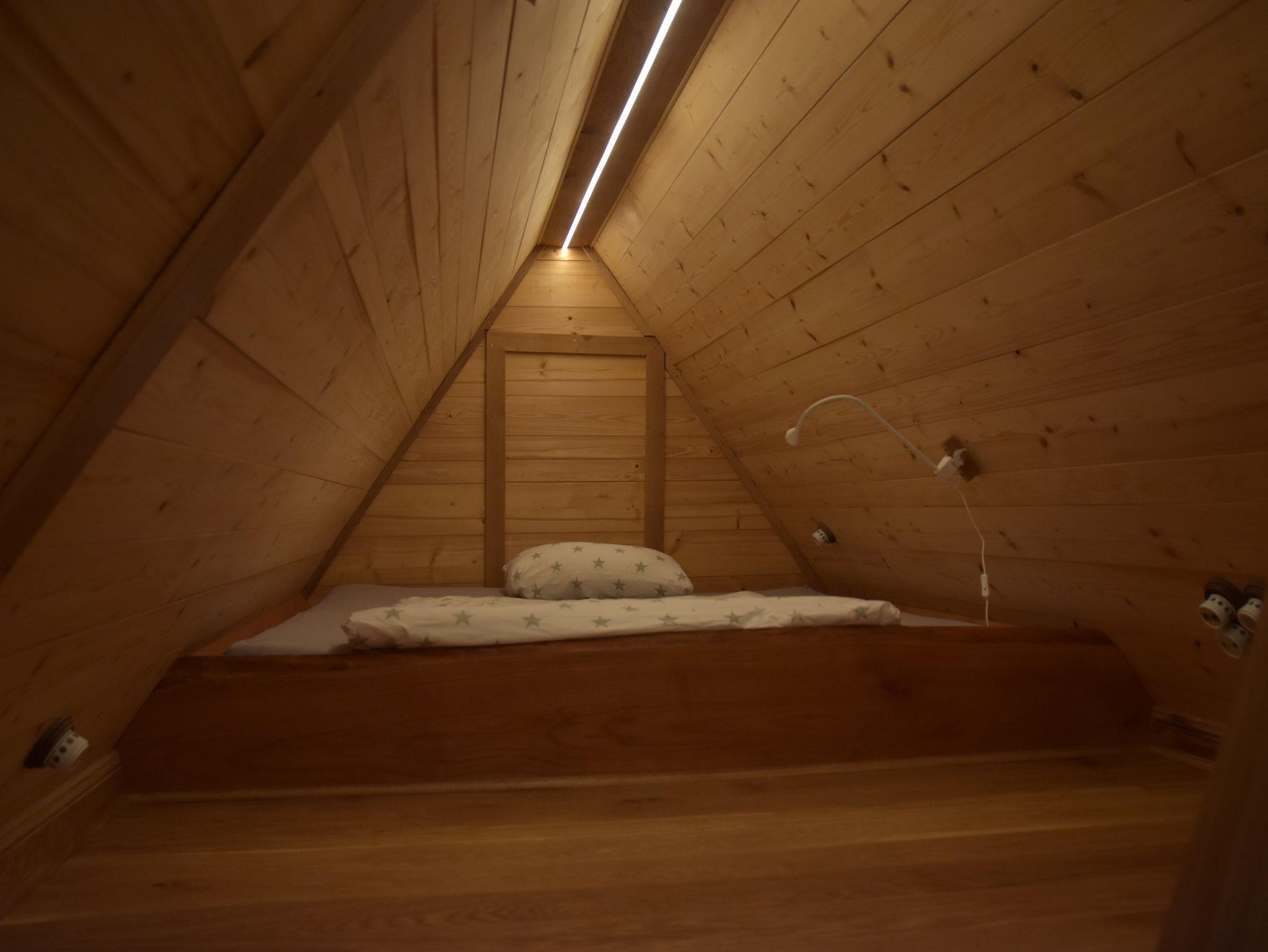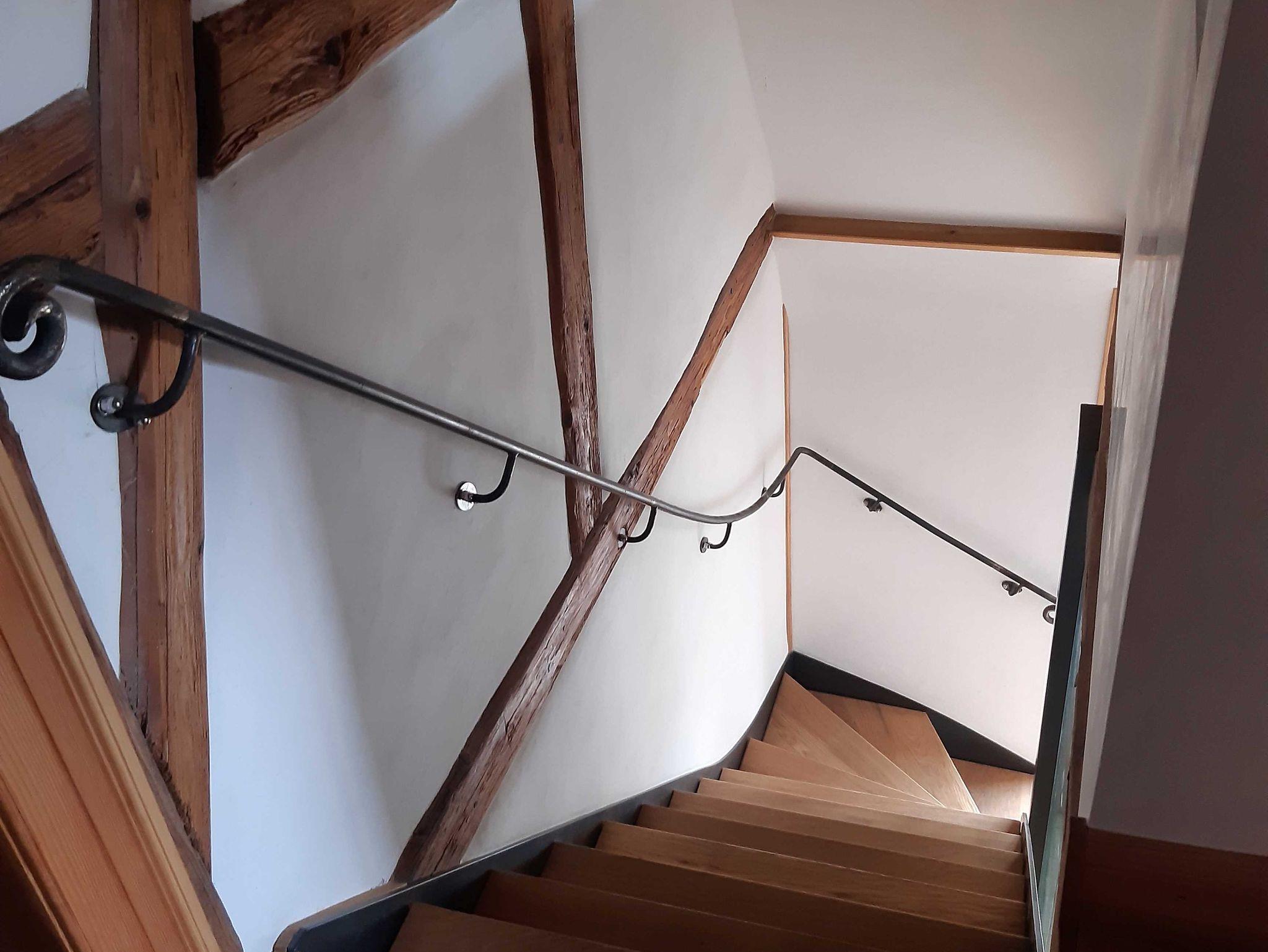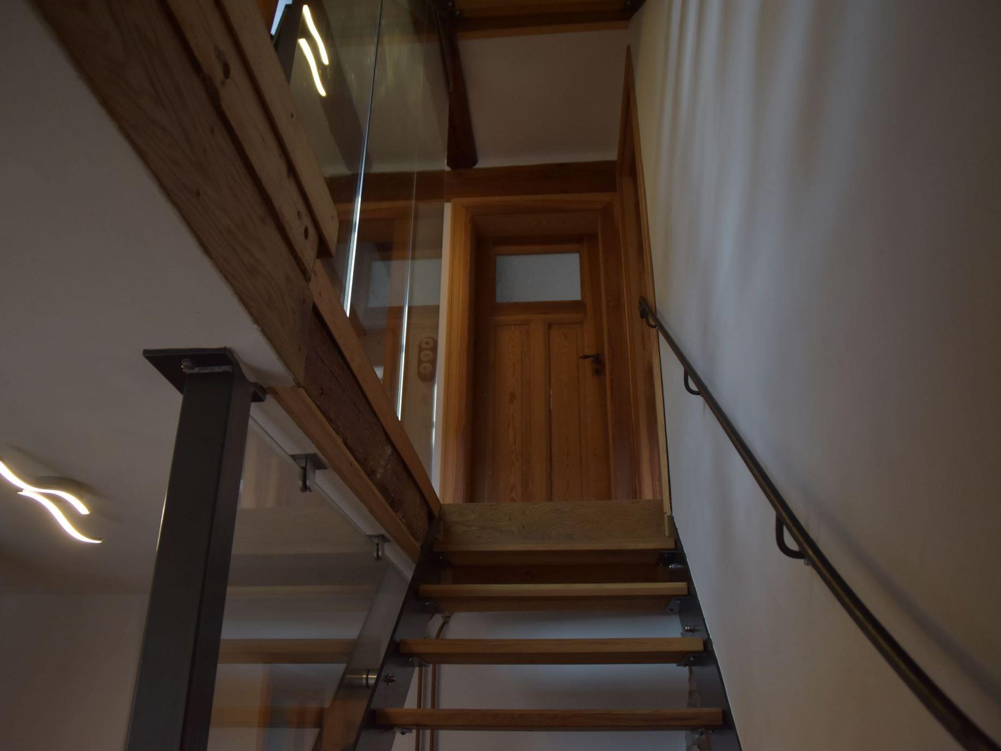 Die Treppe zum Schlafzimmer in den Spitzboden unter dem Dach befindet sich in einem der darunter liegenden Schlafzimmer. Die zwei Zimmer sind also nicht komplett voneinander getrennt.