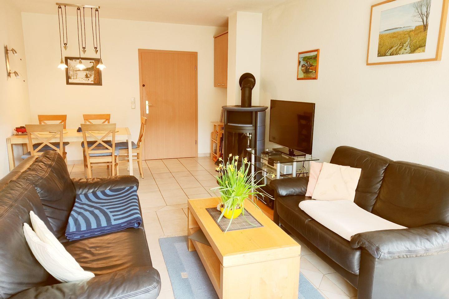 Die Wohnung bietet zwei geschmackvoll eingerichtete Schlafzimmer, die Platz für bis zu fünf Personen bieten. Ein modernes Badezimmer mit Dusche sorgt für maximalen Komfort. Der offene Wohnbereich mit integrierter Küche ist der perfekte Ort, um gemeinsame Mahlzeiten zuzubereiten und die Zeit miteinander zu genießen. Die Küche ist voll ausgestattet und lässt keine Wünsche offen: Cerankochfeld, Backofen, Geschirrspüler, Kühlschrank mit Gefrierbereich, Mikrowelle und Kaffeemaschine stehen für Ihre kulinarischen Aktivitäten bereit. Der angrenzende Essbereich lädt zum Verweilen oder zu geselligen Runden ein.