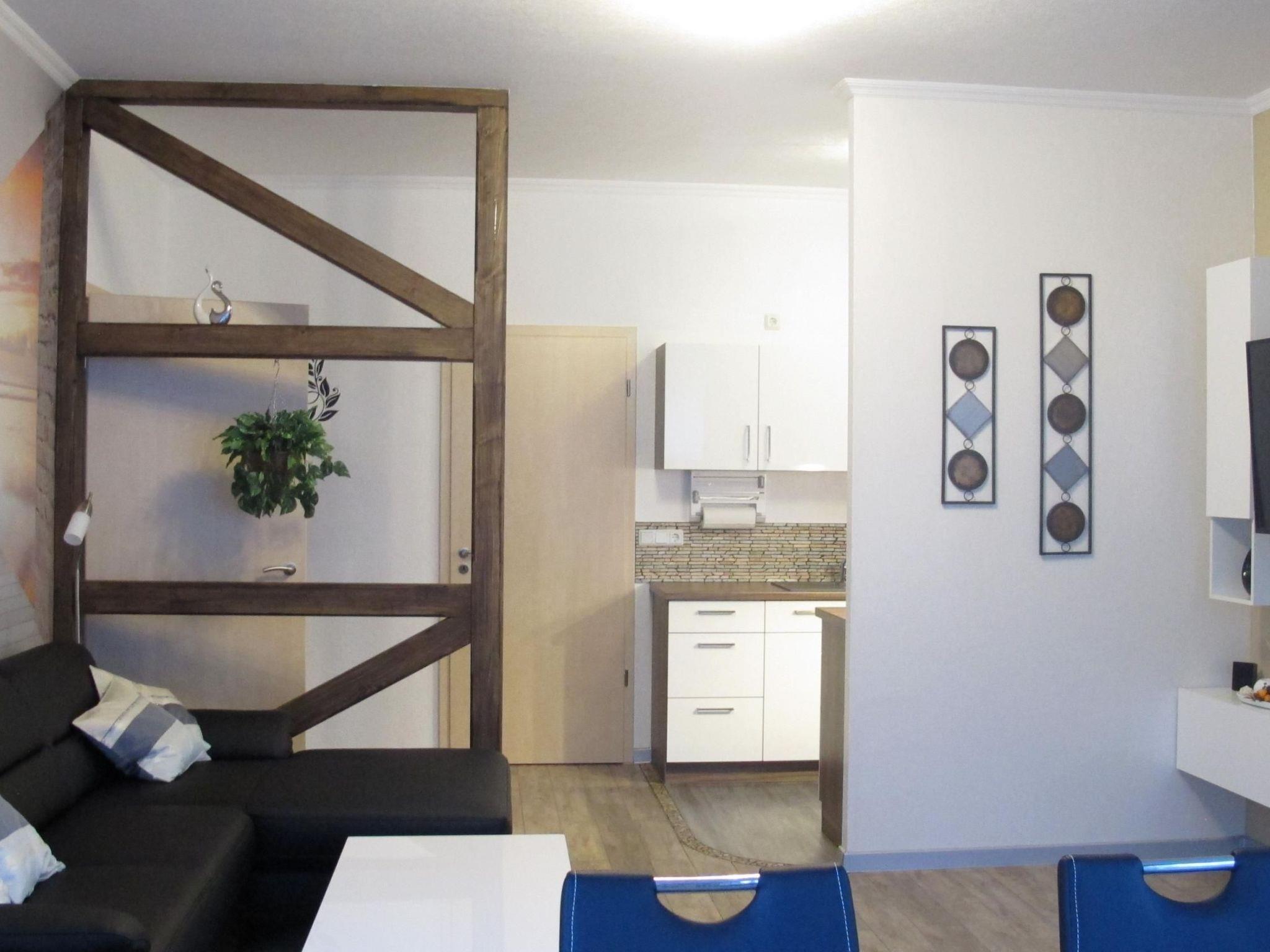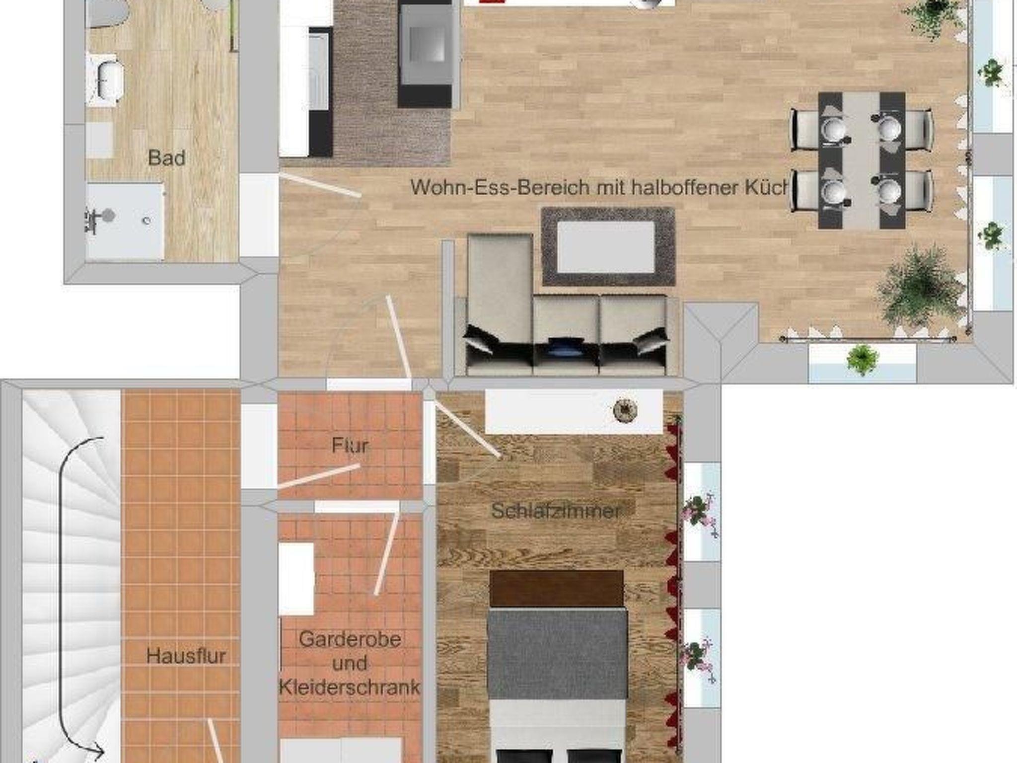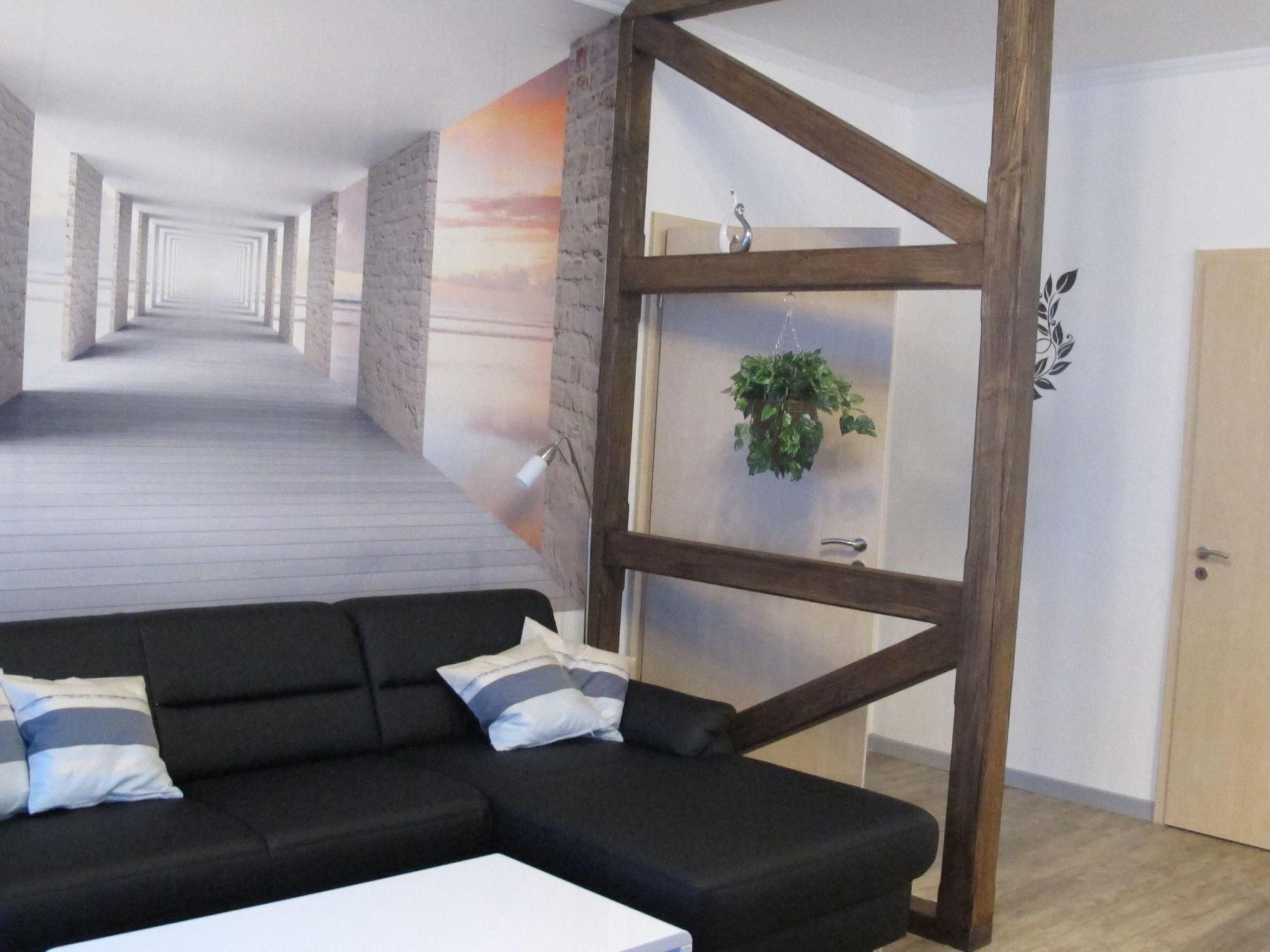 Maximum comfort and convenience await you inside the flat. Sleep soundly in the bedroom, equipped with a comfortable box-spring bed measuring 1.60 x 2.00 metres. The spacious living room not only serves as a dining area, but also has a sofa bed for an additional sleeping option. Particularly family-friendly: a travel cot and a high chair are available free of charge, and the modern daylight bathroom with walk-in shower and window is particularly practical for senior citizens and families with small children.
