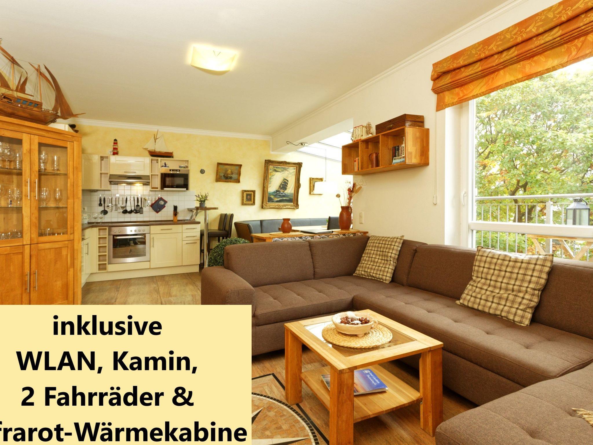 Exklusive Dachgeschoßwohnung „Ostseeblick“ mit Eck-Terrasse, Kamin und Infrarotsauna. Die Wohnung ist sehr hochwertig ausgestattet mit italienischen Bodenfliesen, Kamin, Fußbodenheizung u.v.m. Das Bad ist mit einer bodengleichen Dusche ausgestattet.