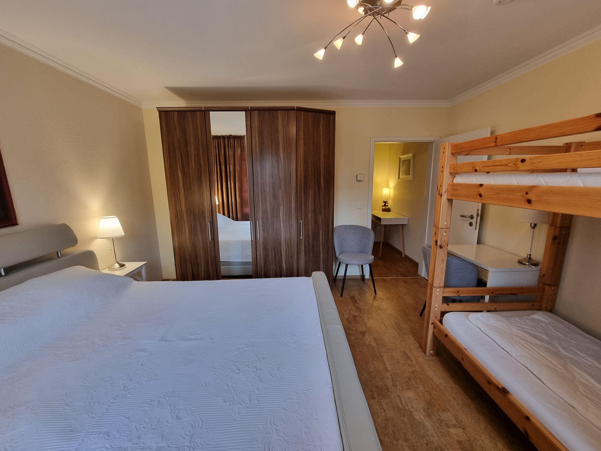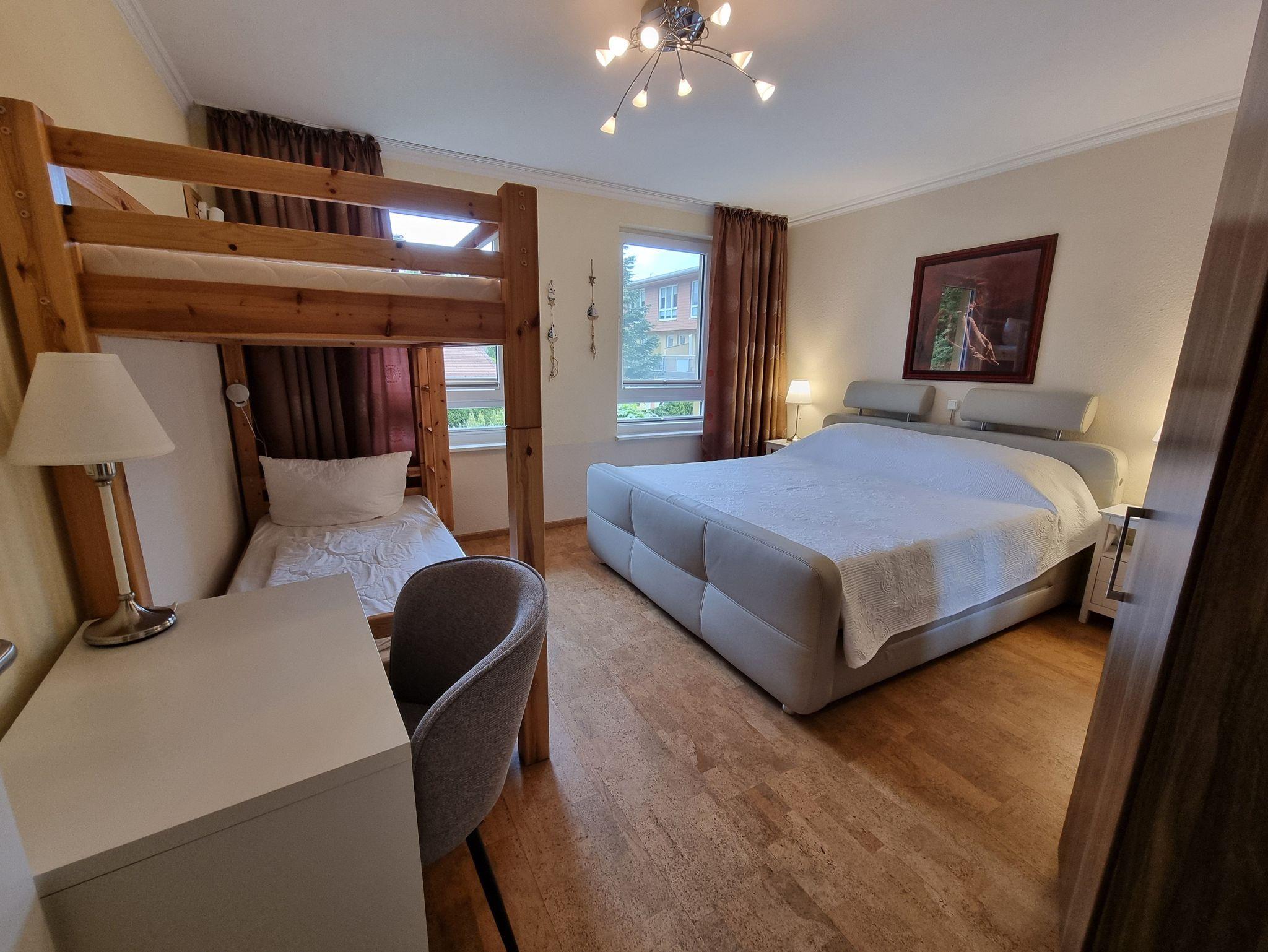 1 Schlafzimmer mit Doppelbett und Doppelstockbett (1,80 x 2m & 0,90 x 2m)