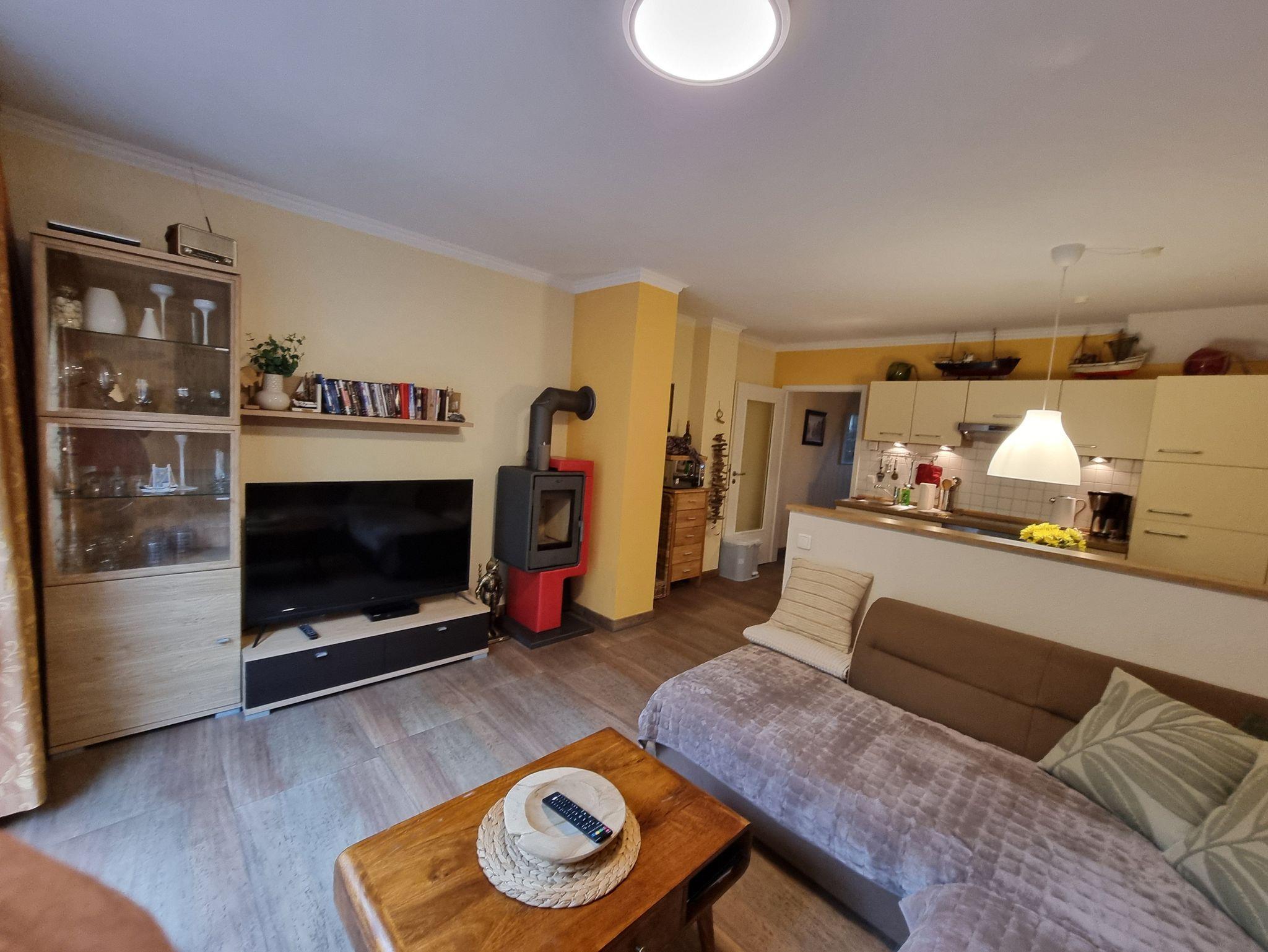 Im Erdgeschoss befindet sich das Wohnzimmer mit einer offenen und voll ausgestatteten Einbauküche, einem Kamin sowie ein großes Bad mit ebenerdiger Dusche, WC, Fön und Infrarot-Wärmekabine. Die zwei Schlafzimmer und ein zweites Bad mit WC & Dusche befinden sich in der oberen Etage. Die Wohnung ist hochwertig eingerichtet mit Kamin, Fußbodenheizung, Flachbild-TV, DVD-Player, Radio, Einbauküche mit Ceranherd, Backofen, Mikrowelle, Kühlschrank, Tiefkühlfach, etc.