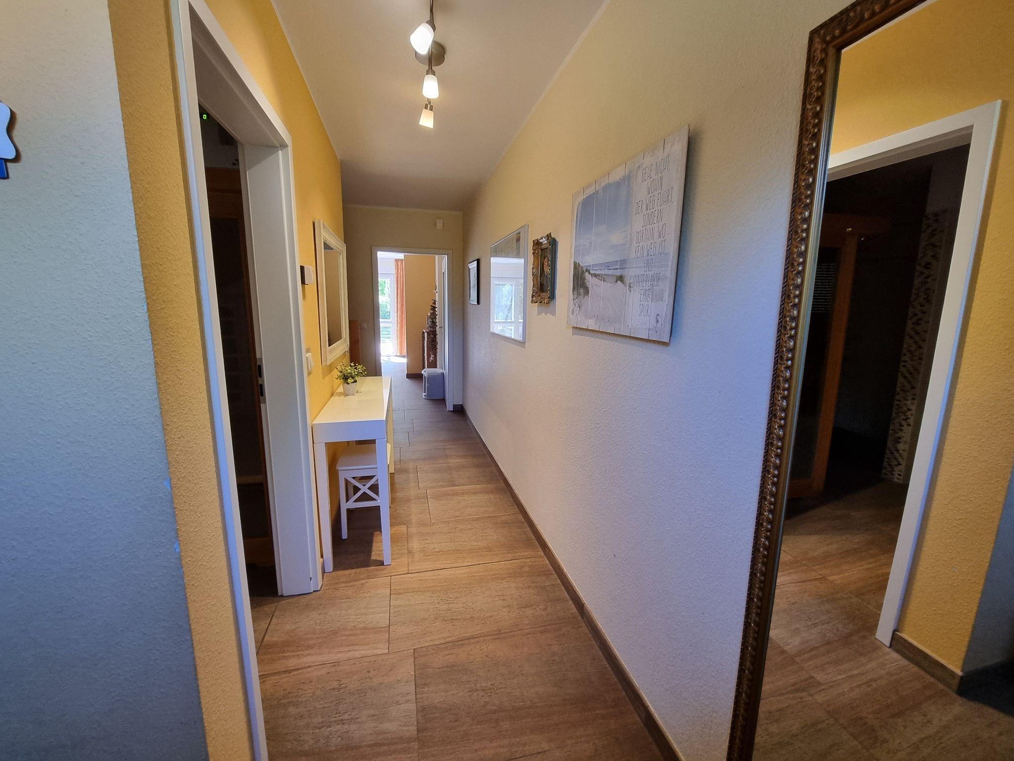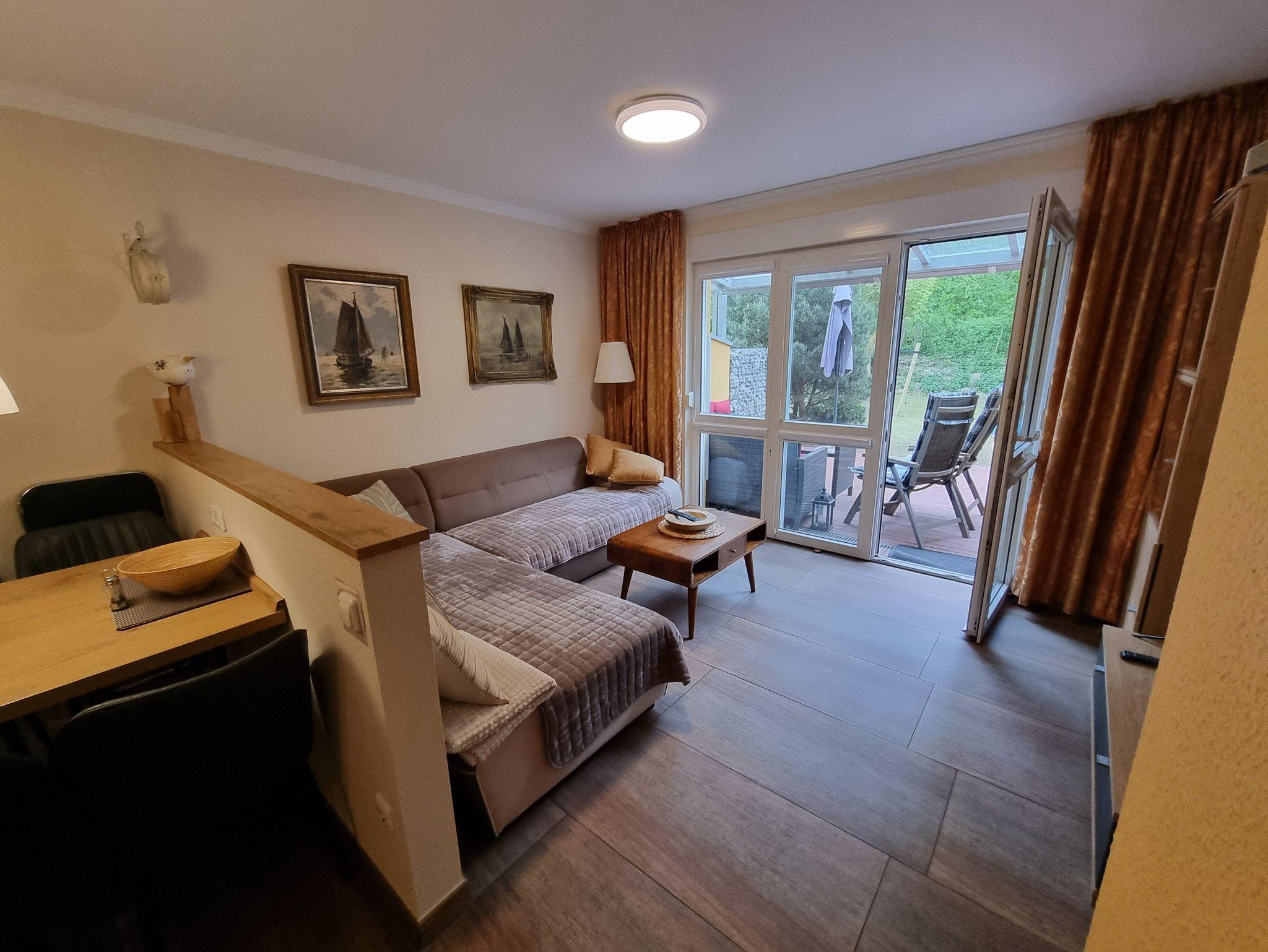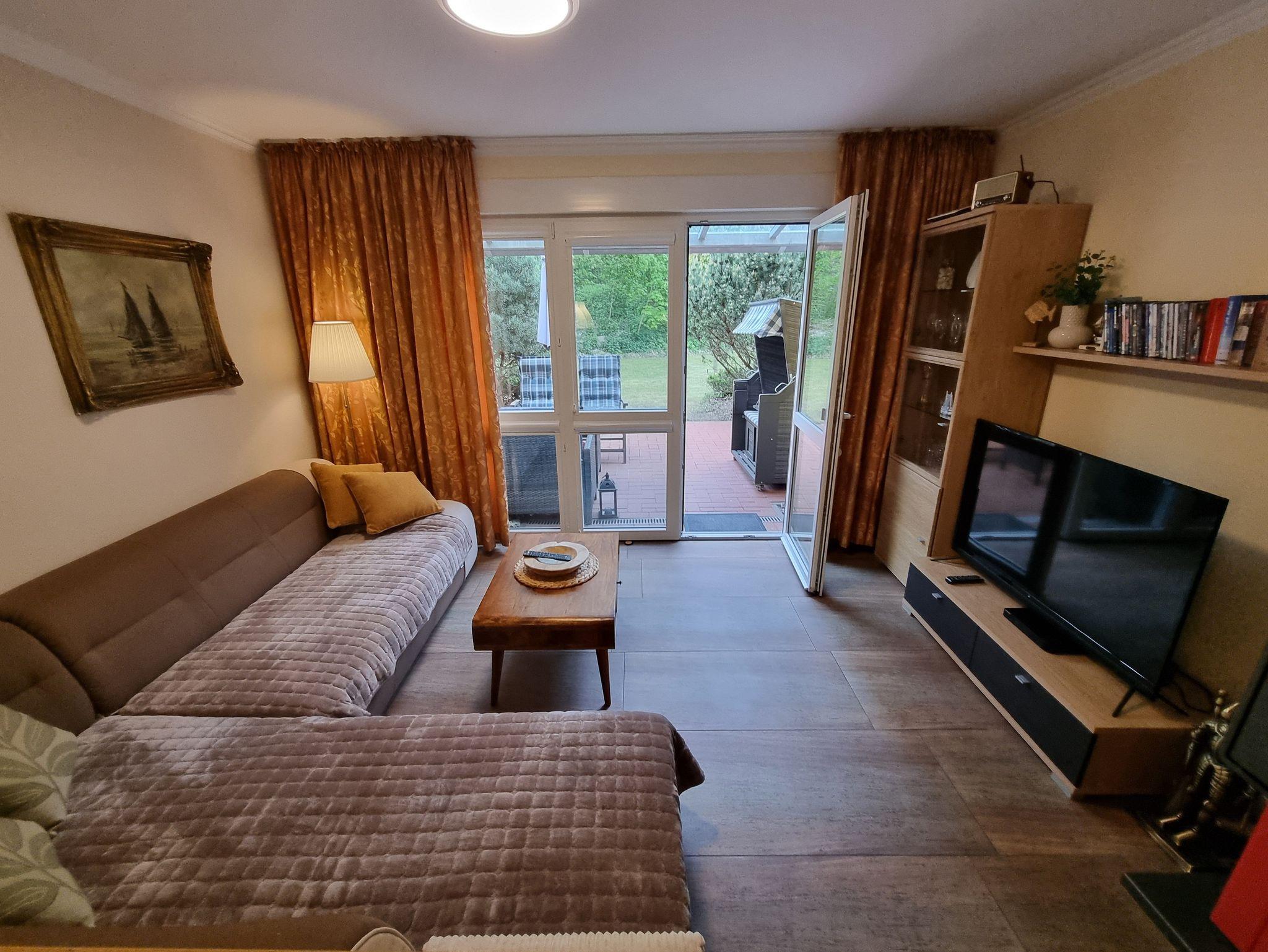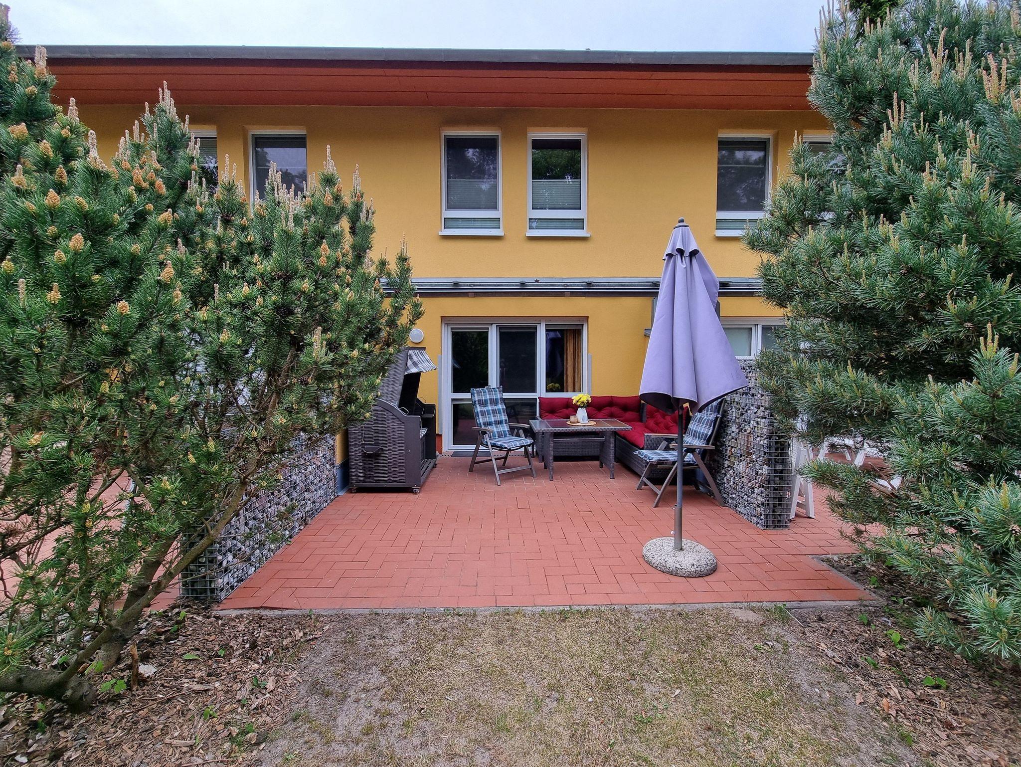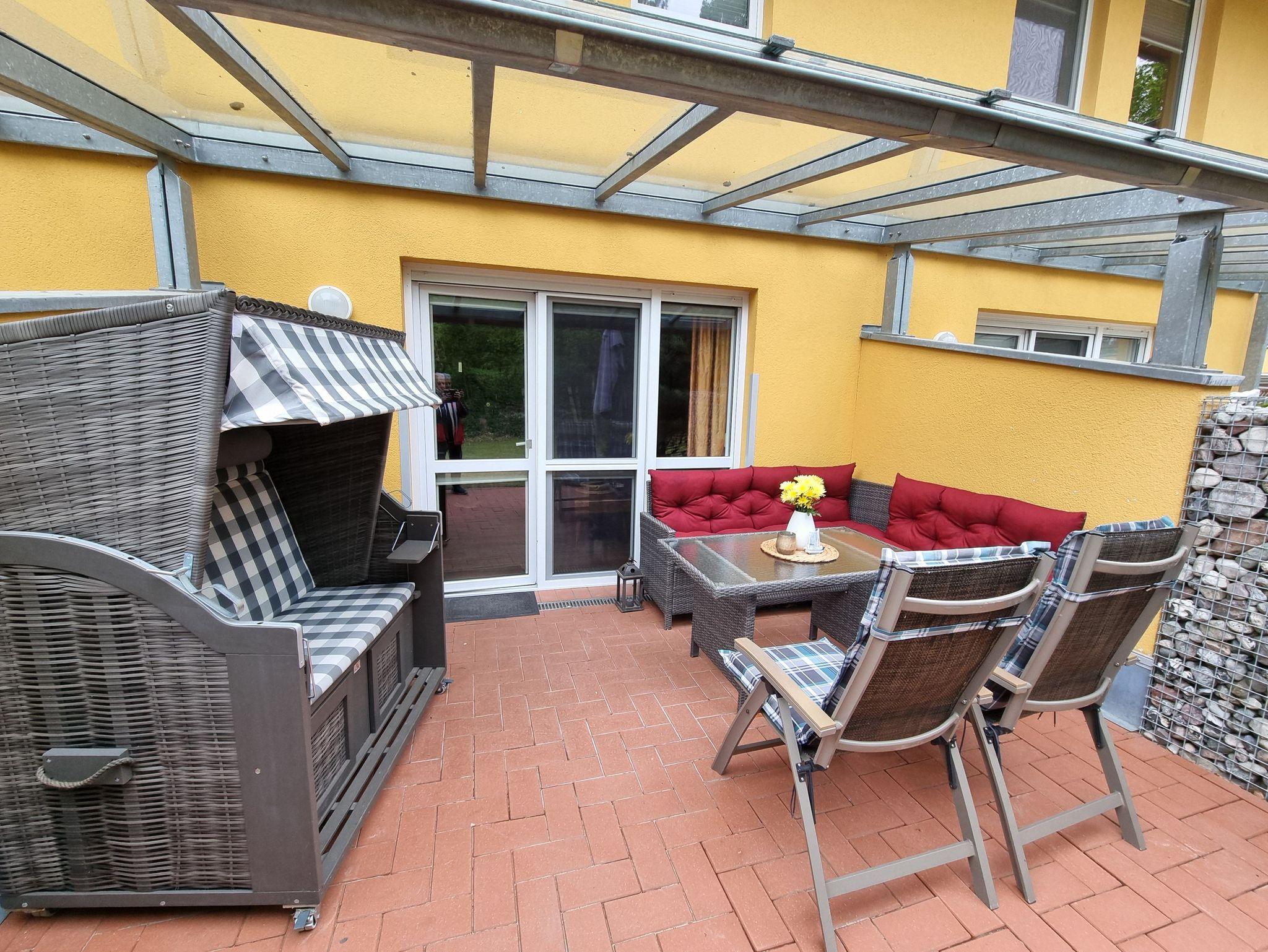 An die Wohnung schließt eine große Terrasse mit eigenem 43 m² großen Garten und einem erholsamen Blick zum Waldrand an. Die Terrasse ist möbliert und hat zusätzlich einen Strandkorb, in dem man es sich gemütlich machen kann.