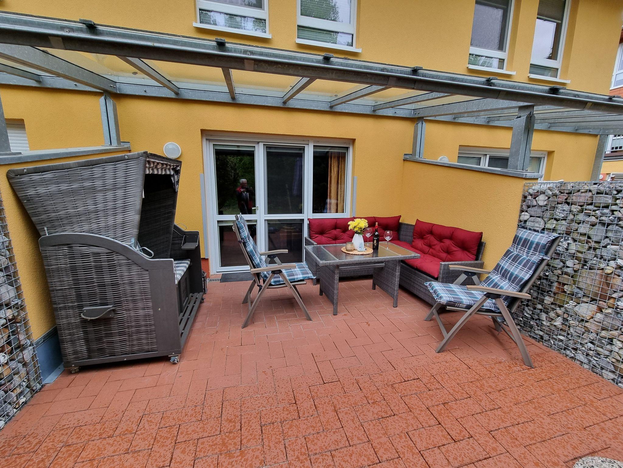 1 Terrasse mit 43m² Garten mit Gartenmöbeln & Strandkorb