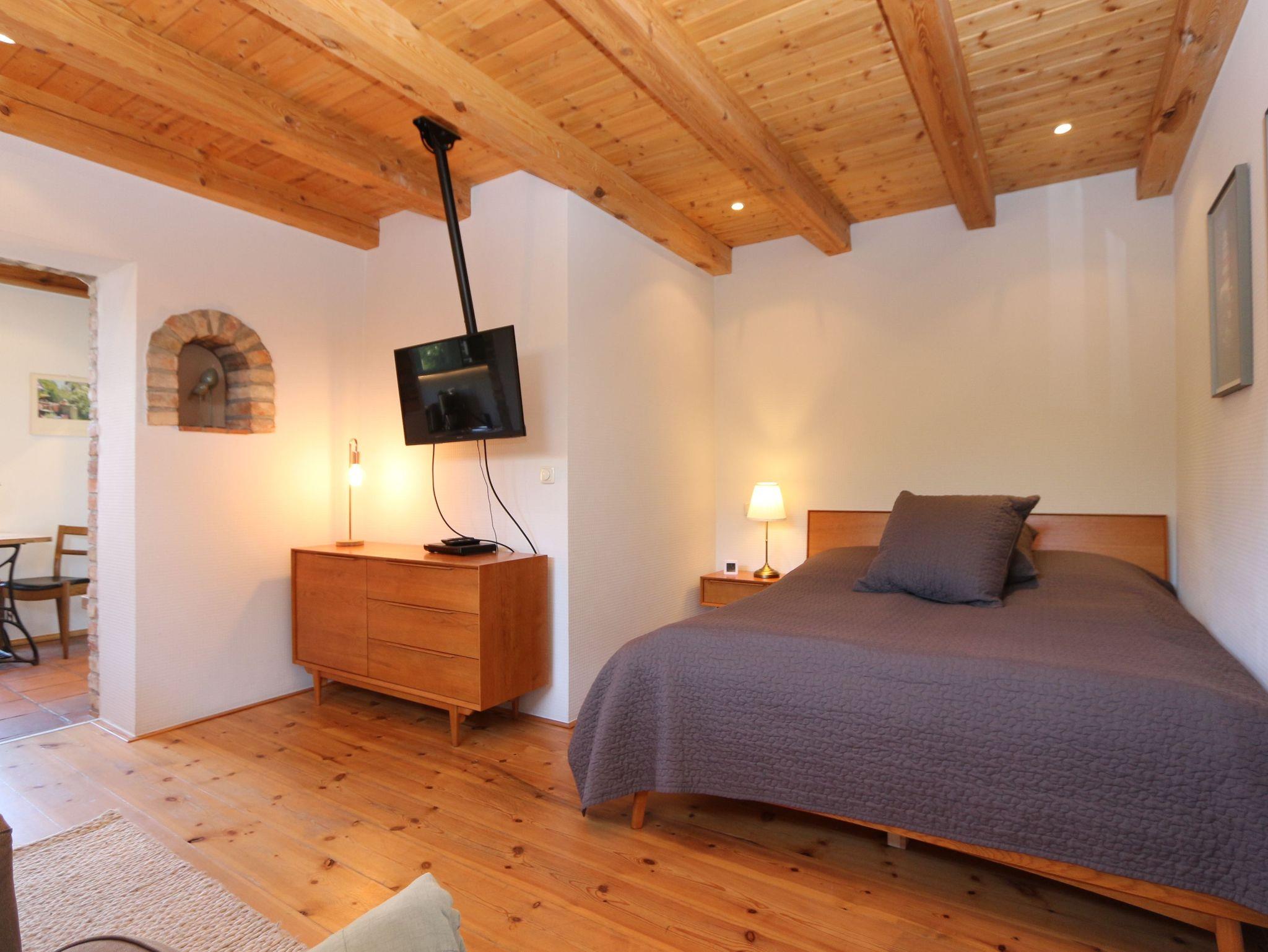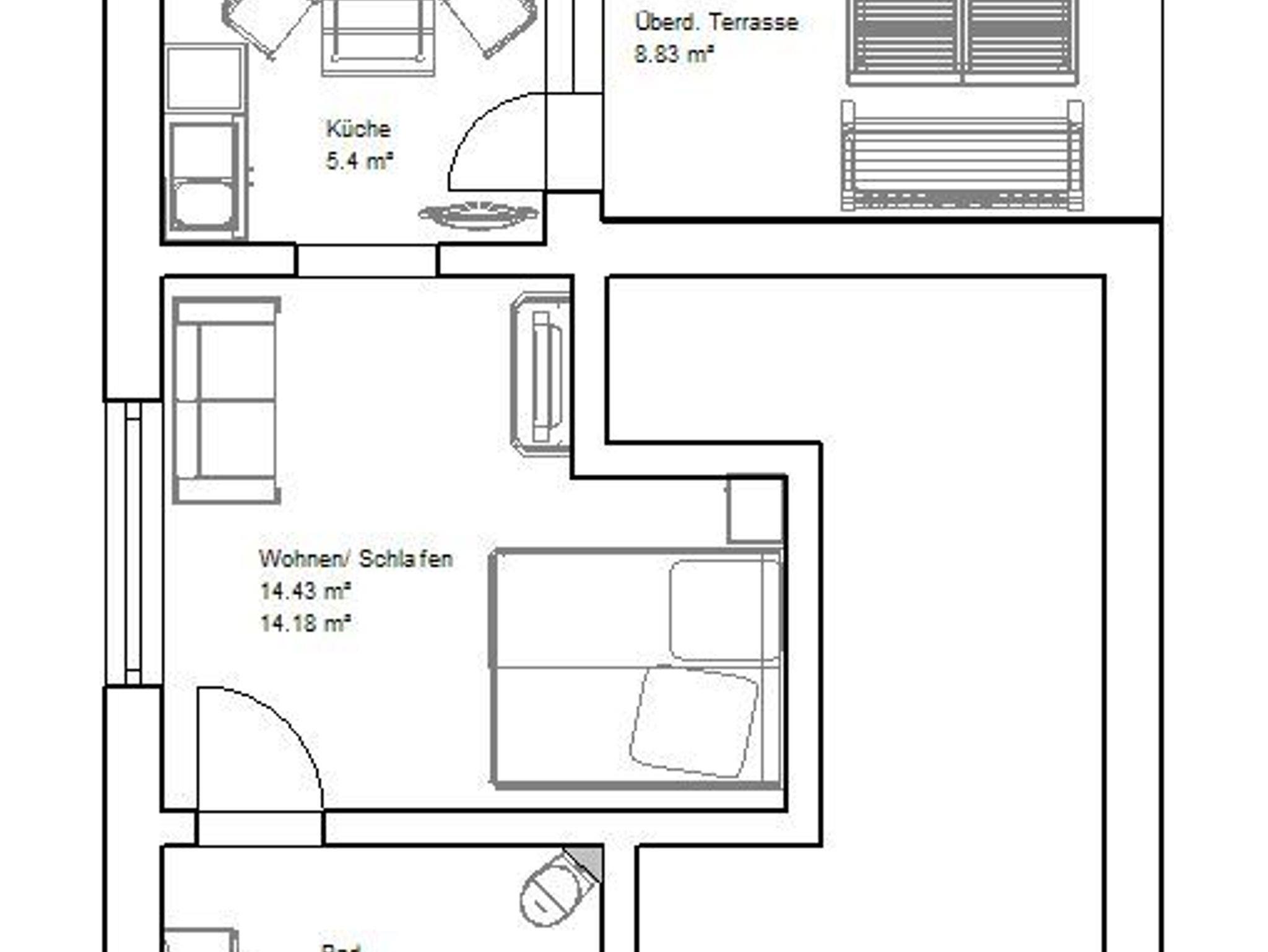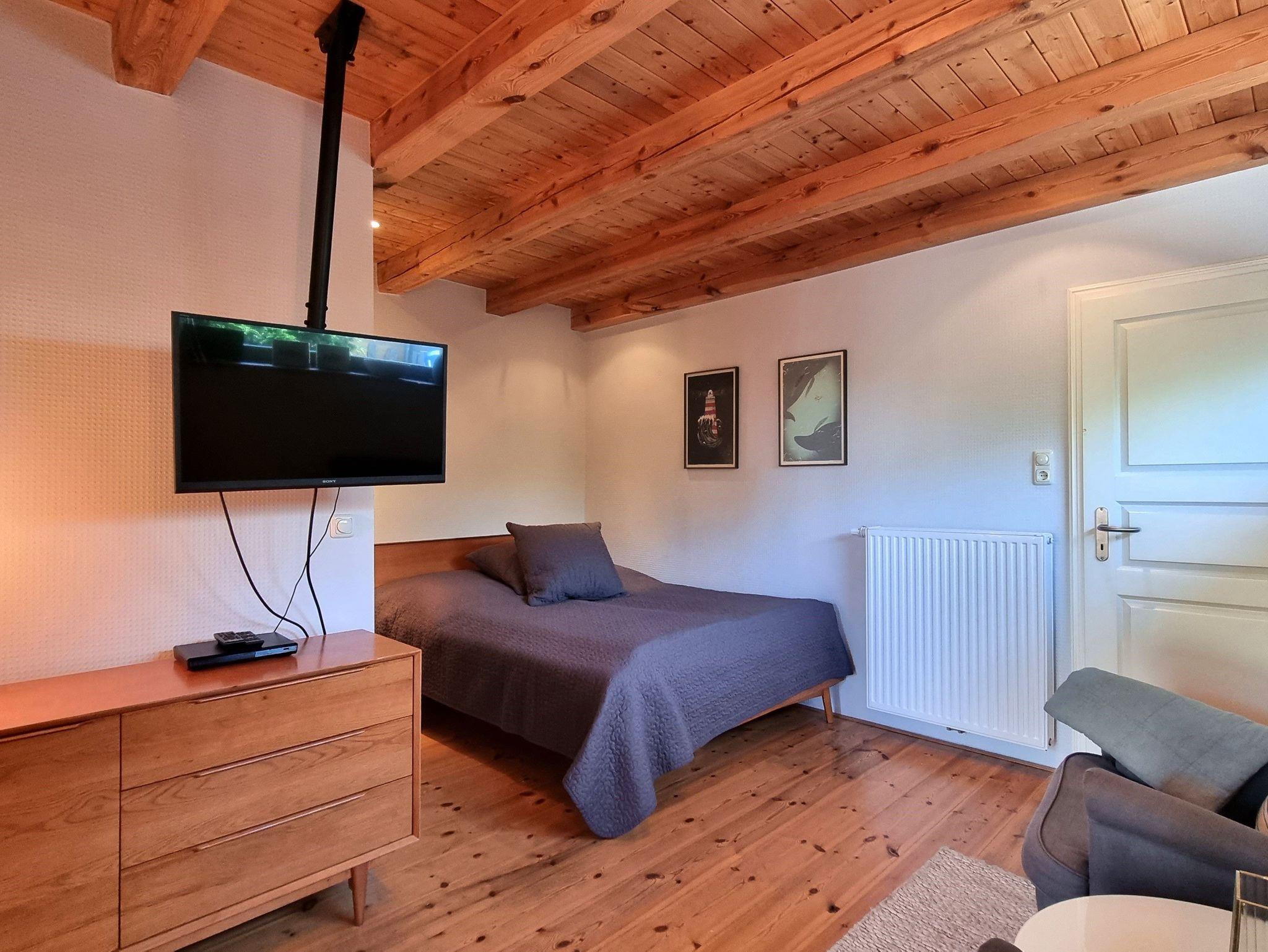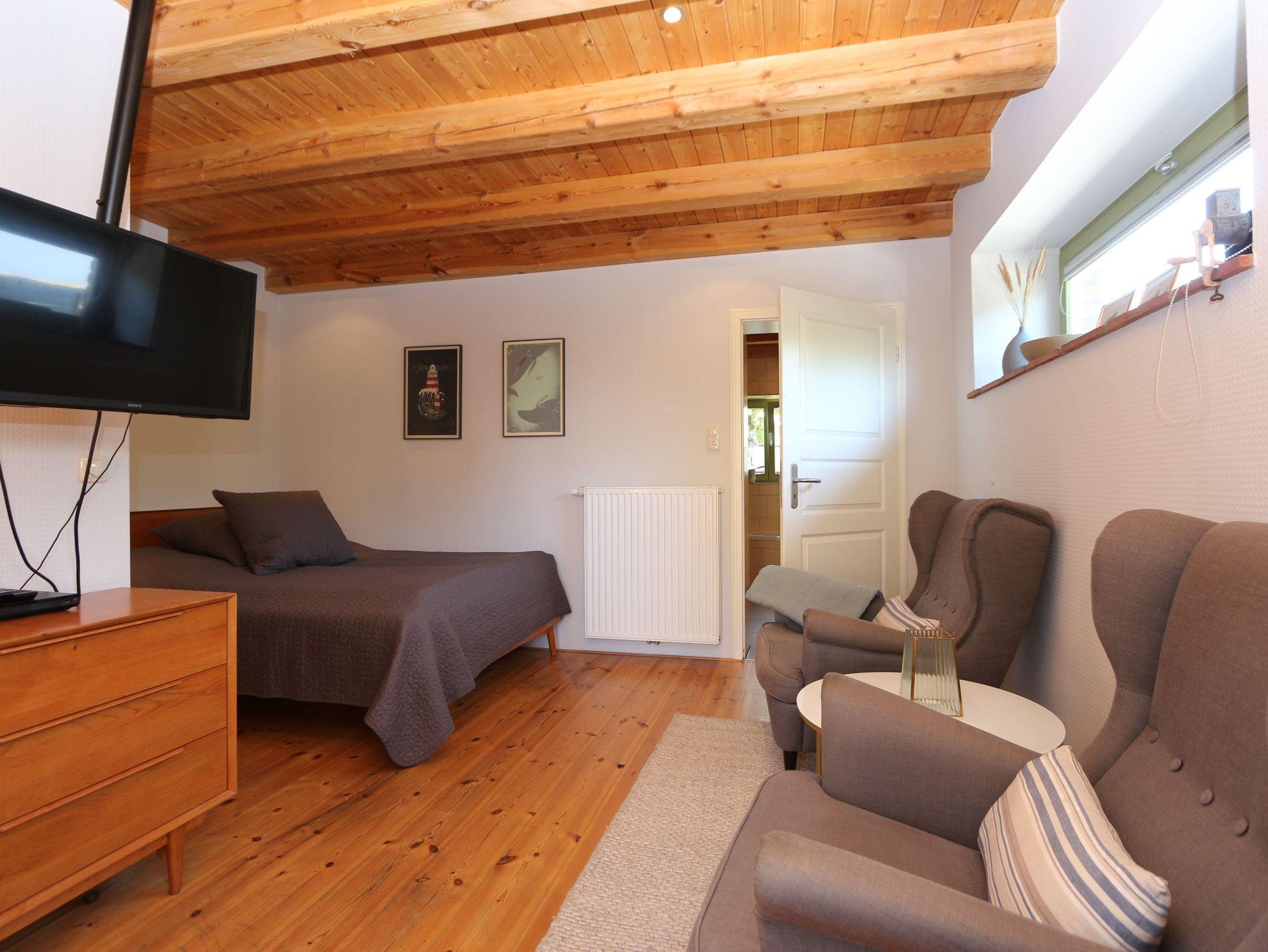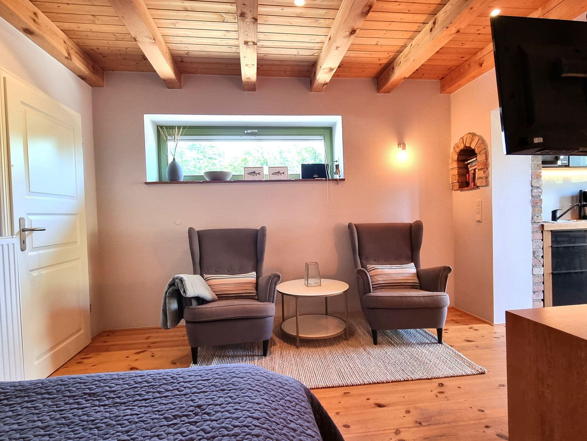 • 1 kombinierter Wohn- und Schlafraum mit einem Doppelbett (1,8 x 2,00m), zwei Sesseln und einem Flachbildfernseher