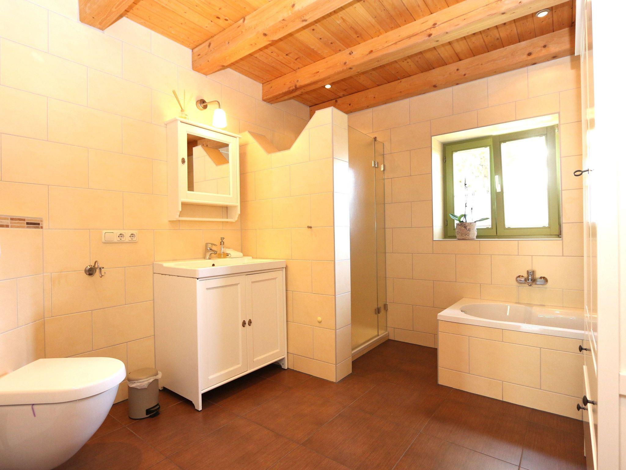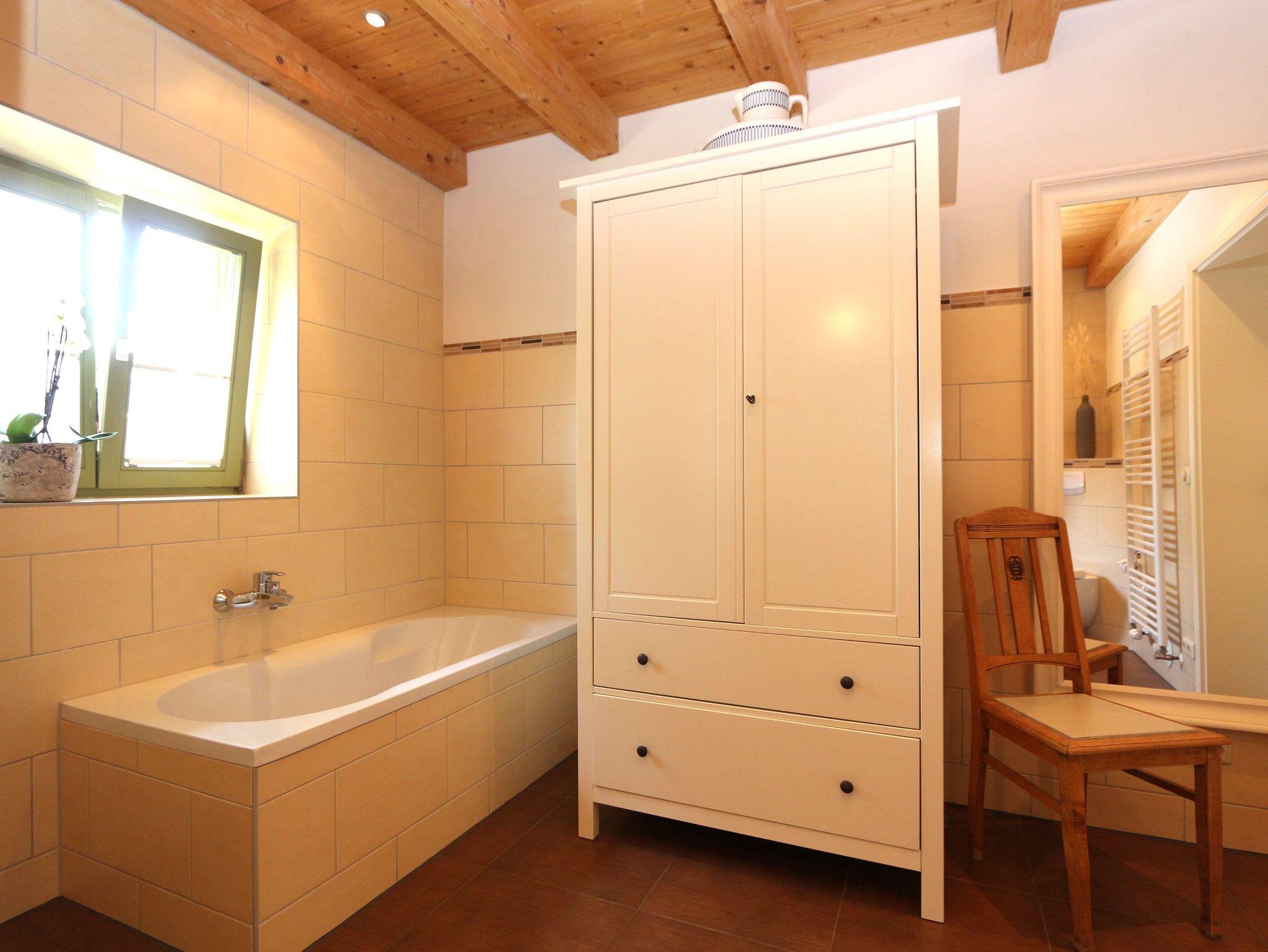 • Das Badezimmer verfügt über eine Dusche, eine Badewanne, ein Waschbecken, ein WC und einen Handtuchtrockenheizkörper