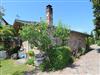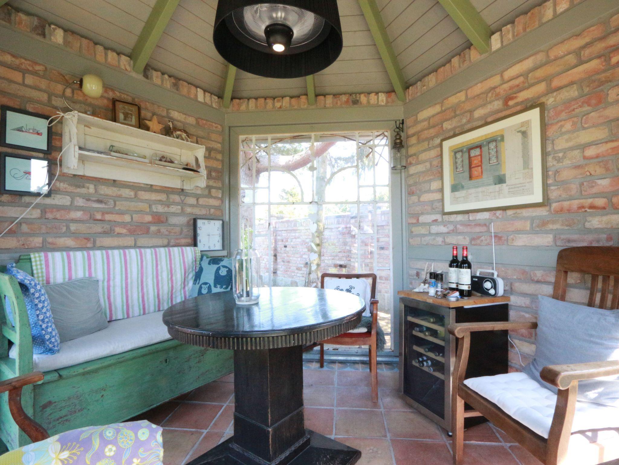 • 1 idyllische überdachter Sitzbereich (Terrasse) an der Küche mit Außenkamin, einem Tisch und Stühlen