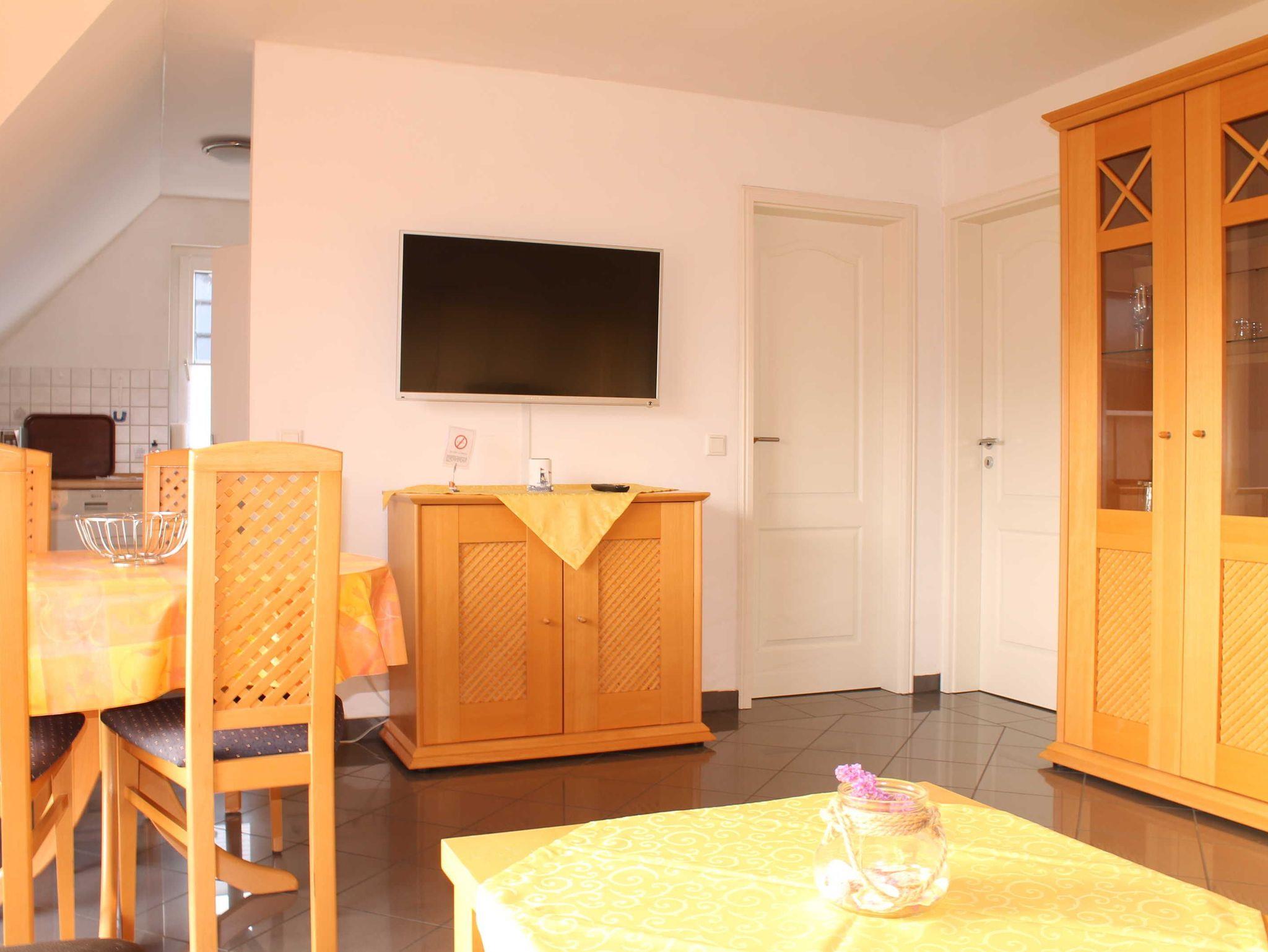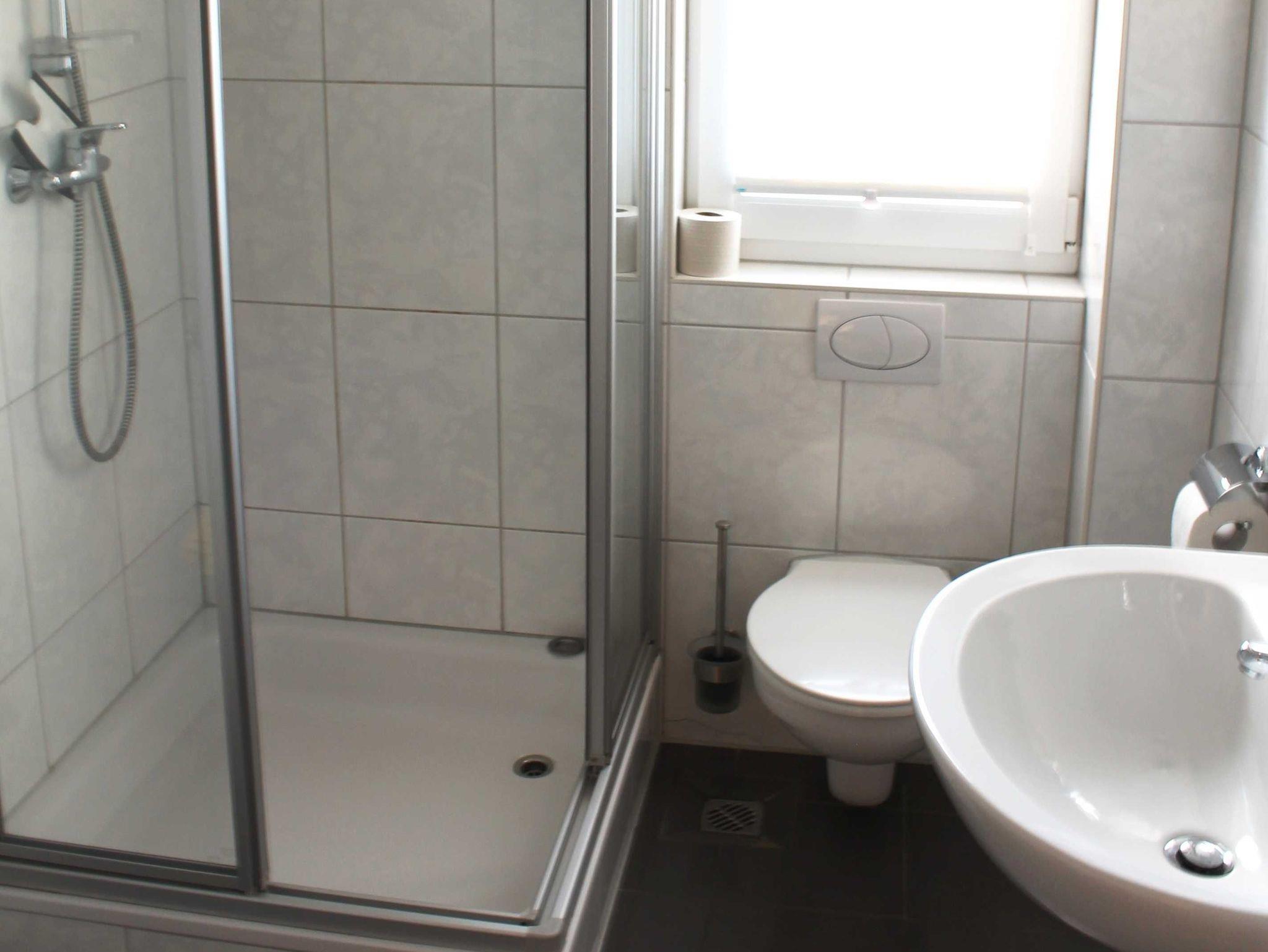 Das Badezimmer hat eine Dusche mit WC und Waschbecken, außerdem gibt es noch ein zusätzliches Gäste WC. Die Wohnung im 1 OG. ist mit Direktwahltelefon, WLAN und LED TV ausgestattet. Weiterhin verfügt die Wohnung über einen möblierten Balkon der zur Südseite gelegen ist. Die Erstausstattung Bettwäsche und Handtücher ist bereits im Preis enthalten.