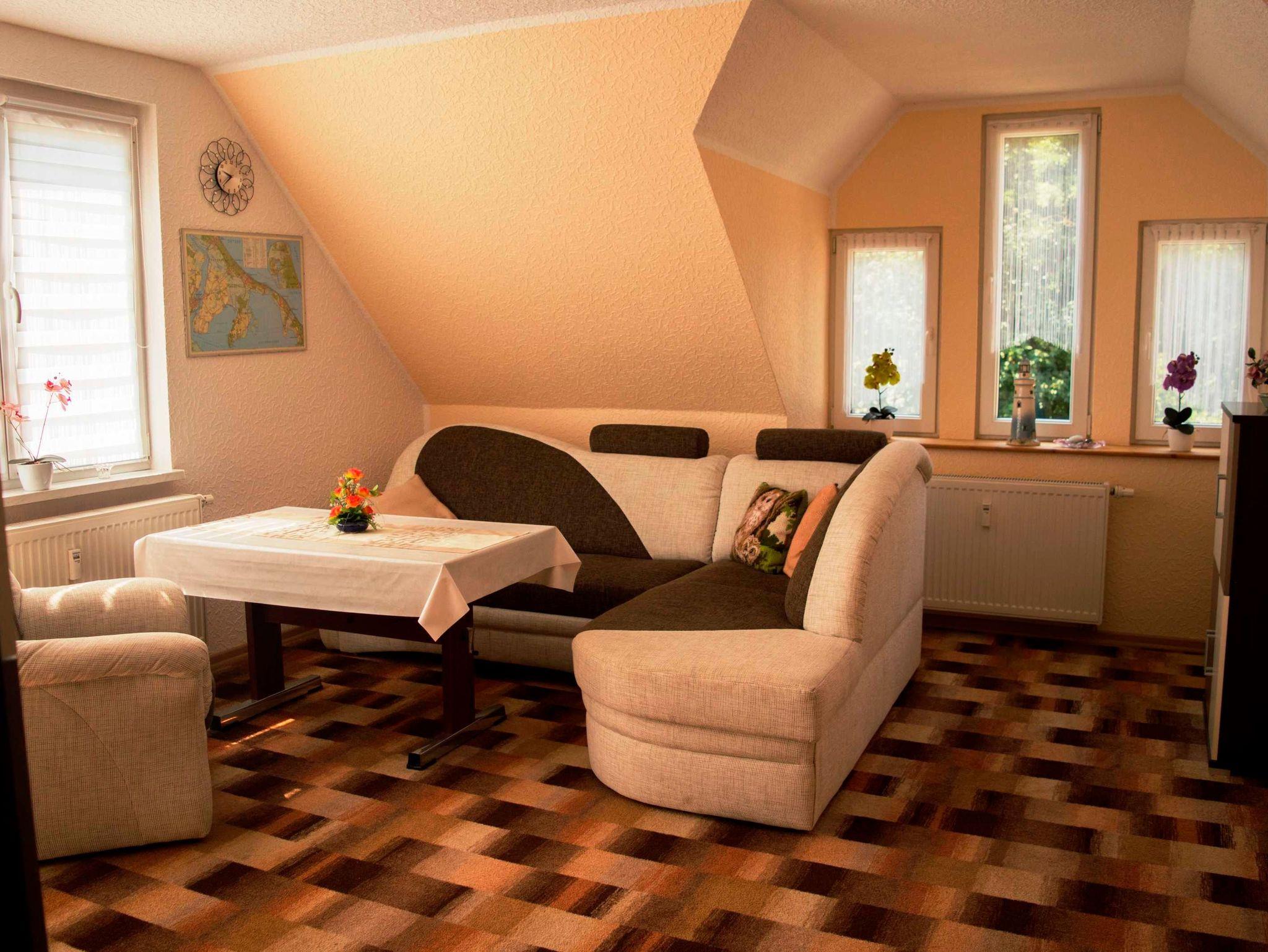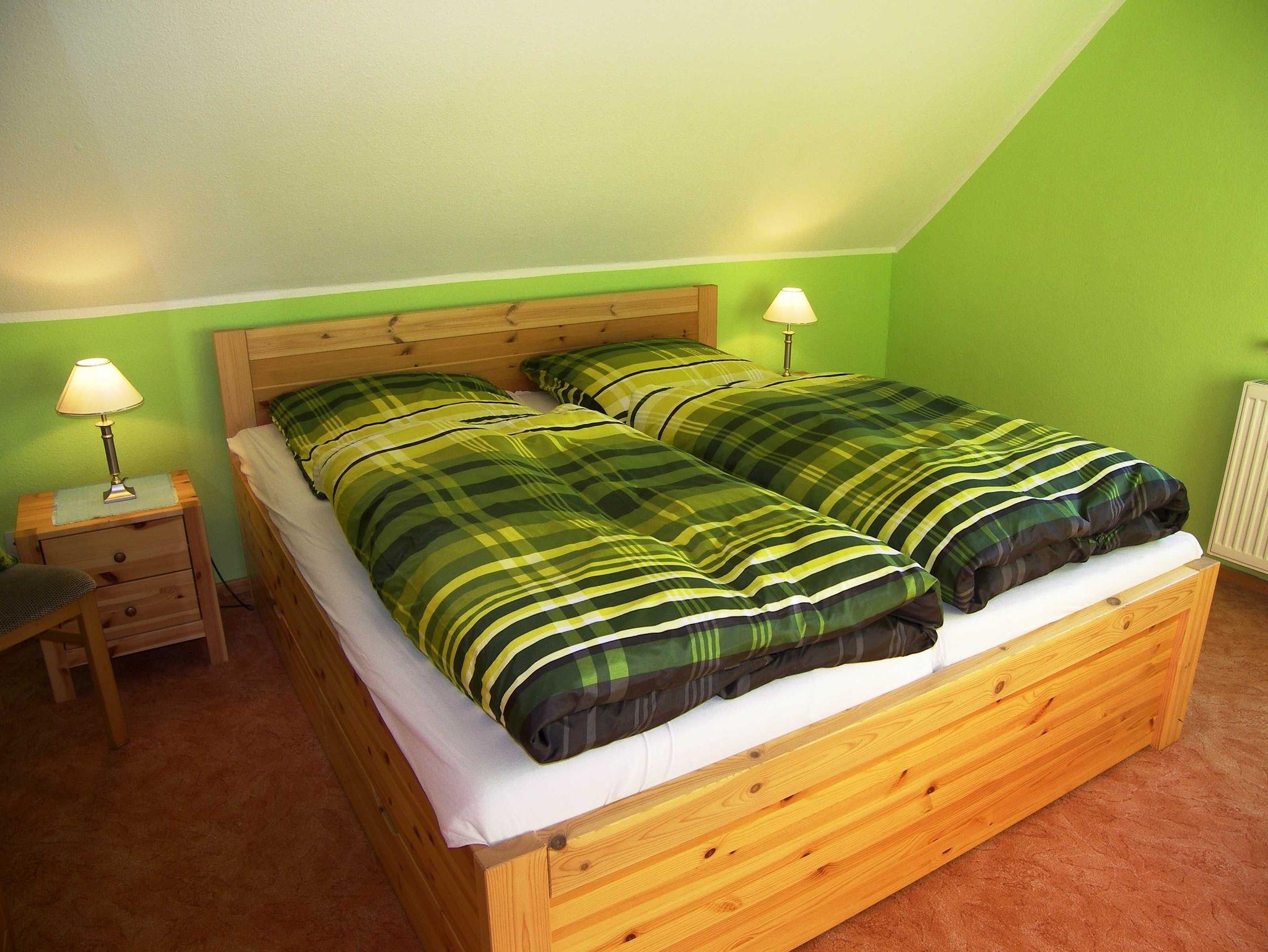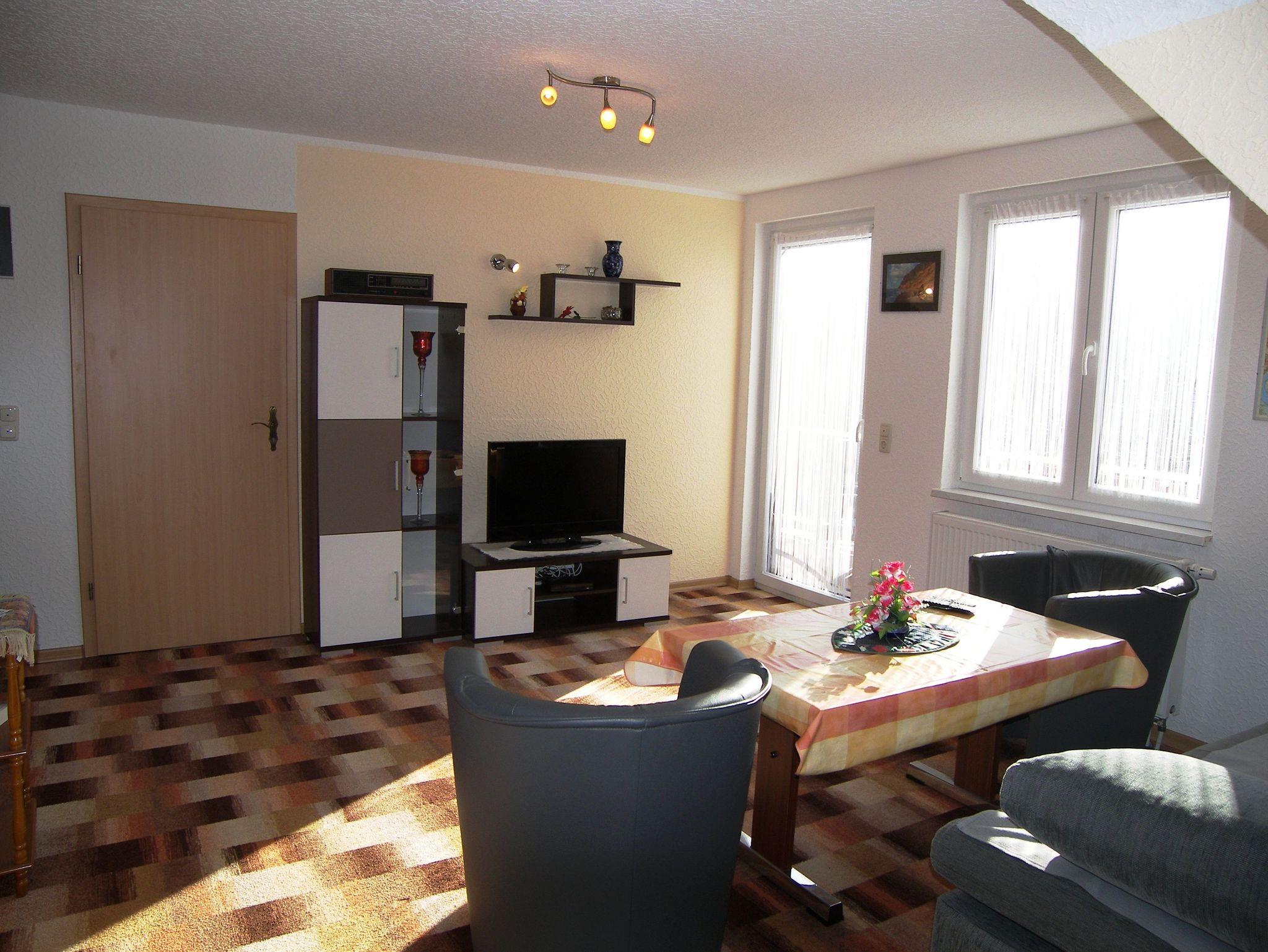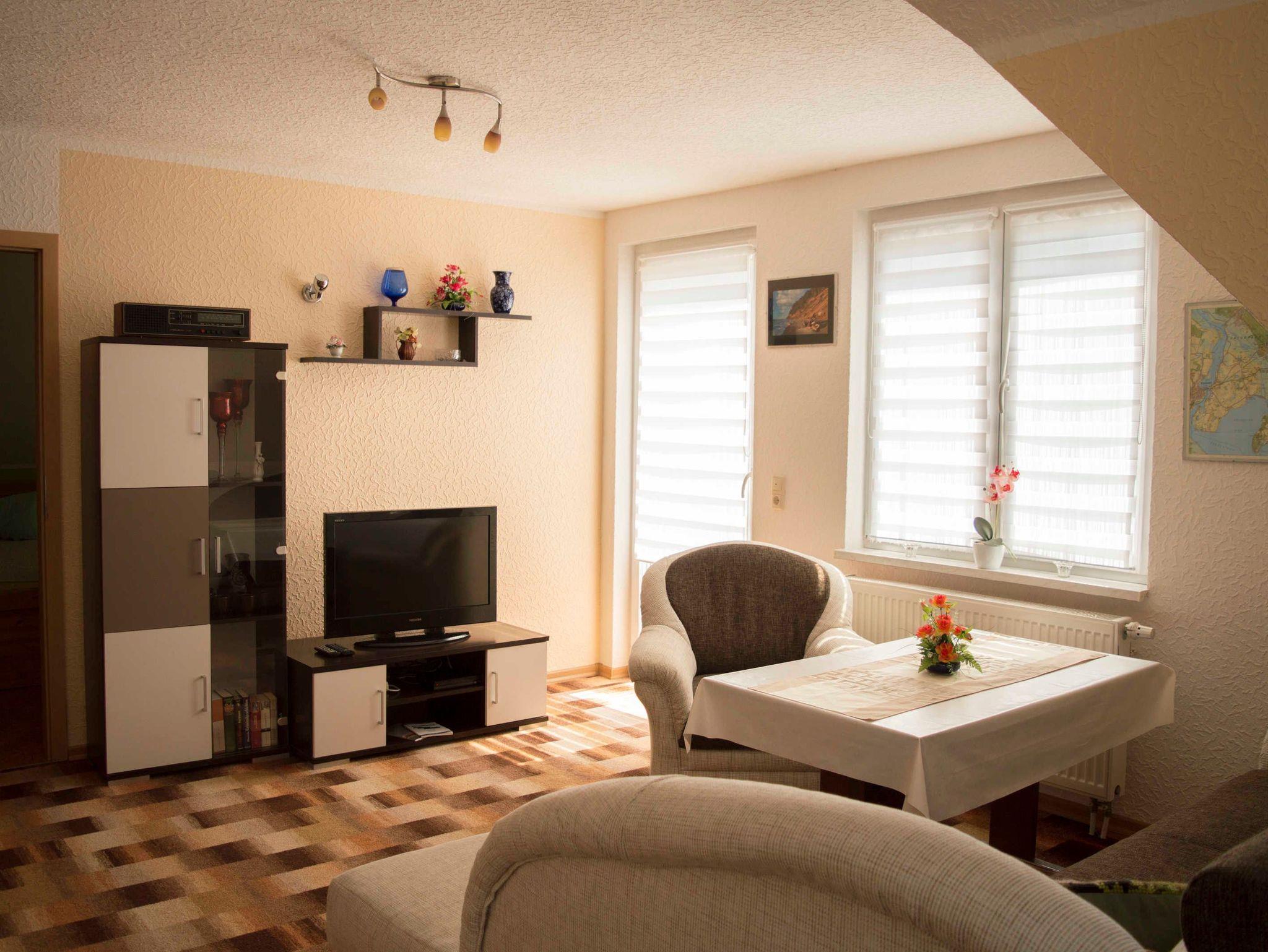 Die gemütliche Ferienwohnung ist ca. 55 m² groß und befindet sich im 1. OG. Sie verfügt über einen separaten Eingang. Das Schlafzimmer ist mit einem Doppelbett und einem Kleiderschrank ausgestattet. Für die 3. Person kann eine bequeme Schlafcouch (160 x 200) im Wohnzimmer genutzt werden. Das gemütlich eingerichtete Wohnzimmer ist mit einem großen Fernseher und Radio ausgestattet. Der große (10m²), möbelierte Balkon zur Südseite mit Wiesenblick lädt zum Verweilen ein. Grillen auf dem Balkon ist möglich.