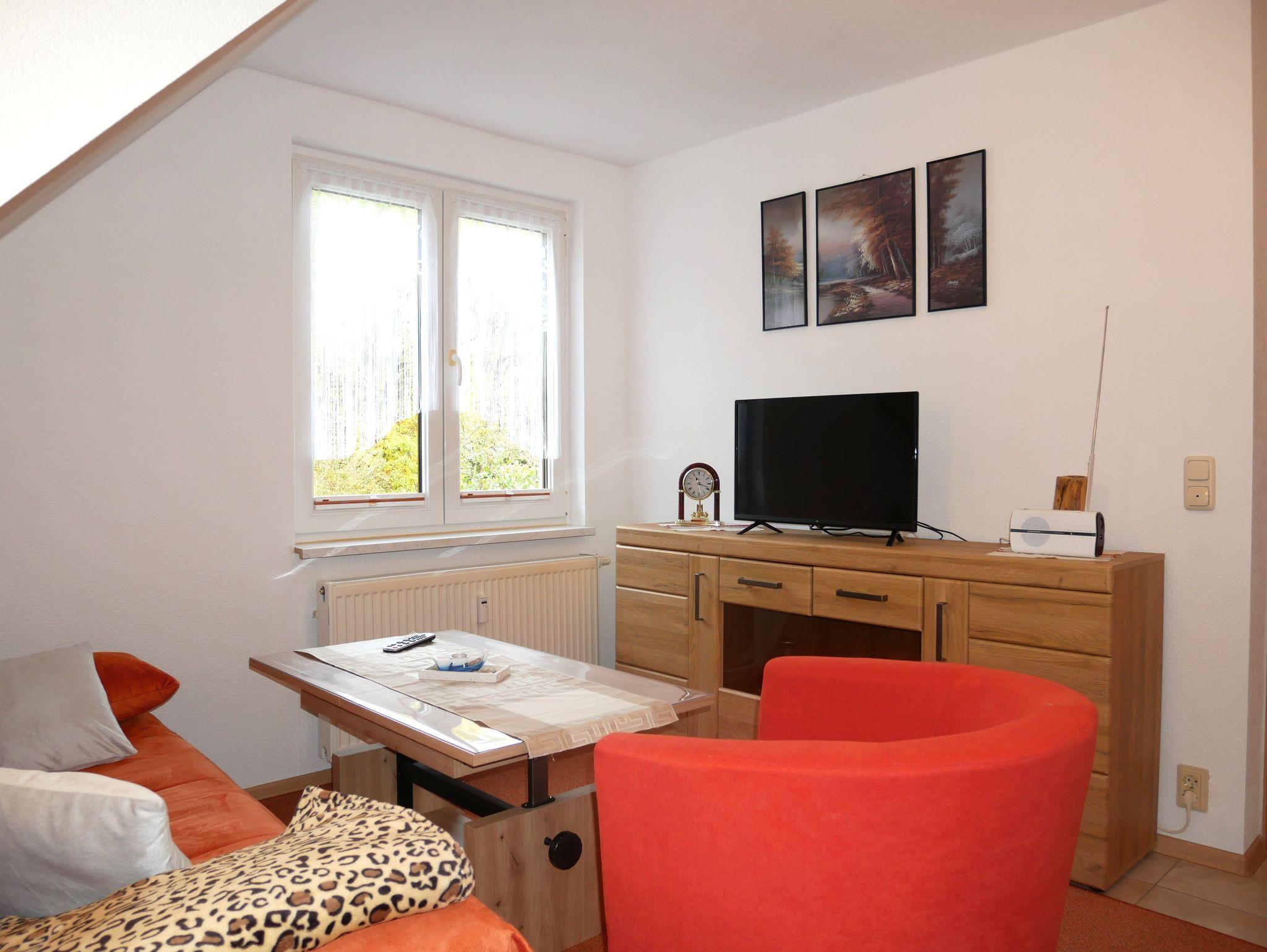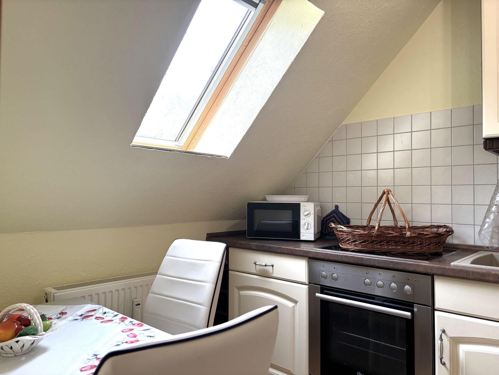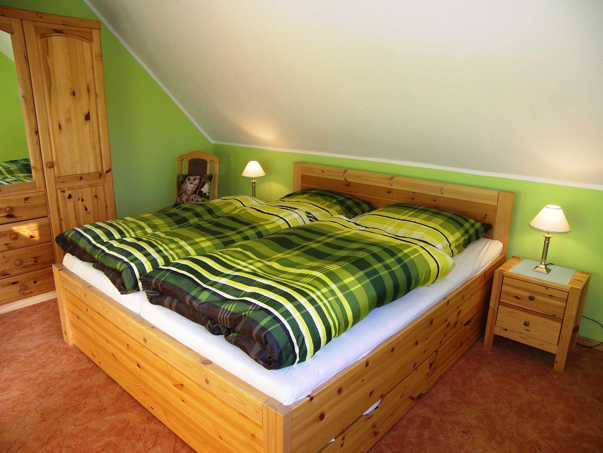 Die gemütliche Ferienwohnung ist ca. 55 m² groß und befindet sich im 1. OG. Sie verfügt über einen separaten Eingang. Das Schlafzimmer ist mit einem Doppelbett und einem Kleiderschrank ausgestattet. Für die 3. Person kann eine bequeme Schlafcouch (160 x 200) im Wohnzimmer genutzt werden. Das gemütlich eingerichtete Wohnzimmer ist mit einem großen Fernseher und Radio ausgestattet. Der große (10m²), möbelierte Balkon zur Südseite mit Wiesenblick lädt zum Verweilen ein. Grillen auf dem Balkon ist möglich.