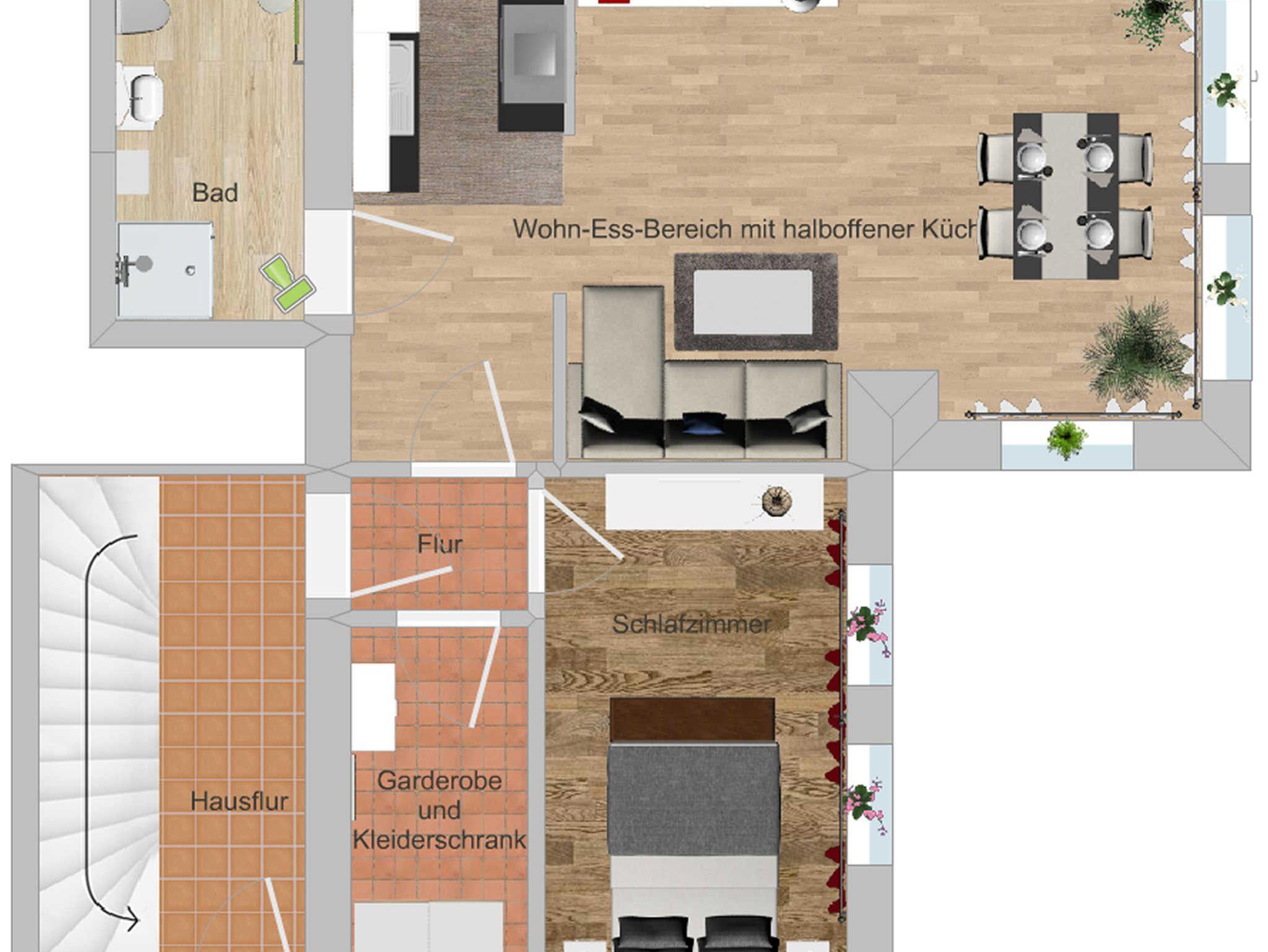 Die seniorengerechte Wohnung verfügt über ein Schlafzimmer mit Boxspringbett (1,60 x 2,00 m), ein Ankleidezimmer mit Garderobe, ein Tageslichtbad mit ebenerdiger Dusche, einen Wohnraum mit einer gemütlichen Couch und großem LED-TV sowie einen großzügigen Essplatz für 4 Personen.