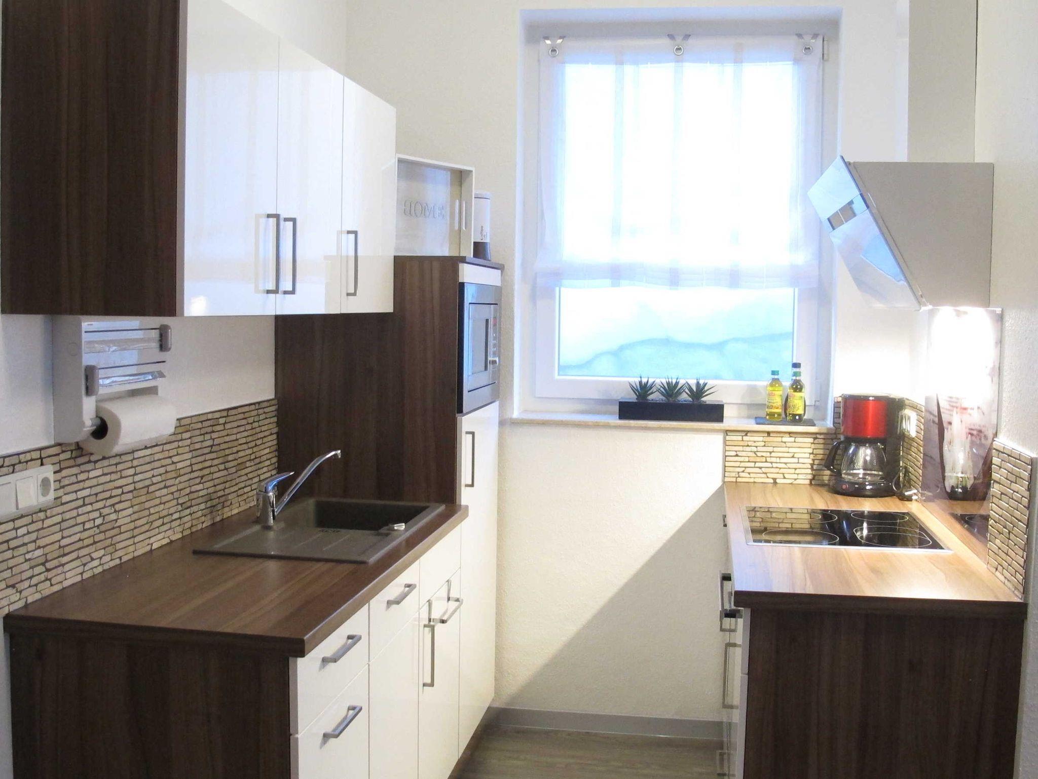 Die halboffene Küche schließt sich dem Wohnraum an und lässt keine Wünsche offen. Sie ist ausgestattet mit einem Heißluft-Backofen und 4 Platten-Ceranfeld, Einbau-Mikrowelle, Geschirrspüler, Kühlschrank mit Gefrierfach u.v.m.