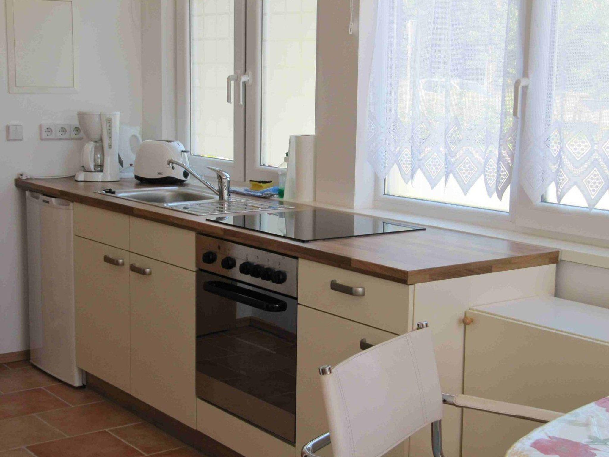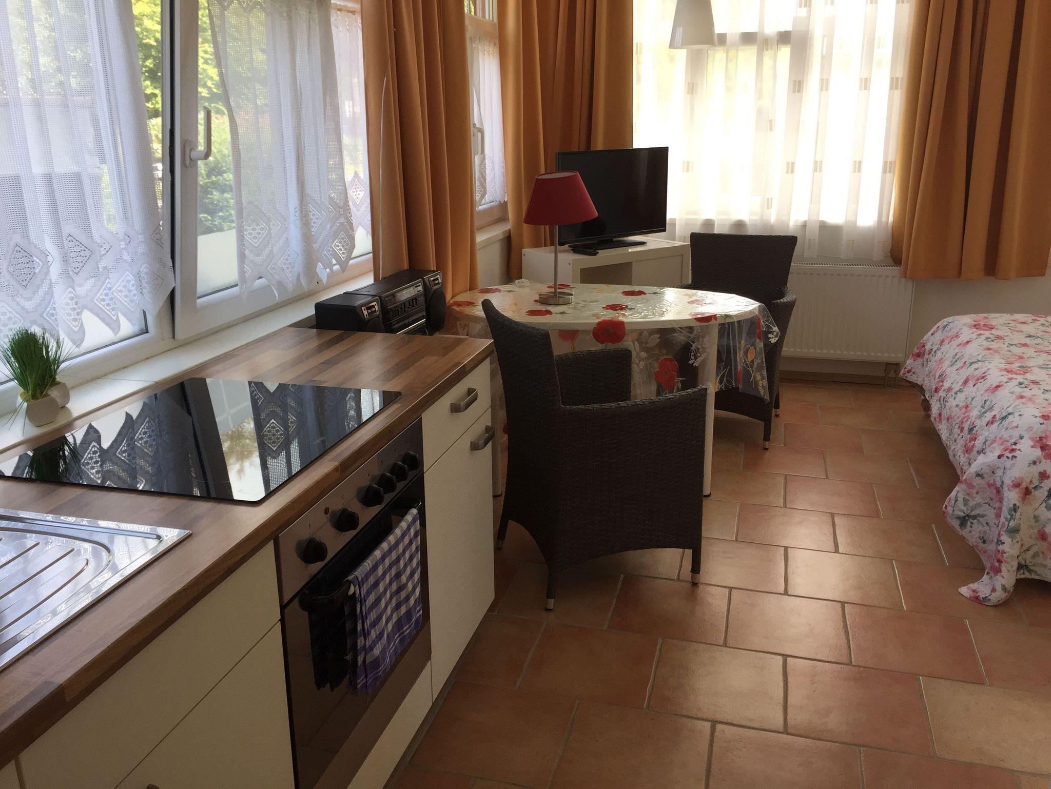 Das 1-Raum-Appartement „Perle“ bestehend aus einem gemütlichen und hellem Wohn ? Essraum mit einer Schlafcouch (1,60m), einem Esstisch und einer modernen Küchenzeile mit Backofen, Kühlschrank mit Ge, Spülmaschine, Kaffeemaschine und Wasserkocher.