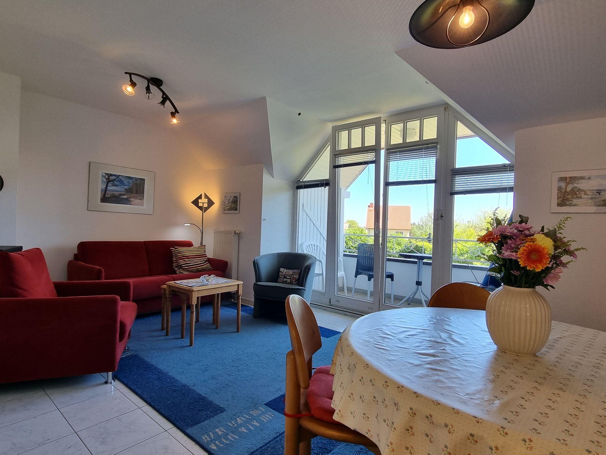 Ferienwohnung für 2-4 Personen inkl. Kleinkind (ca. 44 m²) im Dachgeschoss mit Wohn- und Esszimmer, Schlafzimmer, offener Küche, Bad und Balkon.