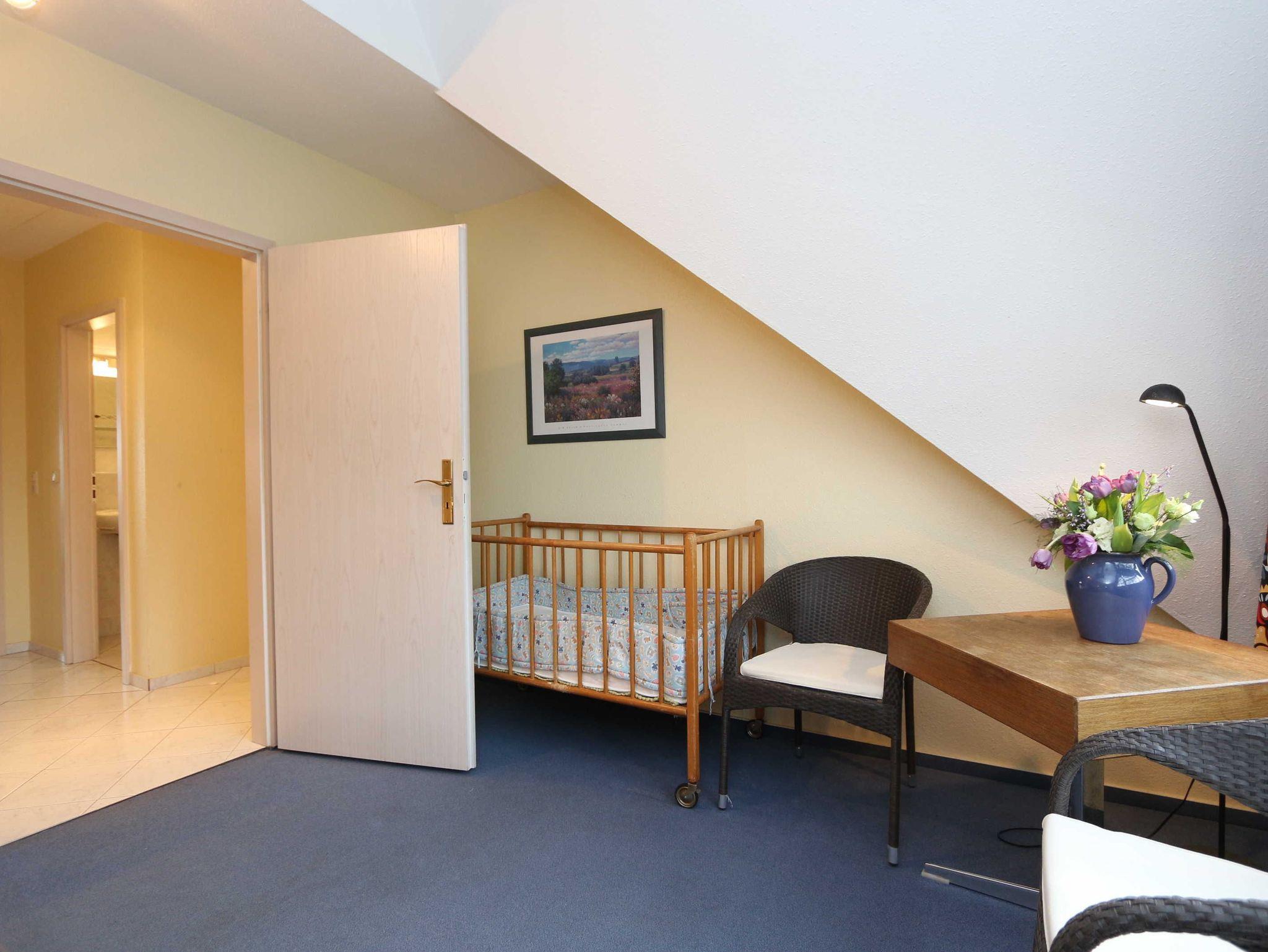 • Das Schlafzimmer ist mit einerm Doppelbett (1,60 x 2,00m), einem Kleiderschrank, einem Kinderbett (0,6 x 1,20m) und einer Sitzecke ausgestattet. Hier liegt Teppichfußboden aus.