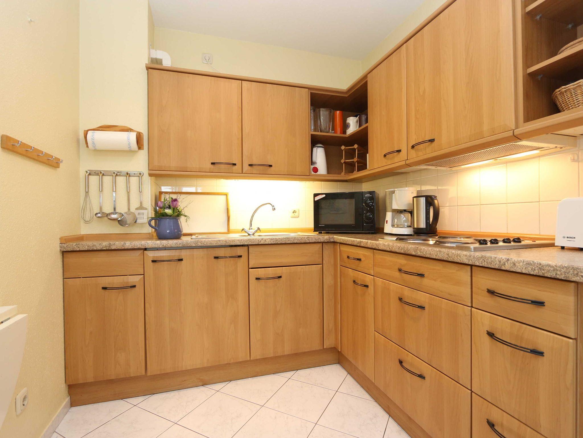 • Die Küche ist offen zum Wohnzimmer und mit allem Nötigen ausgestattet, u.a. Mikrowelle, Kaffeemaschine, Wasserkocher, Toaster, Kühlschrank, kleines Gefrierfach und ein Herd. Es ist kein Backofen vorhanden.