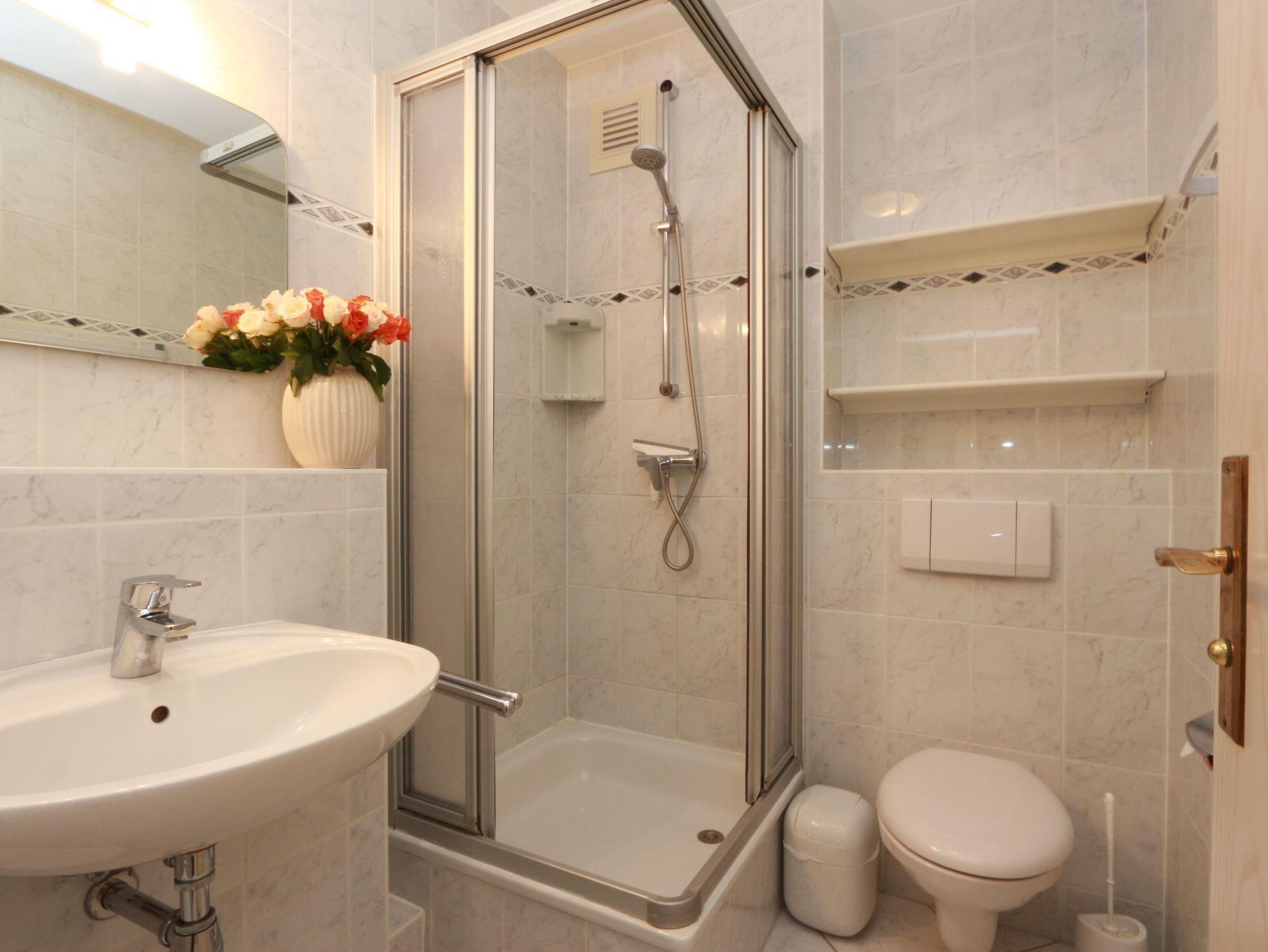 • Das Badezimmer verfügt über eine Dusche mit WC, Waschbecken, Fön und einem Handtuchtrockenheizkörper.
