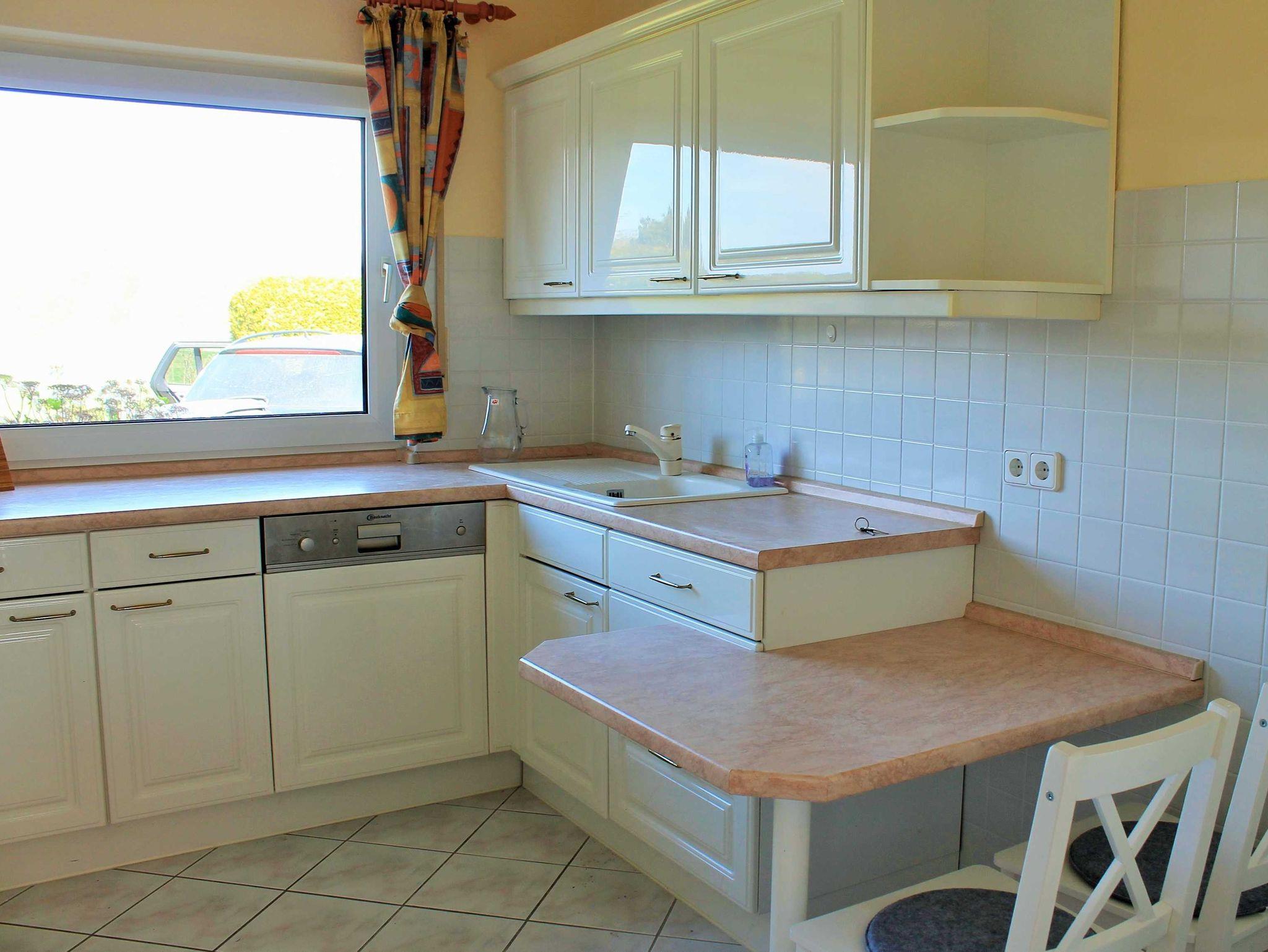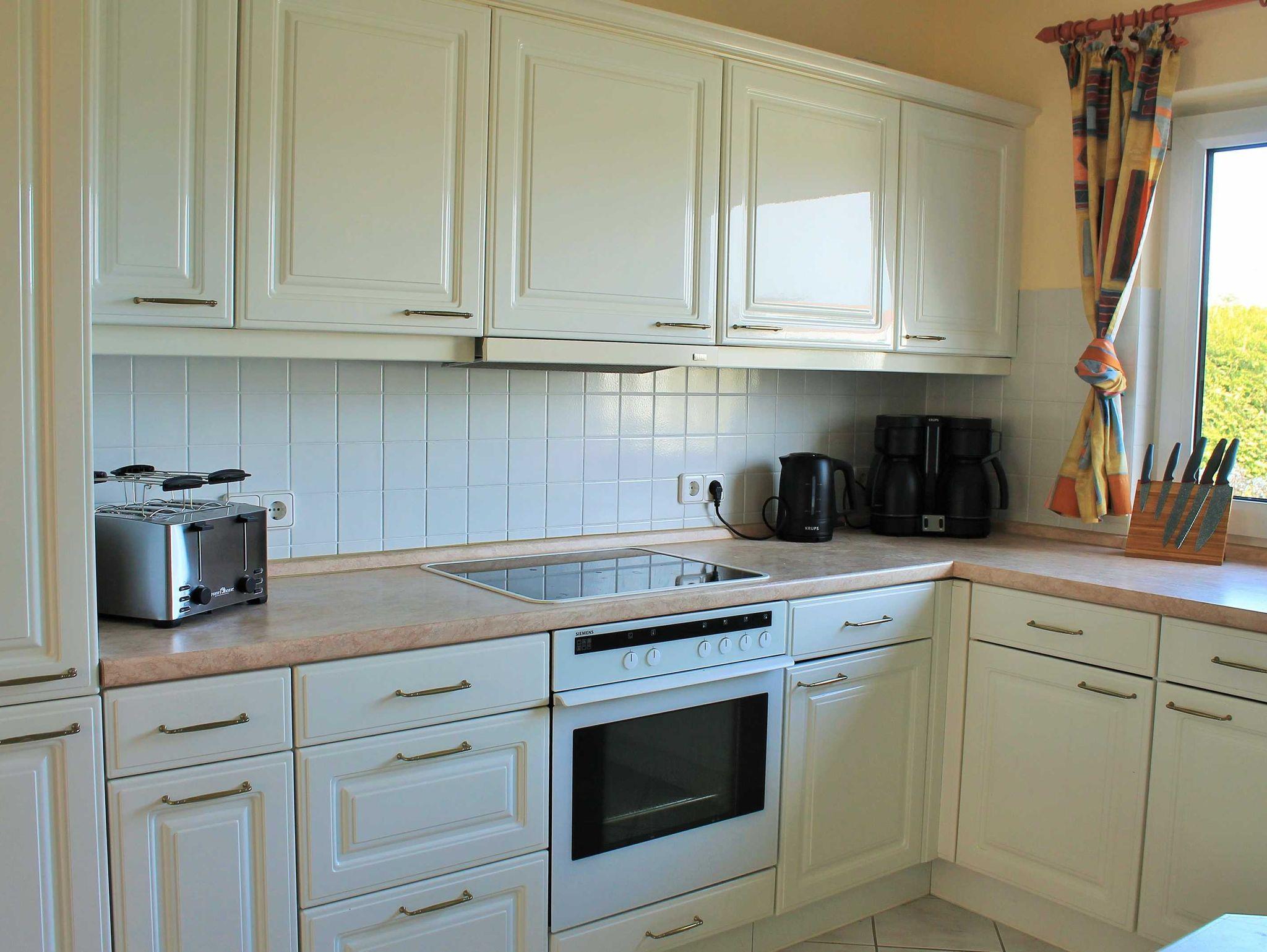 ausgestattete Küche mit Geschirrspüler, Herd, Backofen, Mikrowelle,