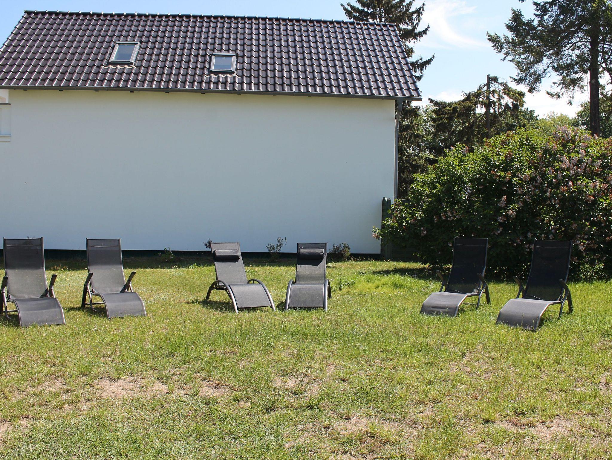 Zur großen Ferienwohnung gehört eine Außenterrasse mit Tischen, Stühlen und einem Sonnenschirm. Darüber hinaus stehen Ihnen Sonnenliegen auf der Wiese zur Verfügung.