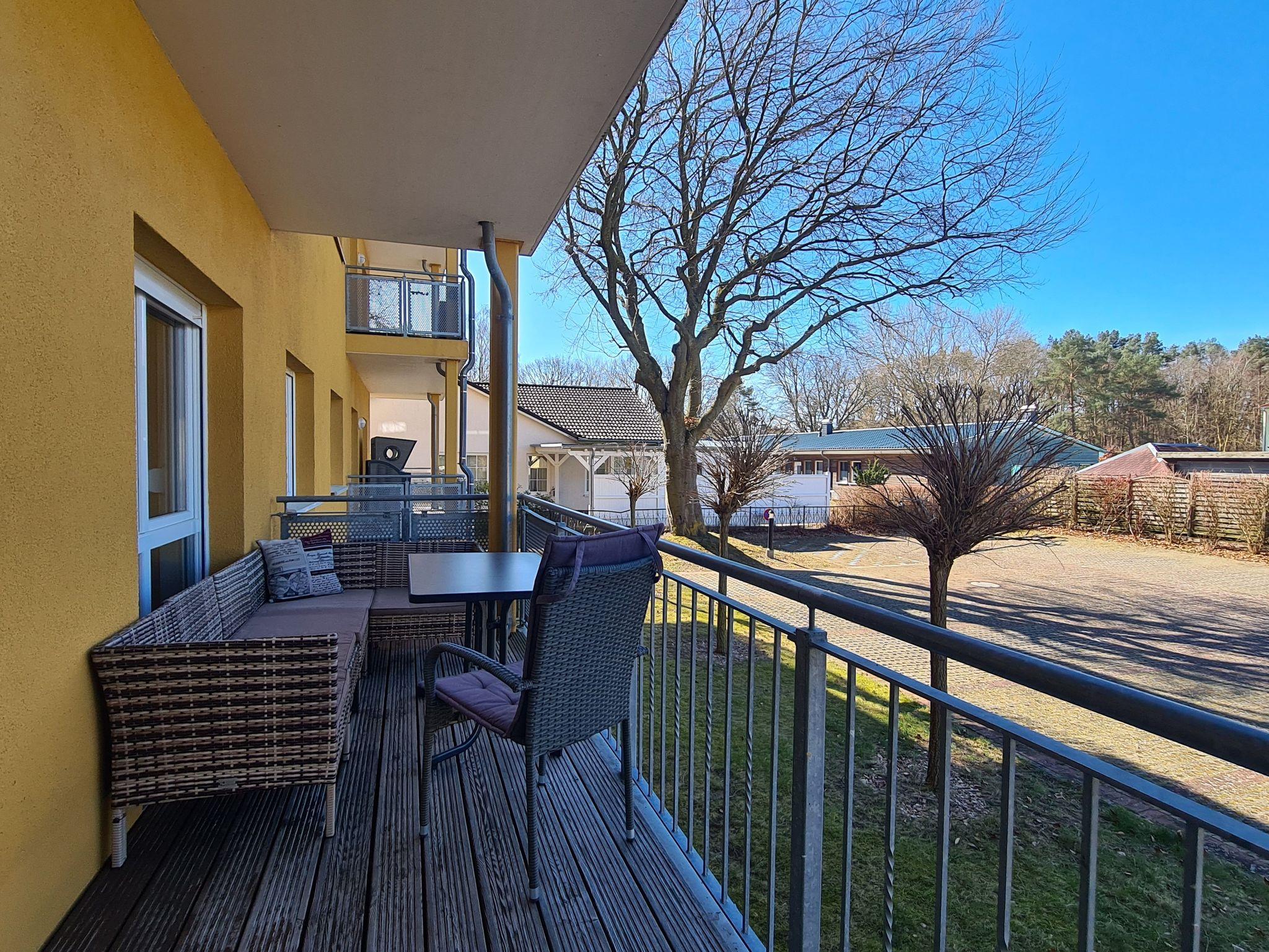 1 Balkon mit Möbeln und Strandkorb