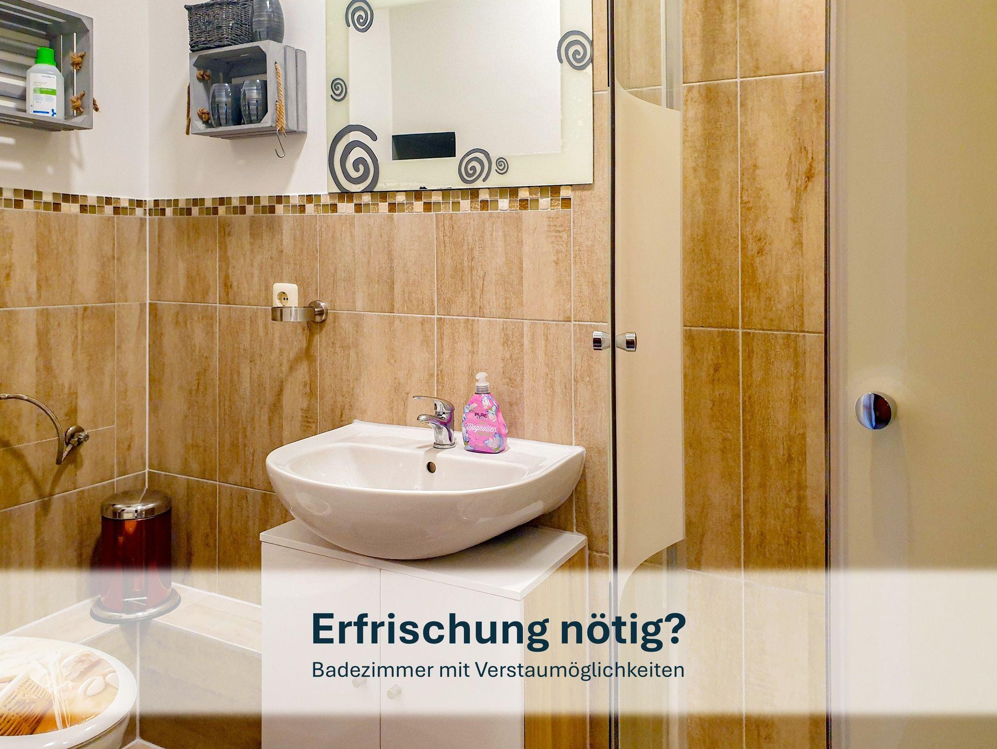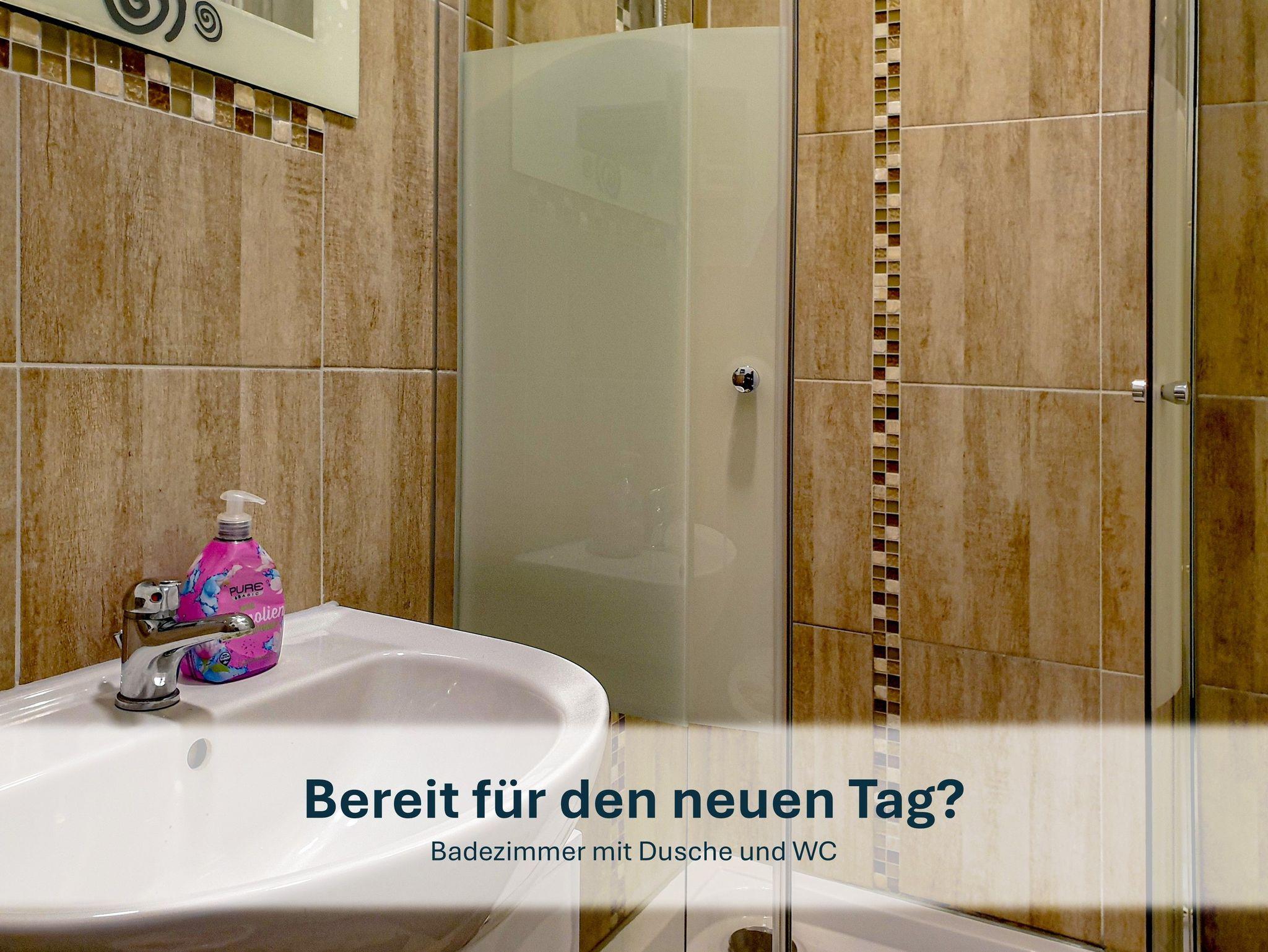 Das Badezimmer mit Dusche und WC bietet den idealen Ort, um sich frisch zu machen und den Tag zu starten oder ausklingen zu lassen.