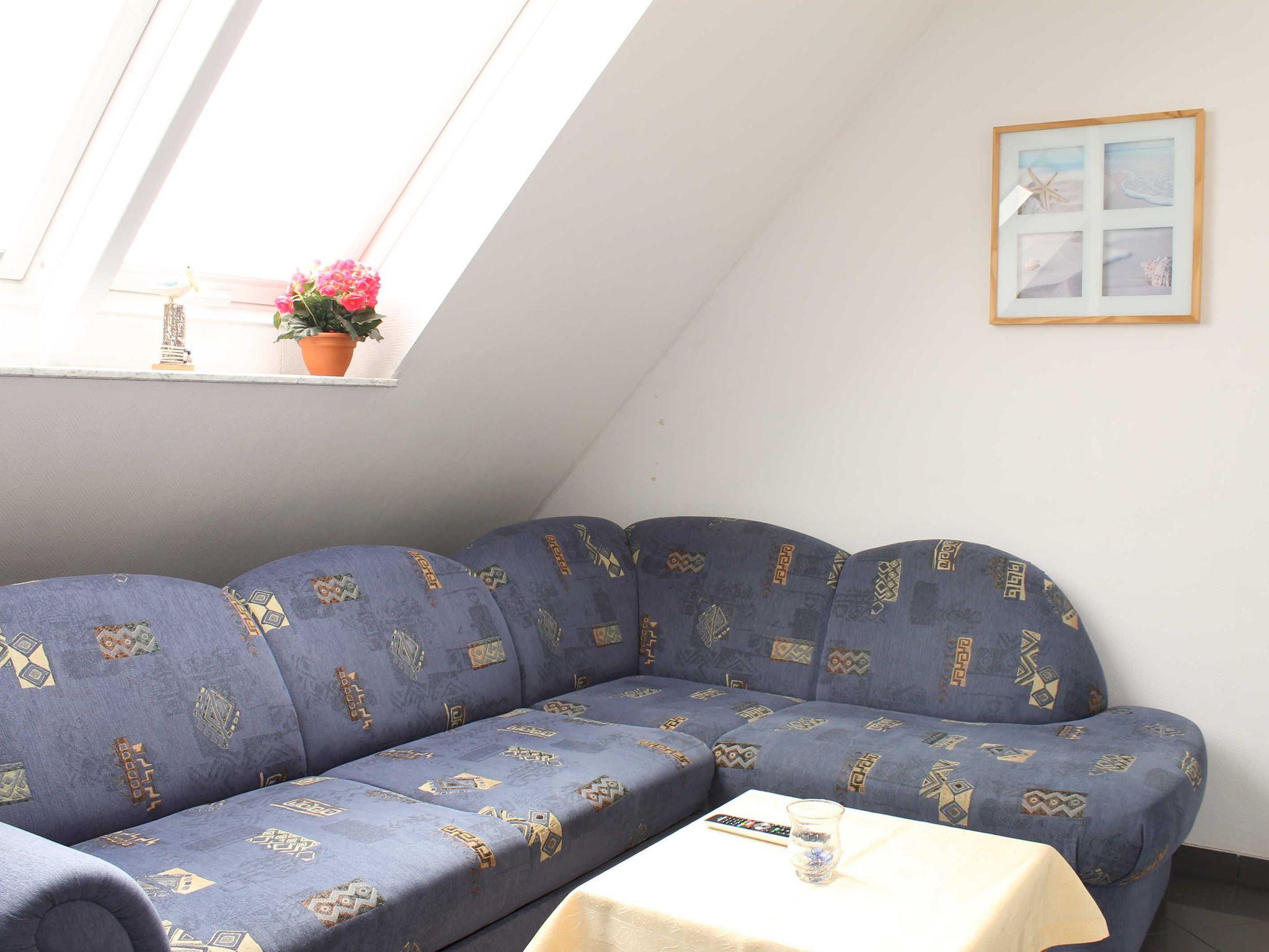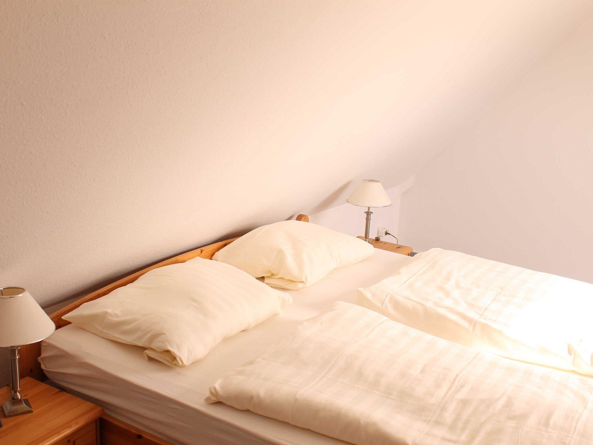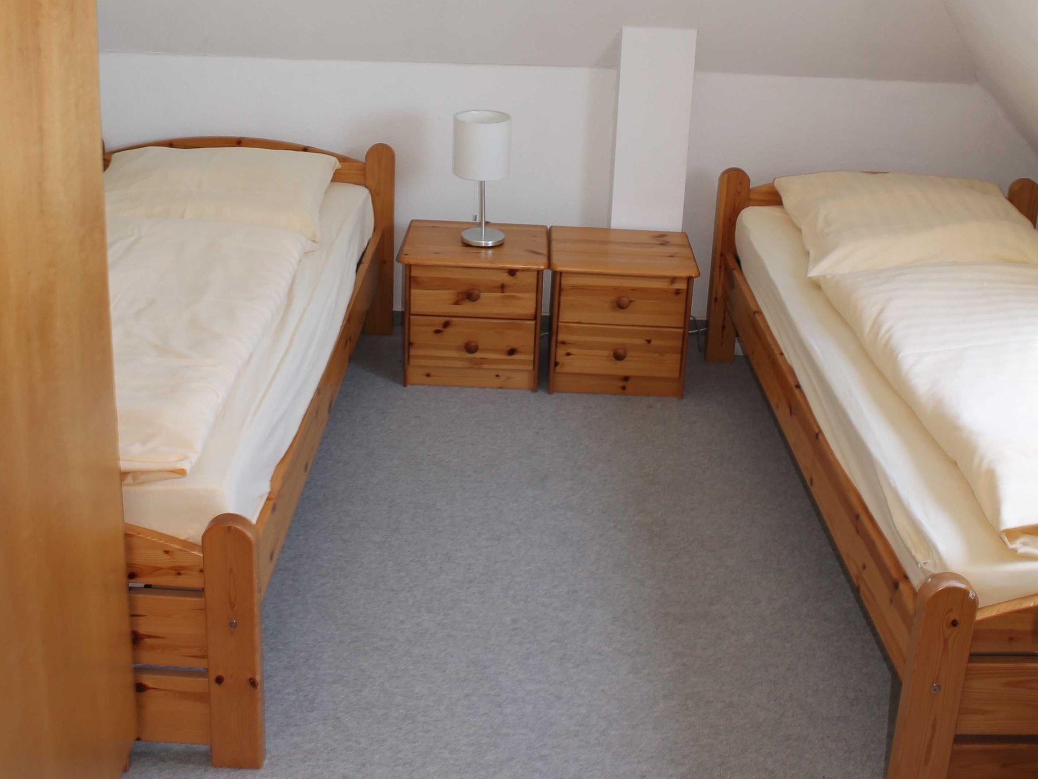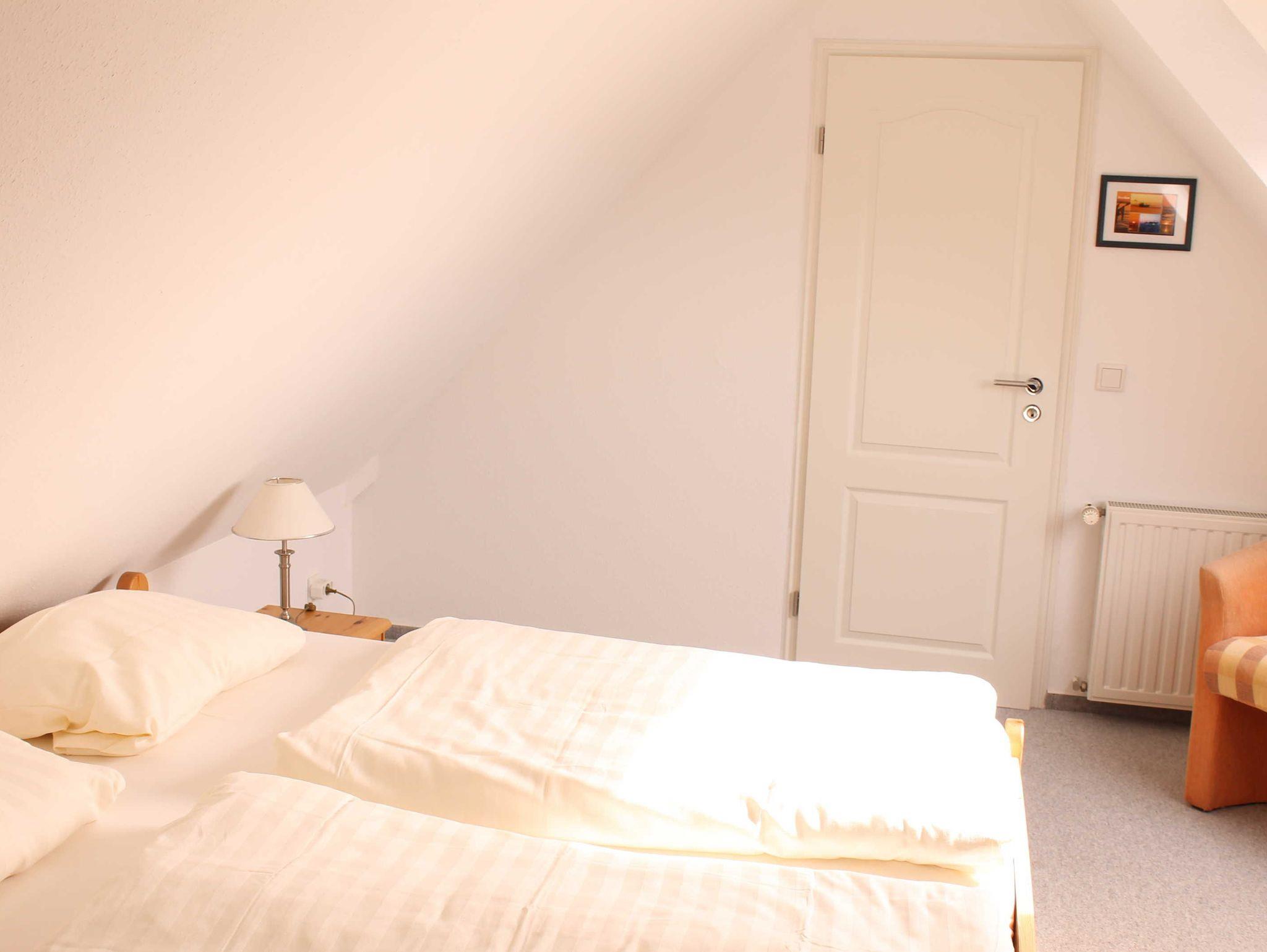 Sie wohnen in einer 45 qm großen 3-Raum Komfort-Dachgeschoß-Wohnung für 4 Personen. Der helle Wohnbereich hat eine komfortable Wohnlandschaft mit Essbereich. Die angrenzende, offene Küchenzeile ist ausgestattet mit einen 2 Platten Kochfeld, Kühlschrank, Spülmaschine und Kaffeemaschine. Über eine Raumspartreppe (steile, gewendelte Treppe, nicht geeignet für Ältere & Kleinkinder) erreichen Sie die beiden Schlafräume. Ein Schlafraum verfügt über ein Doppelbett mit Kleiderschrank, das andere Schlafzimmer hat 2 Einzelbetten und einen Kleiderschrank. Das Bad verfügt über eine Dusche, Waschbecken und WC. Die Dachgeschosswohnung ist mit Direktwahltelefon, WLAN und LED TV ausgestattet. Auf dem Grundstück steht den Gästen eine Terrasse zur Verfügung. Die Erstausstattung Bettwäsche und Handtücher ist bereits inklusive.