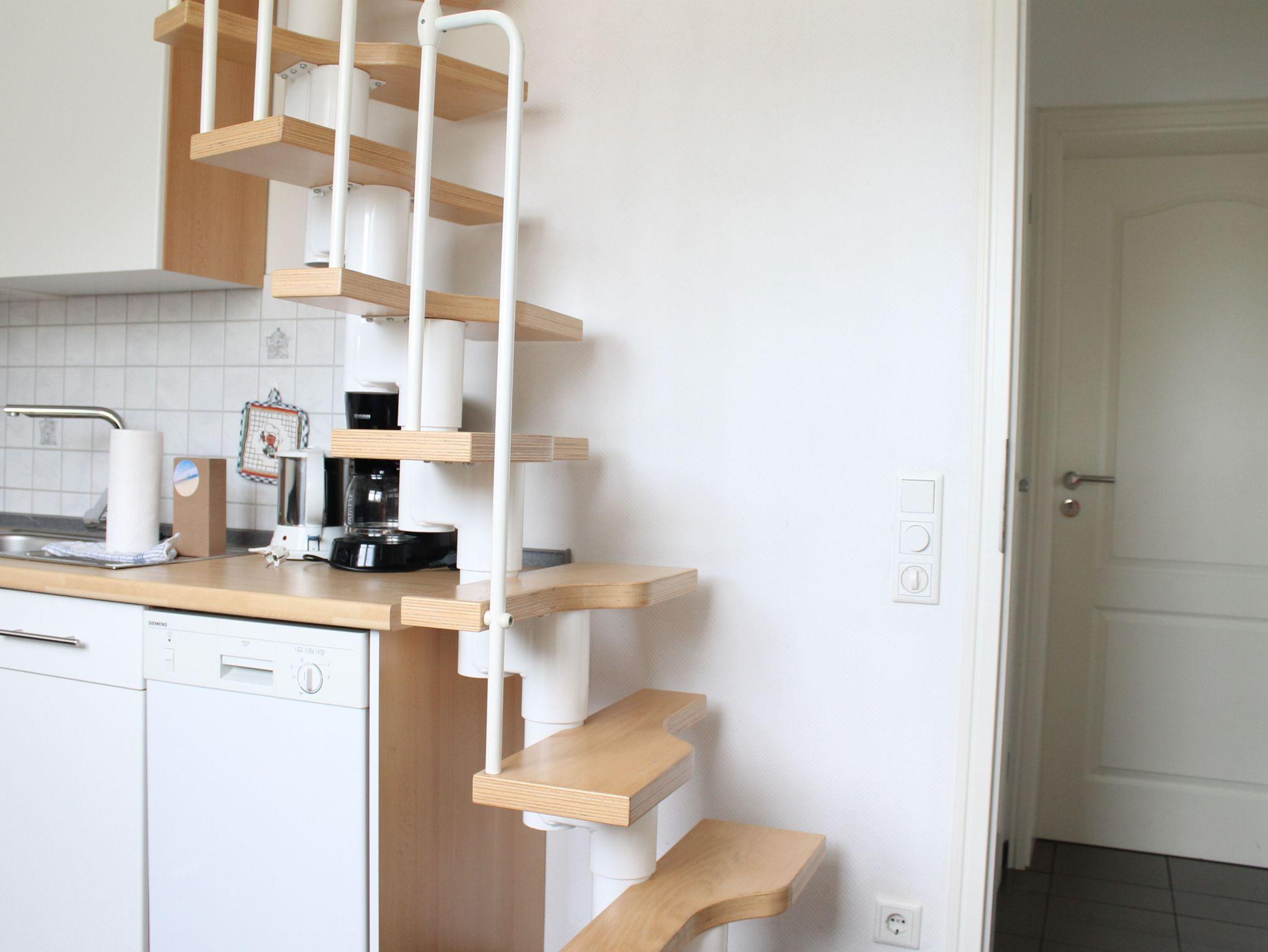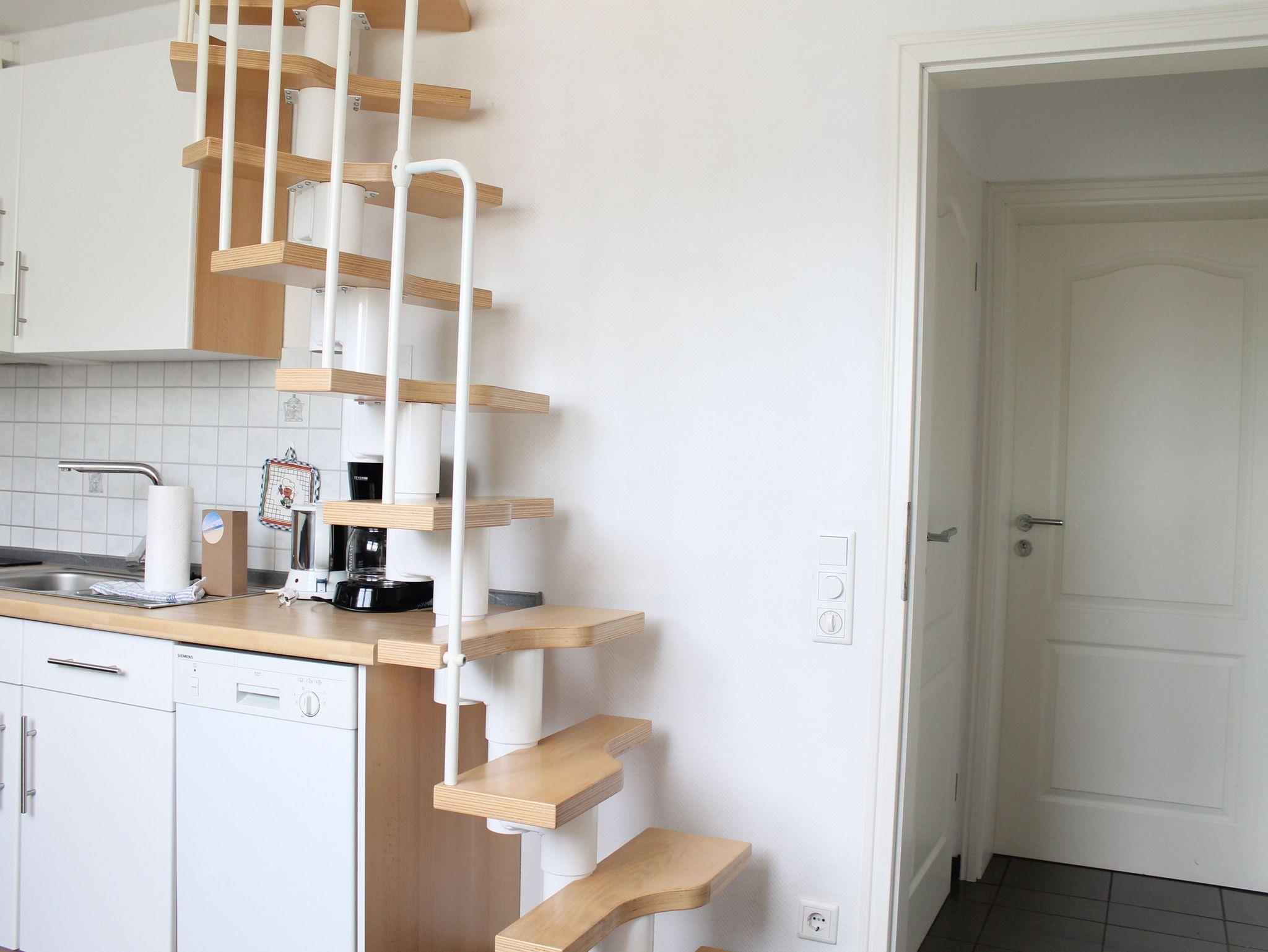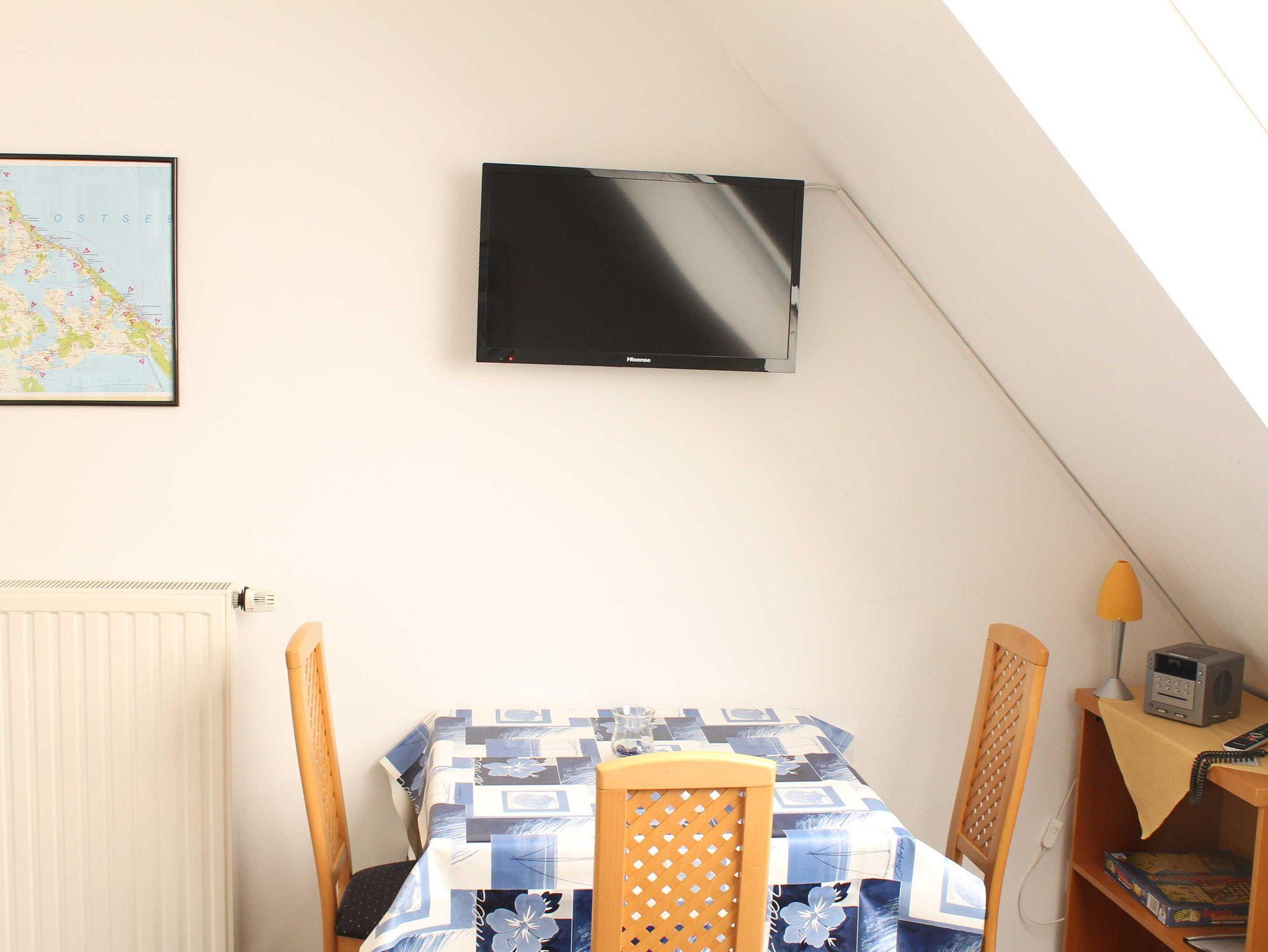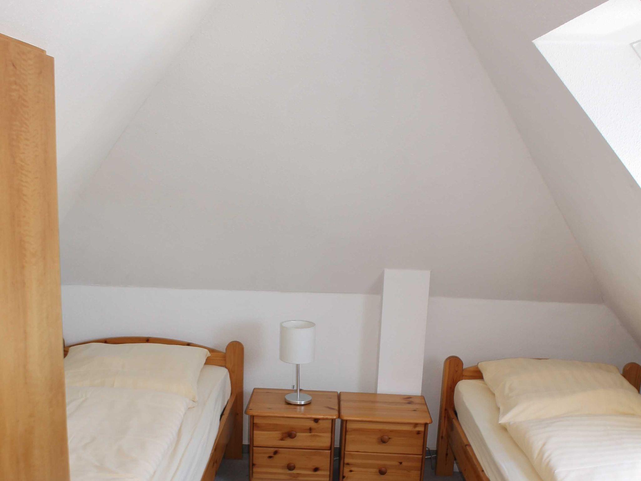 Sie wohnen in einer 45 qm großen 3-Raum Komfort-Dachgeschoß-Wohnung für 4 Personen. Der helle Wohnbereich hat eine komfortable Wohnlandschaft mit Essbereich. Die angrenzende, offene Küchenzeile ist ausgestattet mit einen 2 Platten Kochfeld, Kühlschrank, Spülmaschine und Kaffeemaschine. Über eine Raumspartreppe (steile, gewendelte Treppe, nicht geeignet für Ältere & Kleinkinder) erreichen Sie die beiden Schlafräume. Ein Schlafraum verfügt über ein Doppelbett mit Kleiderschrank, das andere Schlafzimmer hat 2 Einzelbetten und einen Kleiderschrank. Das Bad verfügt über eine Dusche, Waschbecken und WC. Die Dachgeschosswohnung ist mit Direktwahltelefon, WLAN und LED TV ausgestattet. Auf dem Grundstück steht den Gästen eine Terrasse zur Verfügung. Die Erstausstattung Bettwäsche und Handtücher ist bereits inklusive.
