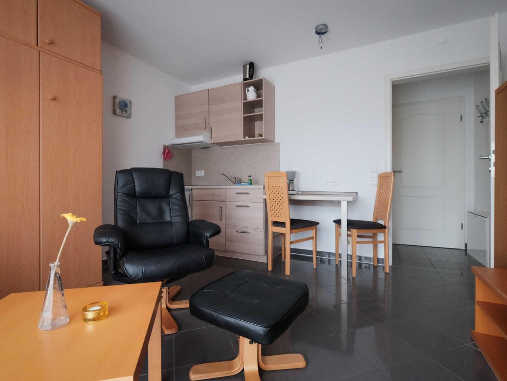 Das exklusiv eingerichtete Erdgeschossappartement ist ca. 25 m² (einschließlich Terrasse) groß und besteht aus einem kombinierten Wohn/Schlafraum (Schrankbett), kompletter Miniküche (Pantryküche mit Cerankochfeld sowie Kühlschrank), Bad mit Dusche und WC, sowie einer Terrasse. Fliesenfußboden, sowie Fußbodenheizung im Wohnraum und Bad, Die zur Südseite gelegene gepflasterte Terrasse ist mit Gartenmöbeln und Sonnenschirm ausgestattet. Grill kann zur Verfügung gestellt werden. Der Terrassenbereich ist aus dem Wohnbereich zugänglich. Die Erstaustattung Bettwäsche sowie 1 Geschirrtuch sind inklusive. Handtücher können entweder mitgebracht oder vor Ort gegen Gebühr ausgeliehen werden (bitte beim Schlüsselverwalter Herrn Käding vorbestellen). Den Gästen stehtkostenfrei ein DSL-Internetzugang über W-LAN zur Nutzung zur Verfügung (keine zugesicherte Eigenschaft falls mal der Router ausfällt). Haustiere sind nicht erlaubt, Nichtraucherwohnung.