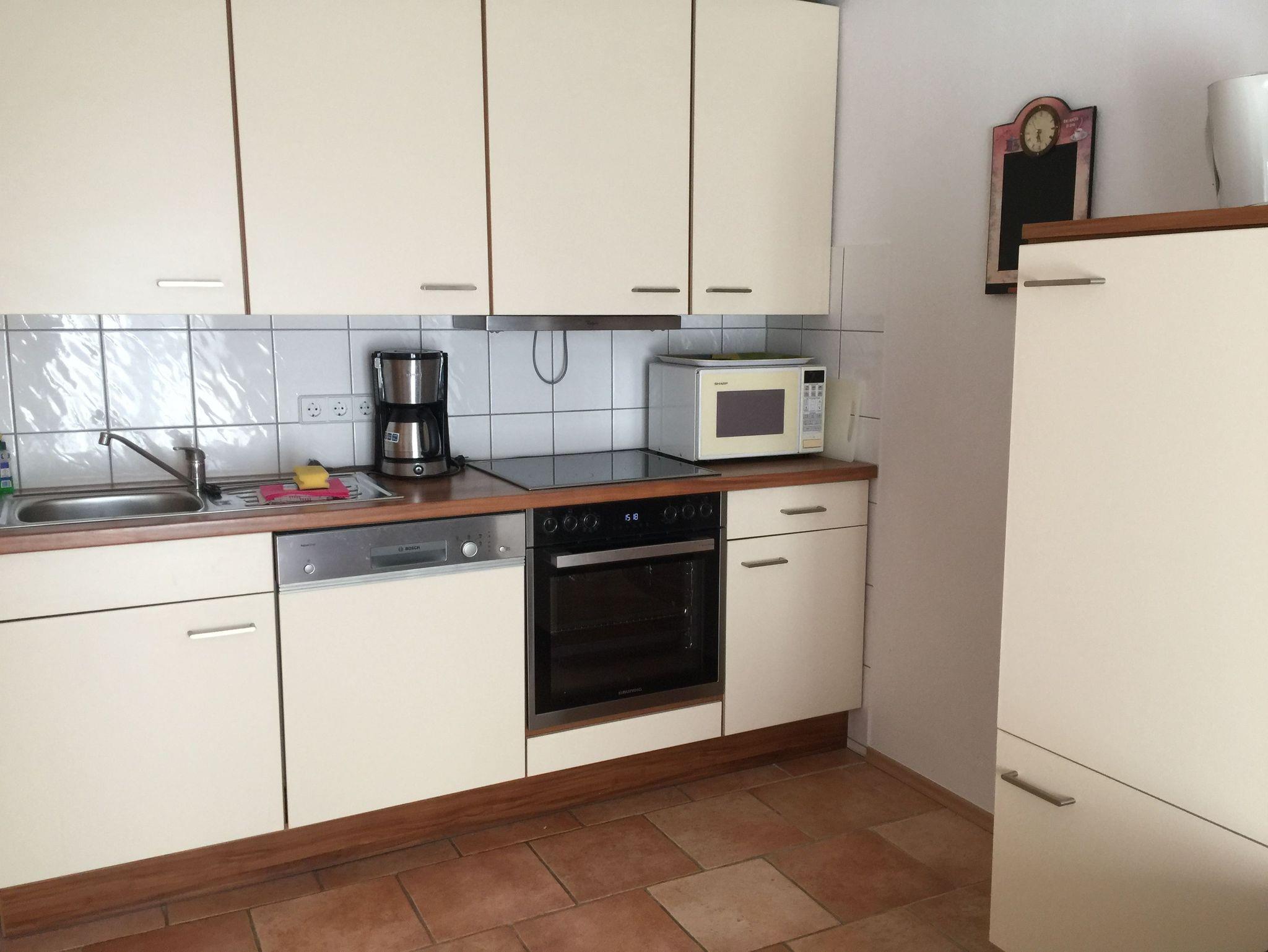 Die Küchenzeile hat u.a. einen Ceranherd, Backofen, Kühlschrank mit Gefrierfach, Geschirrspüler,Mikrowelle, Kaffeemaschine, Toaster und Wasserkocher.