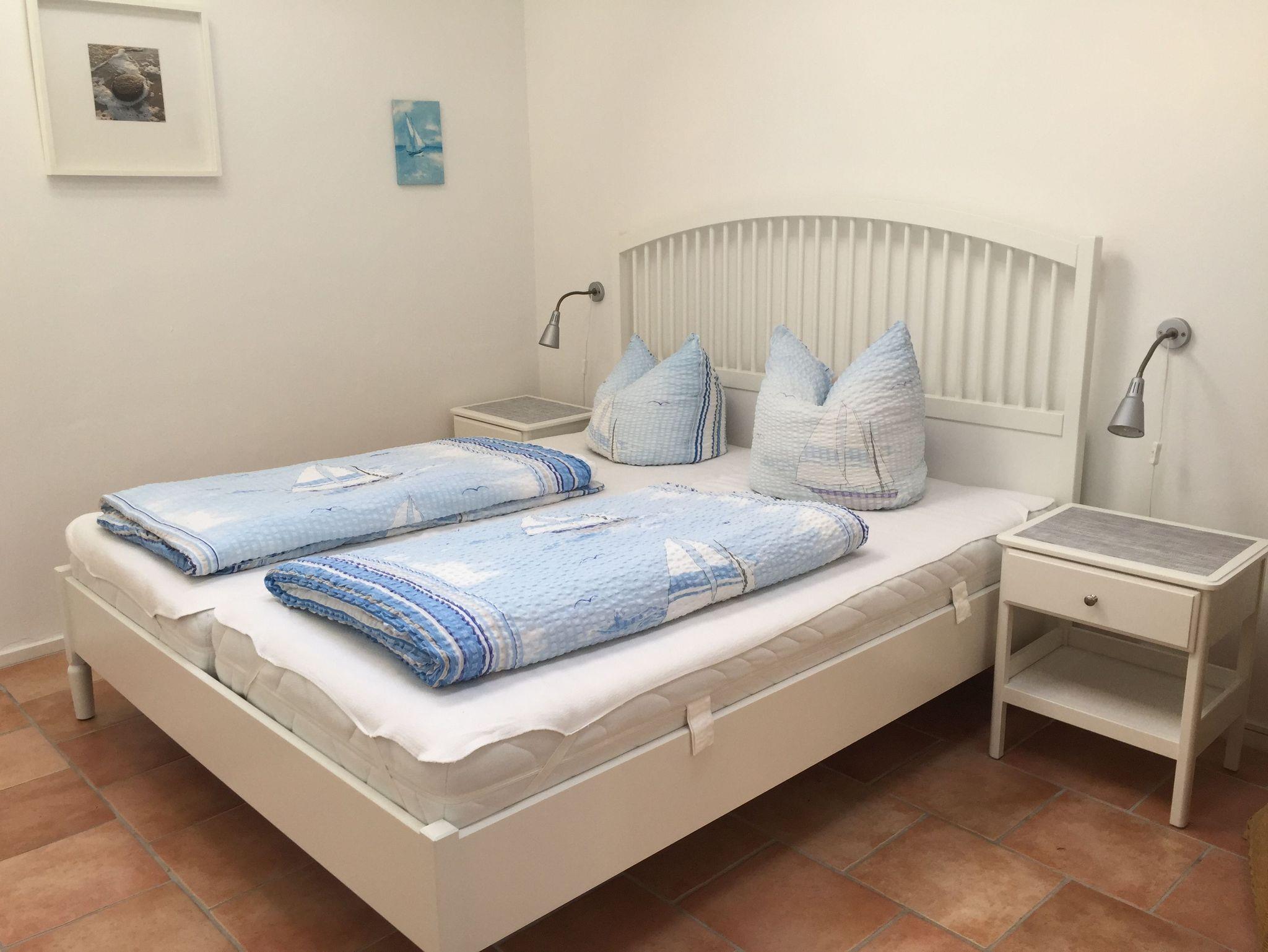Das Appartement „Strandkorb“ befindet sich im Erdgeschoss und besteht aus einem Wohn-Essraum mit einer Küchenzeile, einem großzügigen Schlafzimmer mit vier Betten, einem Badezimmer mit Dusche sowie einer Terrasse die mit Gartenmöbeln ausgestattet ist. Es ist geschmackvoll eingerichtet. Die Küchenzeile verfügt über einen Herd, einen Backofen, einen Kühlschrank mit Gefrierfach, einen Geschirrspüler, eine Kaffeemaschine und einen Wasserkocher. Im Wohnbereich laden eine ausziehbare Couch und eine Leselampe zu gemütlichen Schmöckerstunden und Erholen ein.