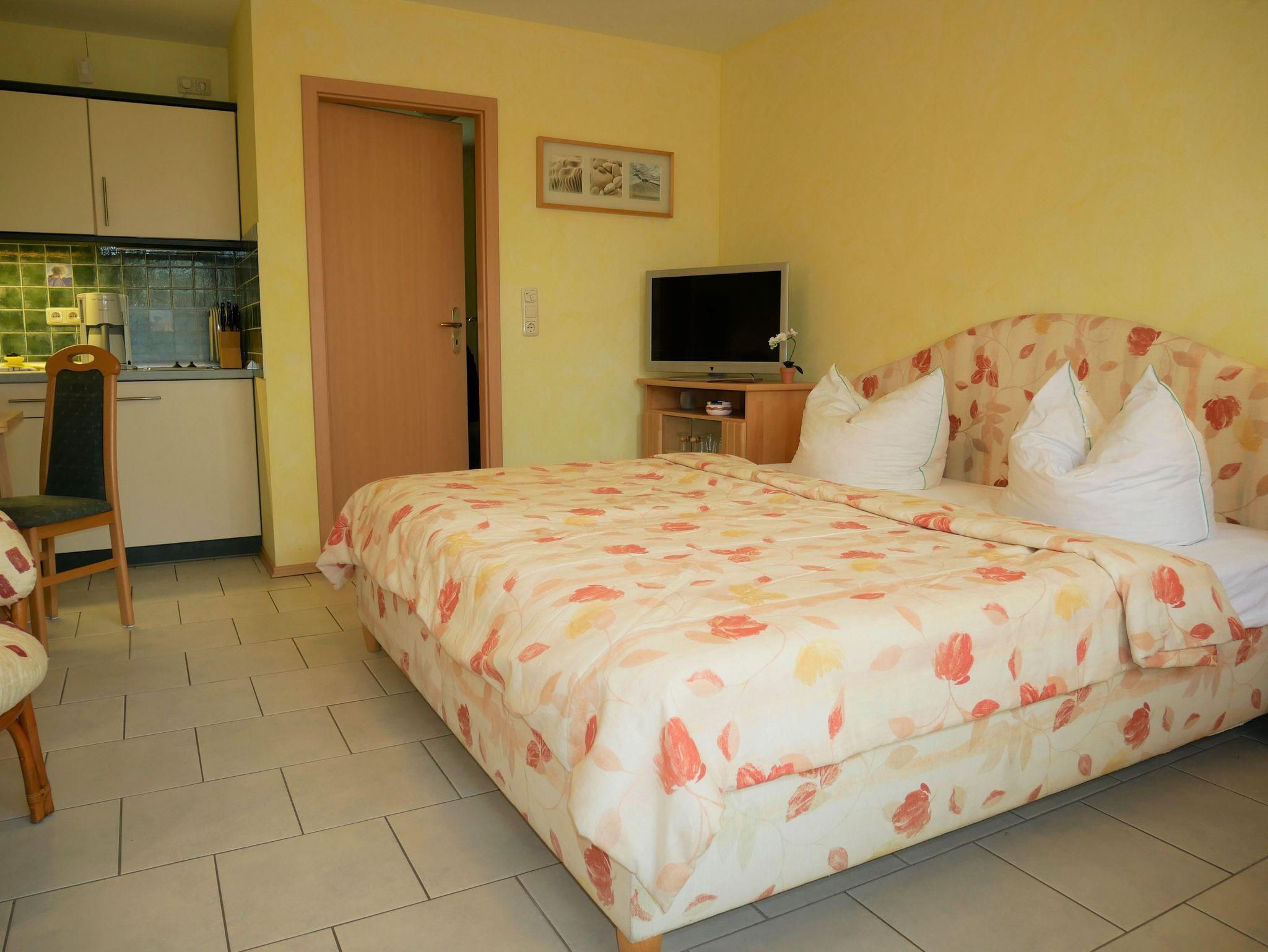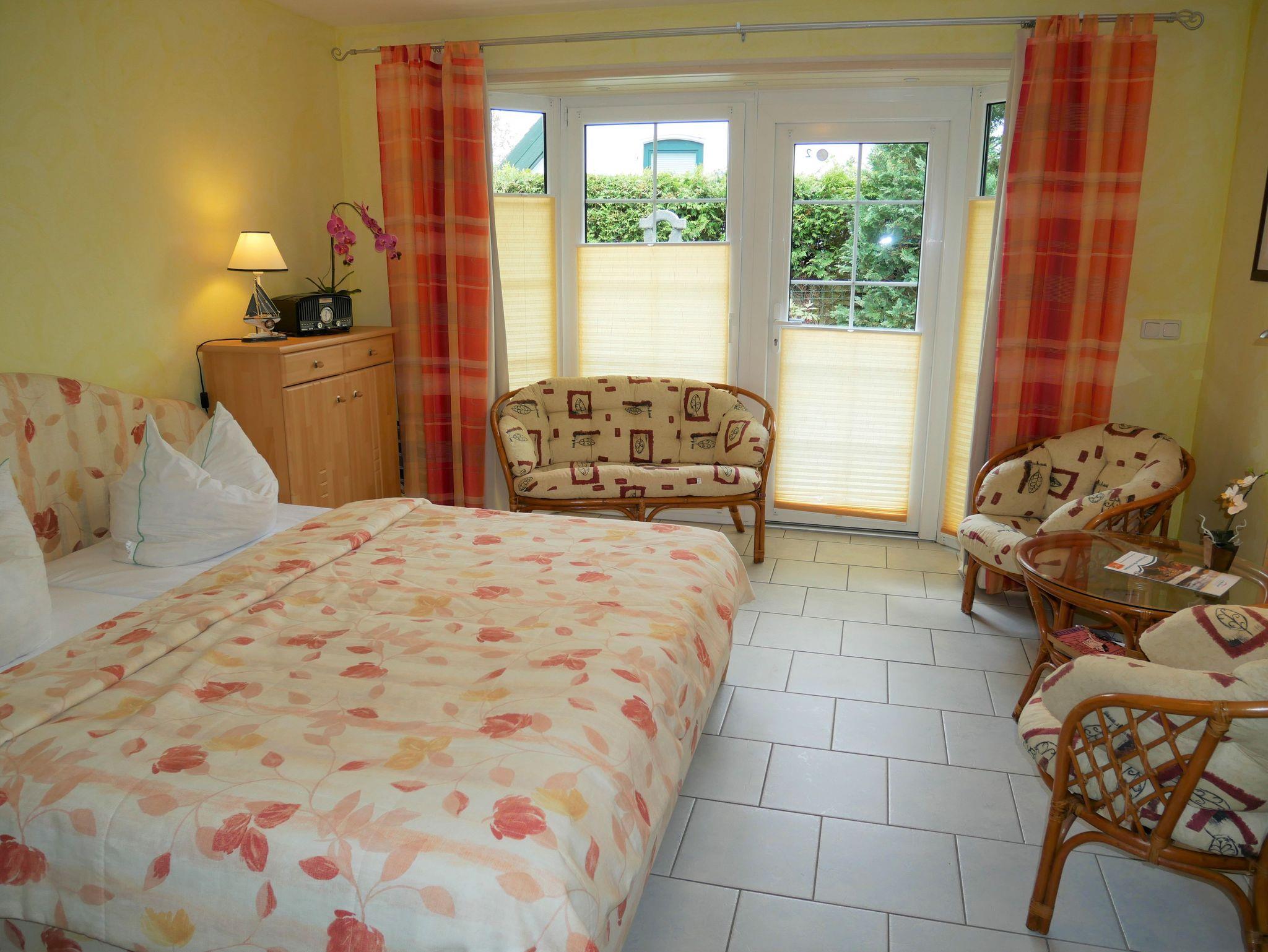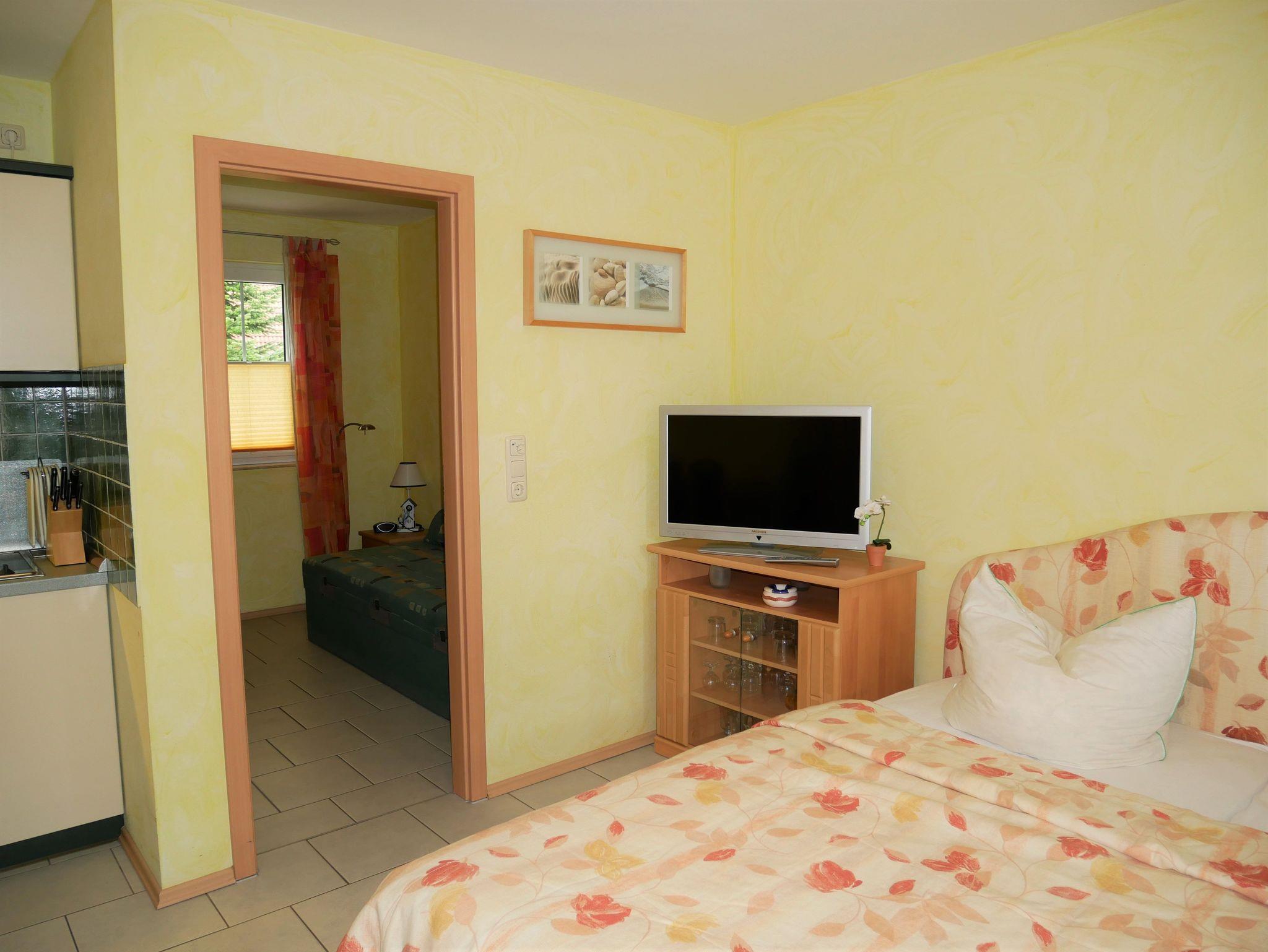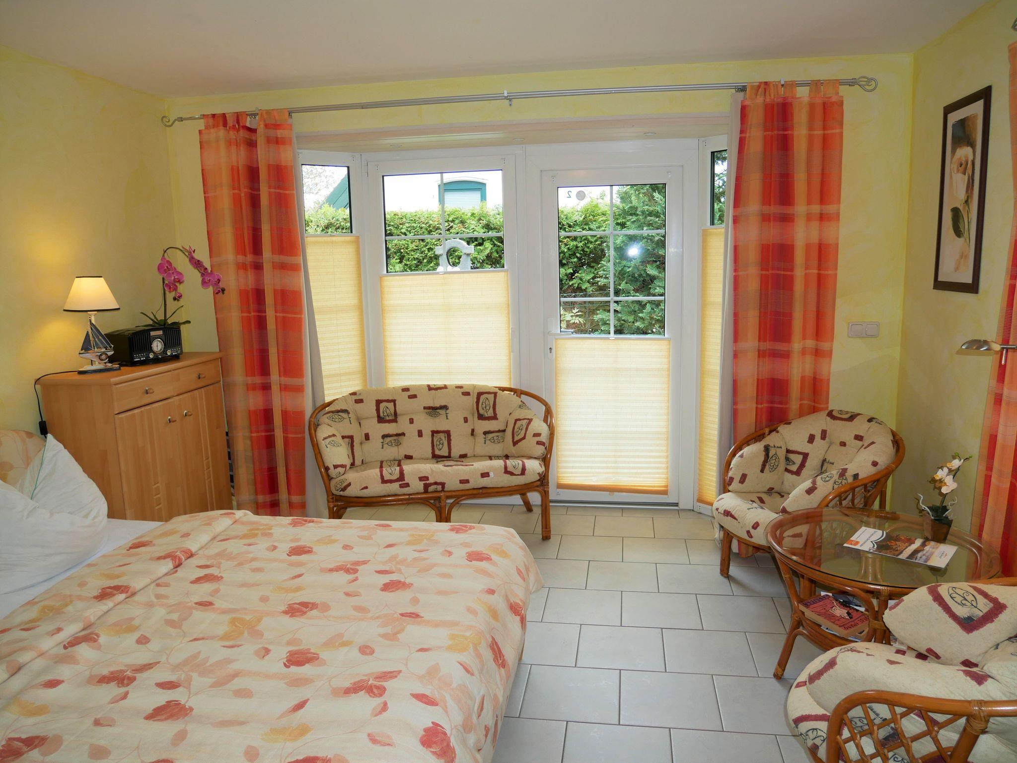 Die gemütliche Ferienwohnung ist ca. 30qm groß und für 2 Personen geeignet. Sie befindet sich im Erdgeschoss und hat einen separaten Eingang sowie eine Terrasse. Die Ferienwohnung verfügt über einen kombinierten Wohn-Schlafraum mit Doppelbett, Flat-TV, Esstisch & Mini-Küche mit 2-Plattenherd, Kühlschrank, Kaffeemaschine, Wasserkocher und Toaster. Zusätzlich gibt es ein kleines separates Zimmer mit einem Schlafsofa.