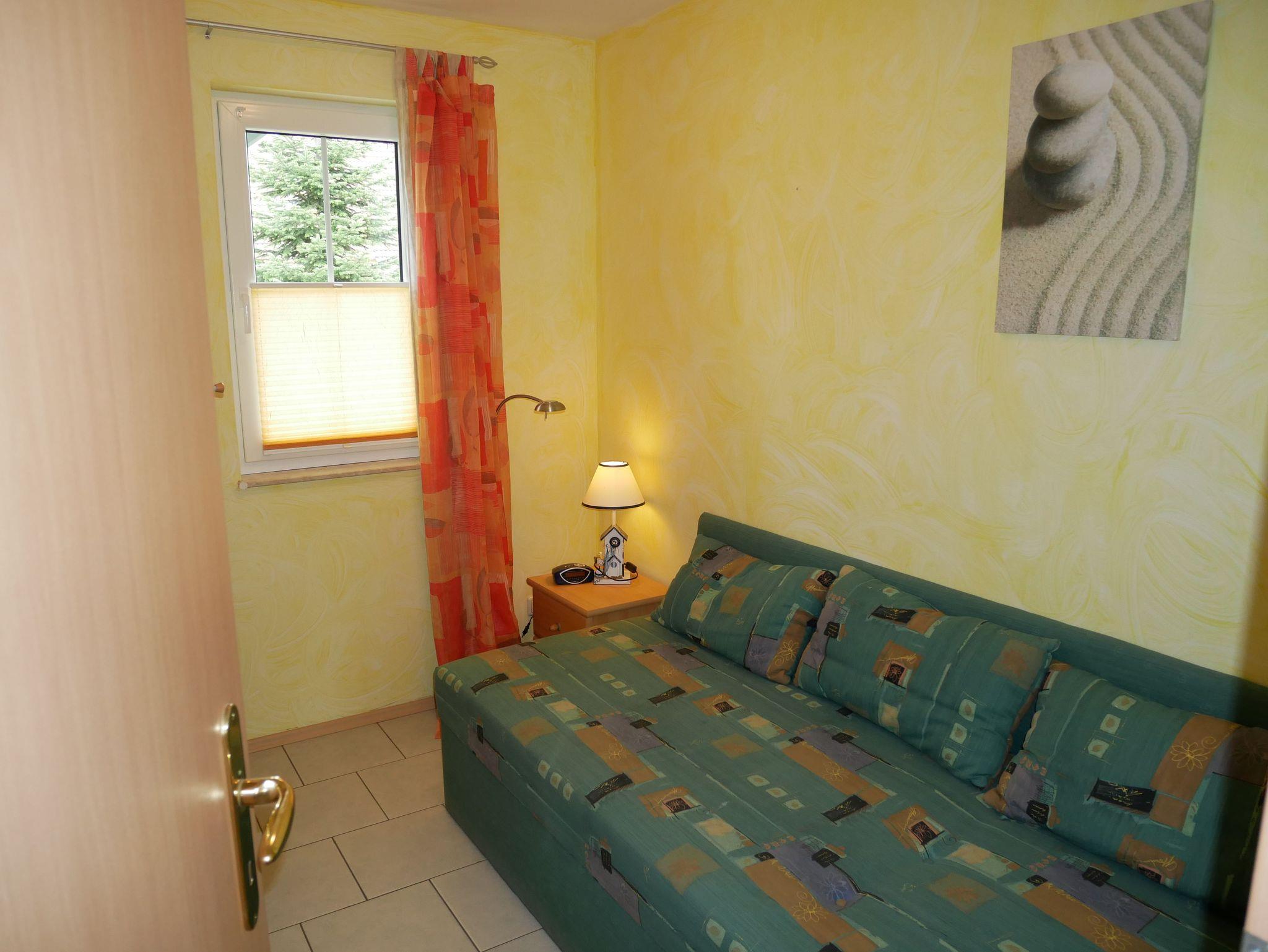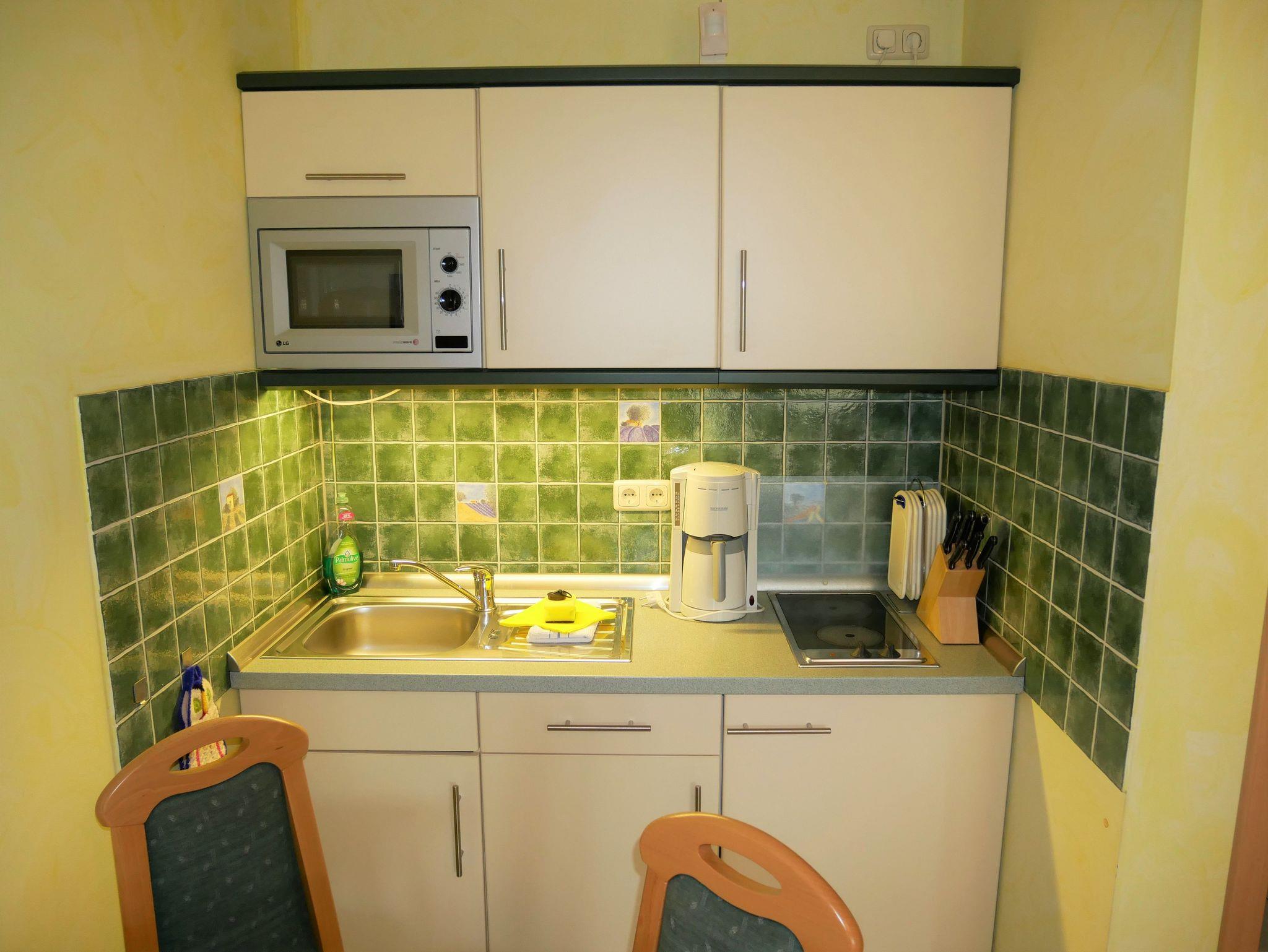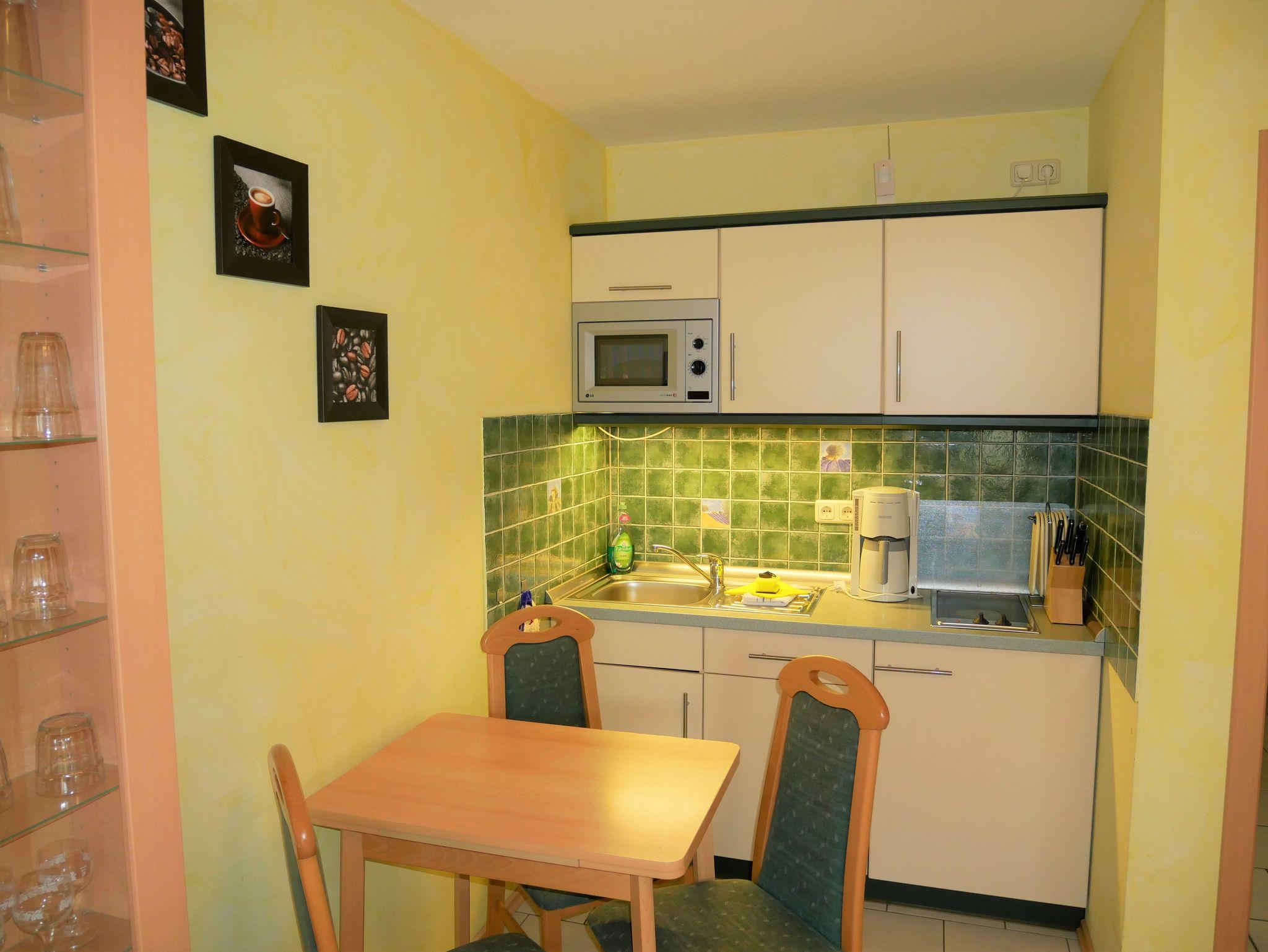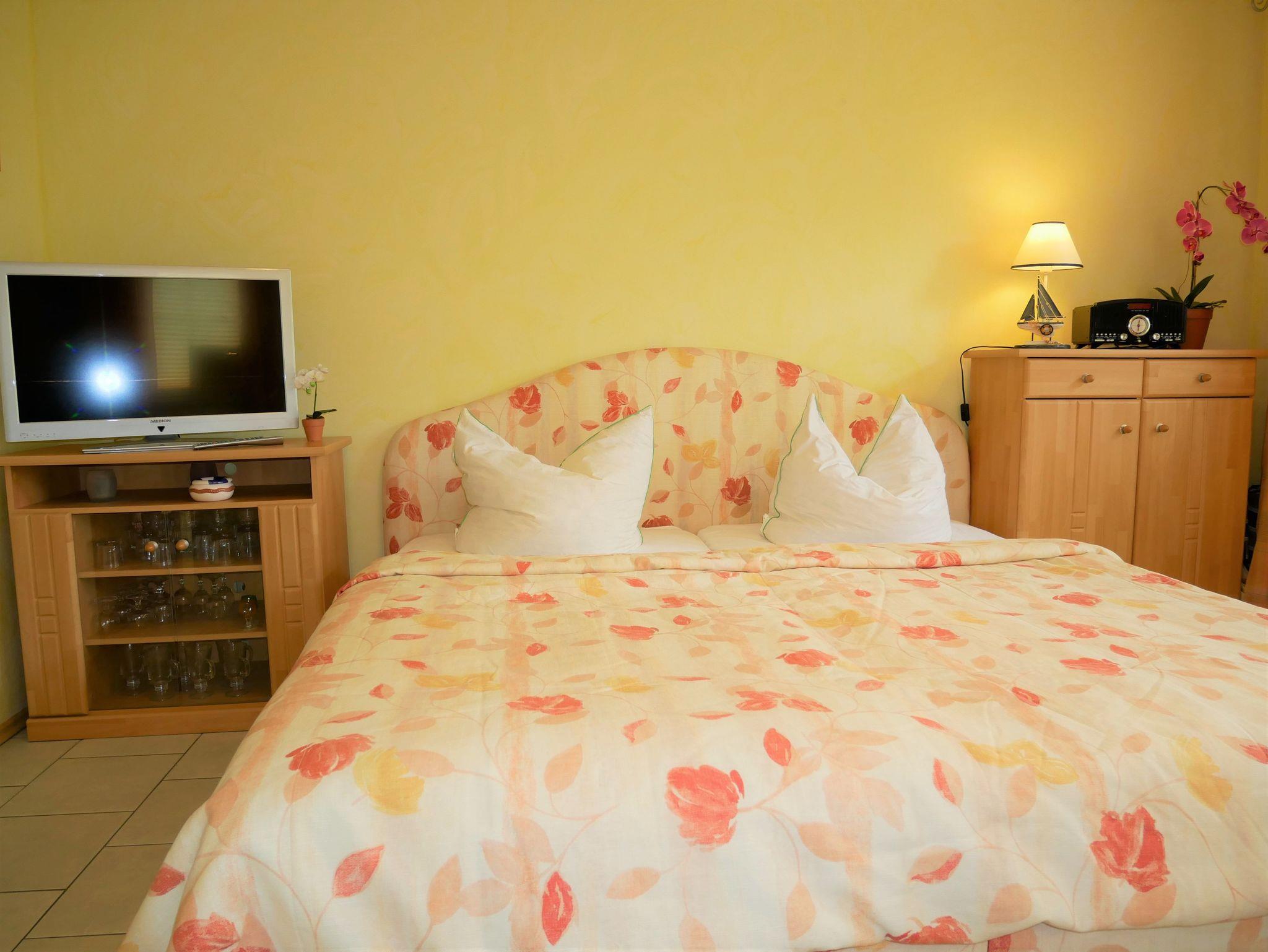 Die gemütliche Ferienwohnung ist ca. 30qm groß und für 2 Personen geeignet. Sie befindet sich im Erdgeschoss und hat einen separaten Eingang sowie eine Terrasse. Die Ferienwohnung verfügt über einen kombinierten Wohn-Schlafraum mit Doppelbett, Flat-TV, Esstisch & Mini-Küche mit 2-Plattenherd, Kühlschrank, Kaffeemaschine, Wasserkocher und Toaster. Zusätzlich gibt es ein kleines separates Zimmer mit einem Schlafsofa.