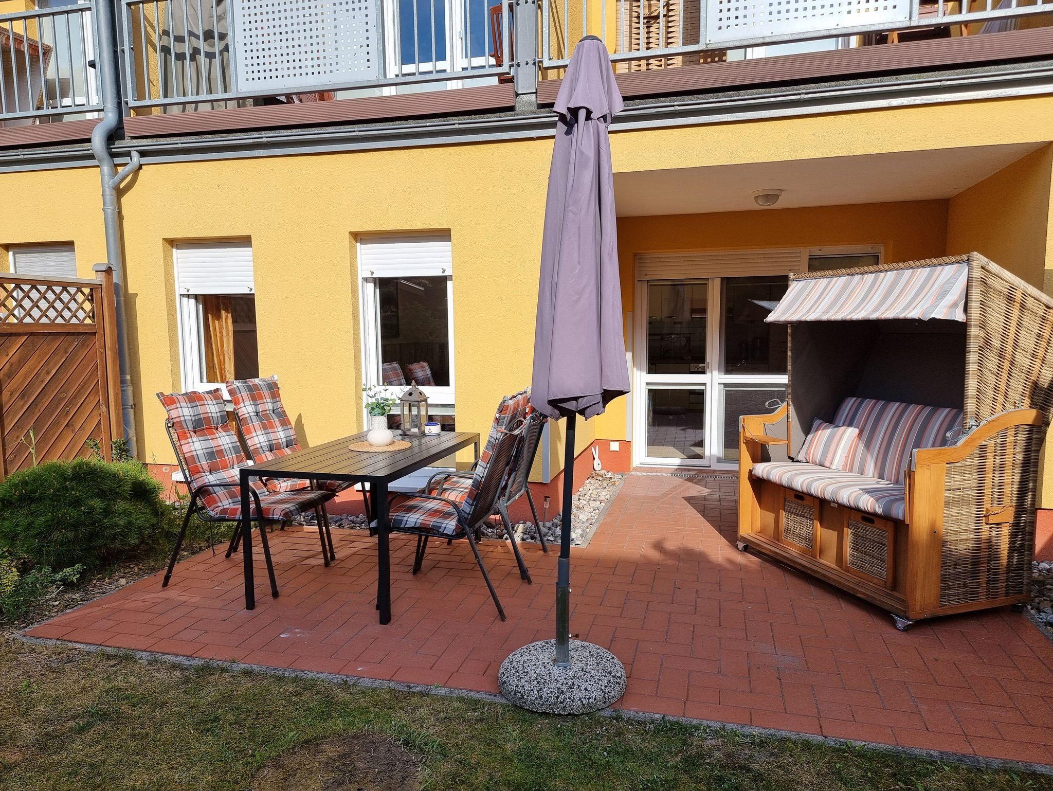 1 Terrasse mit Garten, Strandkorb & Gartenmöbel