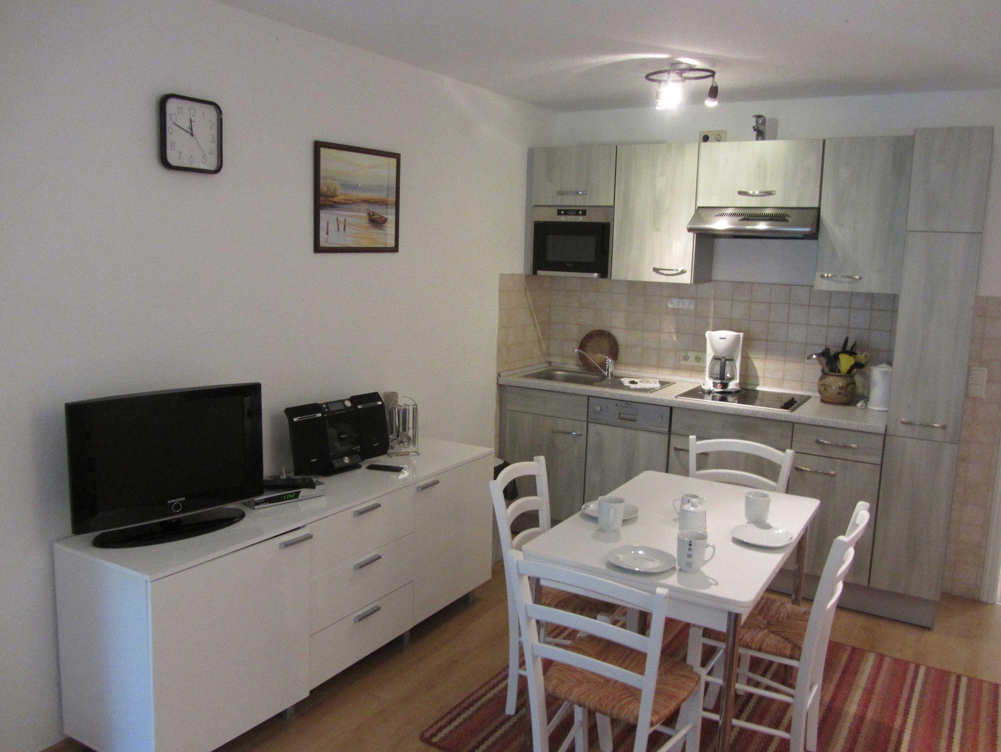 gut ausgestattete Küche mit Geschirrspüler, Cerankochfeld, Mikrowelle, Kühlschrank, Tiefkühlfach, Wasserkocher, Gläser, Geschirr, Besteck, Kaffeemaschine, Toaster, TV, Radio mit CD Player, Kinderreisebett und Hochstuhl.