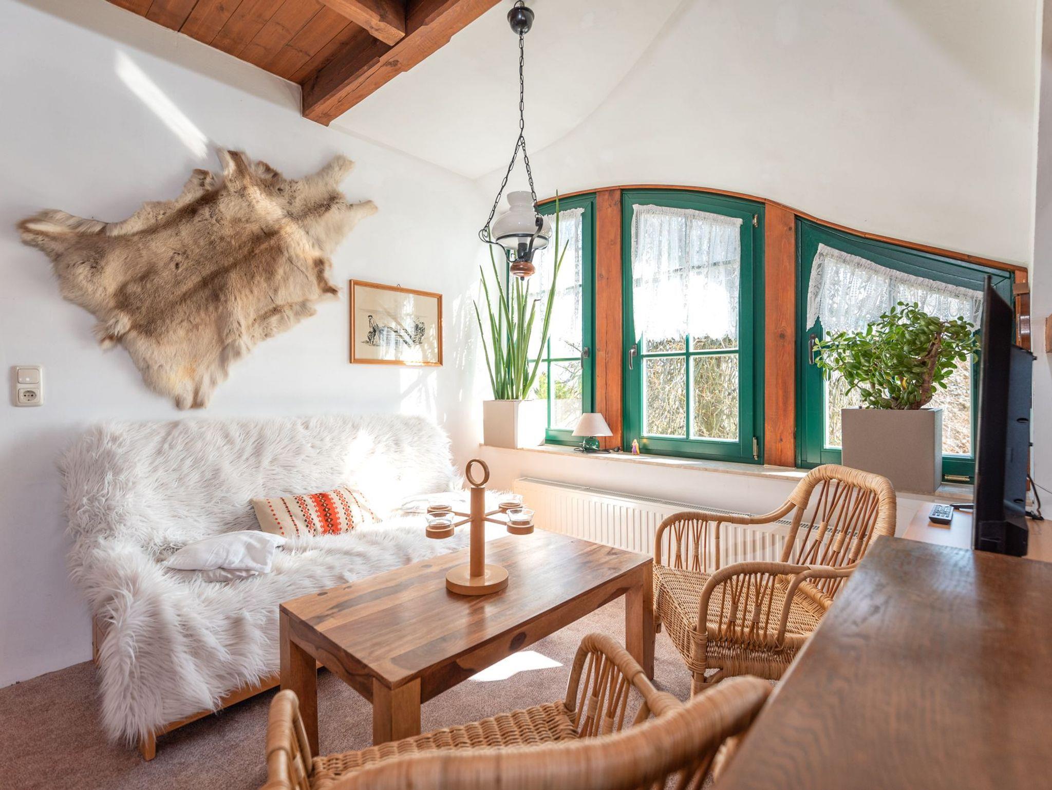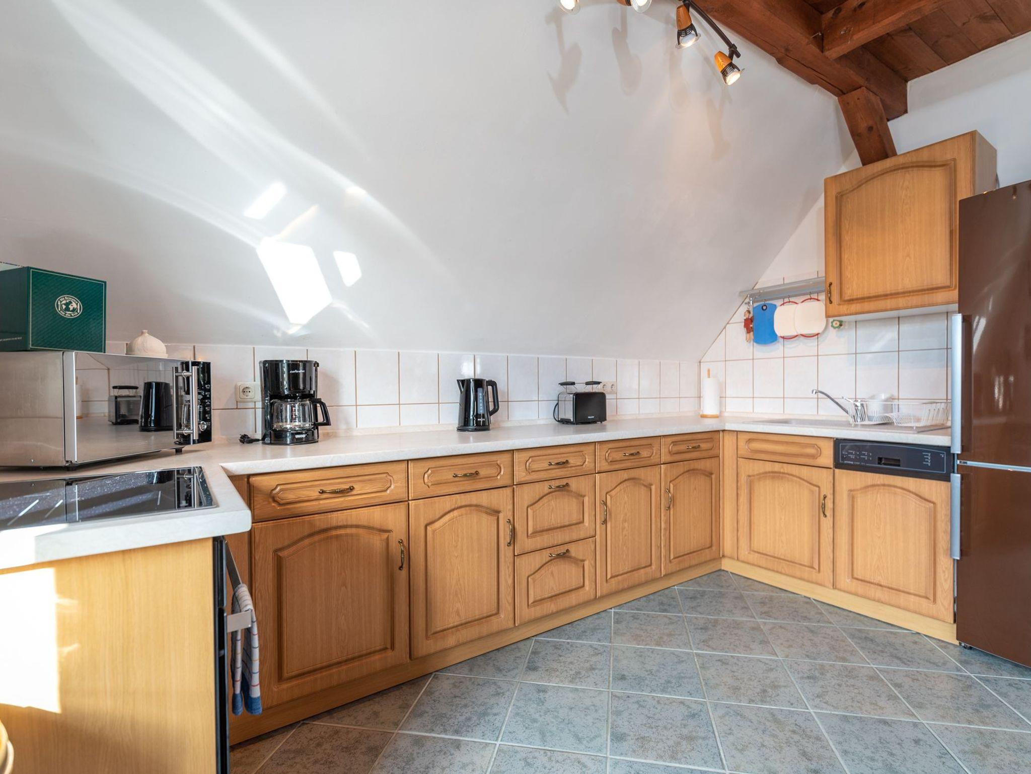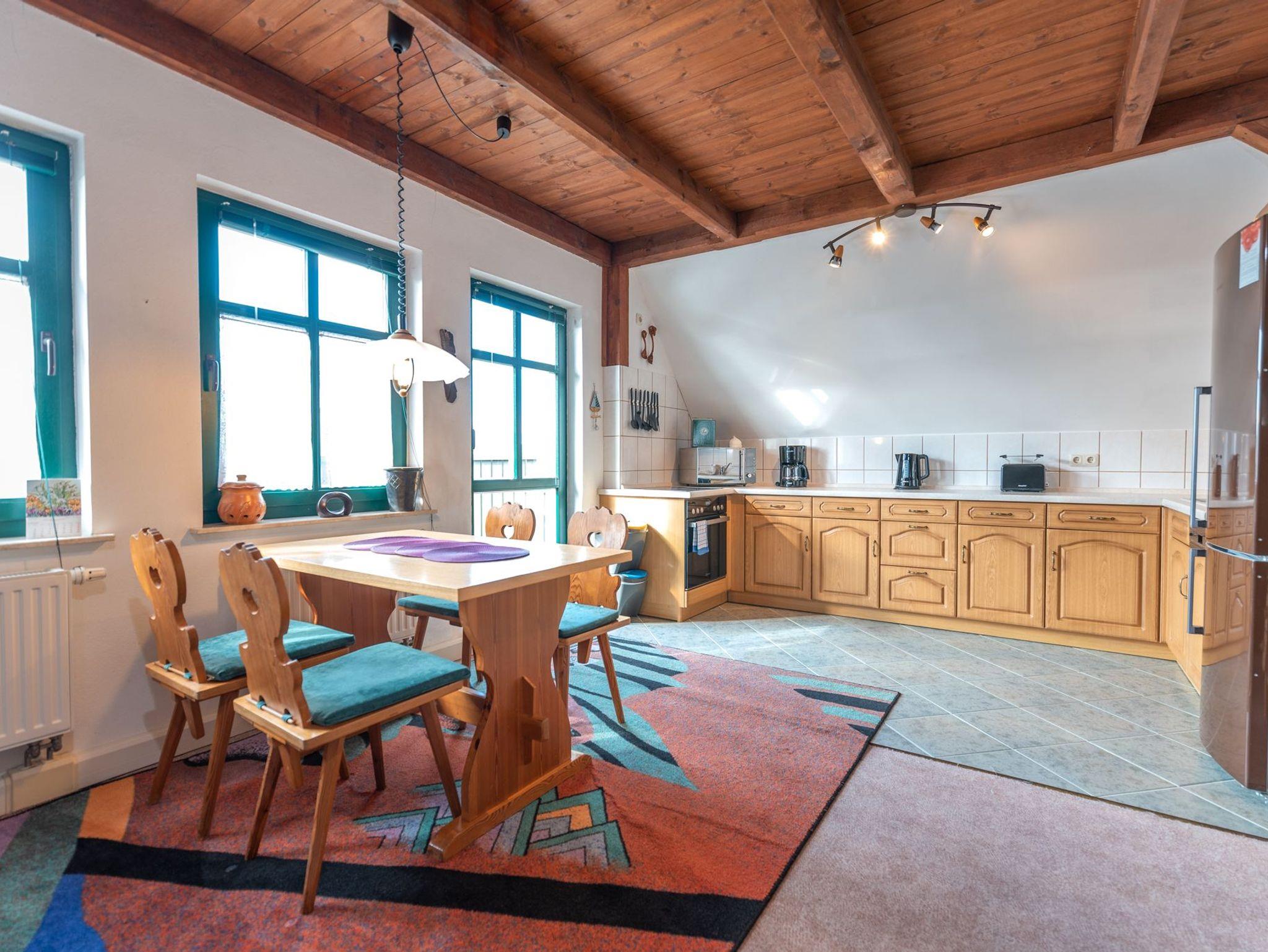 Diese gemütliche Wohnung umfasst eine großzügig ausgestattete Wohnküche, die sowohl einen Essplatz für vier Personen als auch eine einladende Sitzecke mit Fernseher bietet. Für die Nachtruhe stehen zwei Schlafzimmer bereit: eines mit einem komfortablen Doppelbett und ein weiteres mit einem schmaleren Doppelbett, ideal für Kinder oder zusätzliche Gäste. Wichtig zu beachten ist die eingeschränkte Deckenhöhe in den oberen Schlafräumen, die dem Raum eine besonders gemütliche Atmosphäre verleiht.