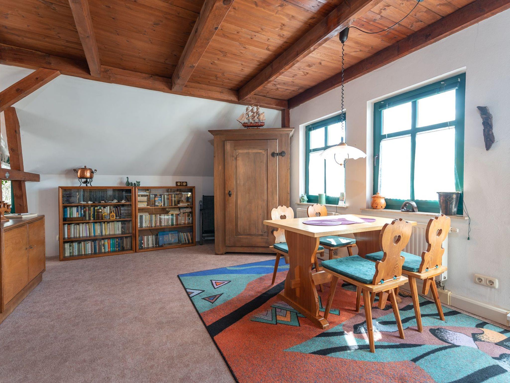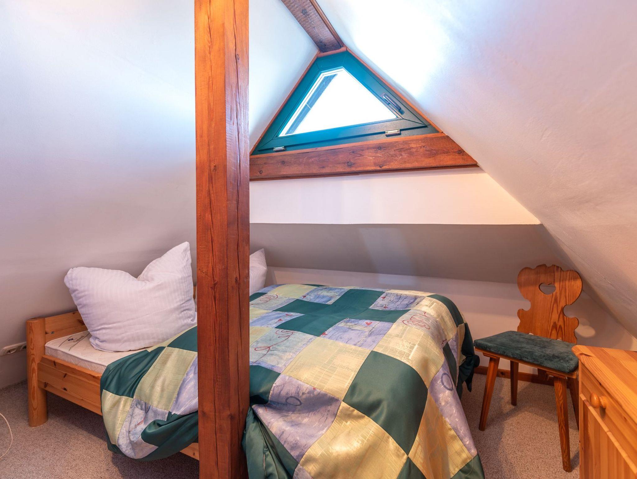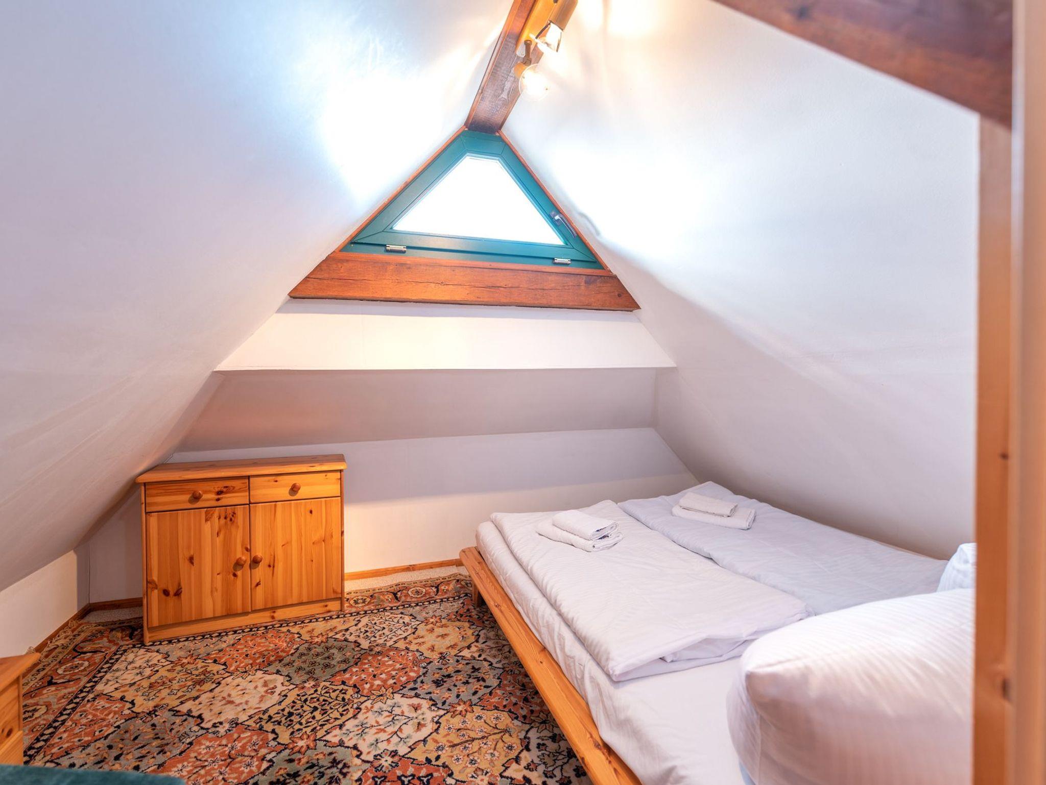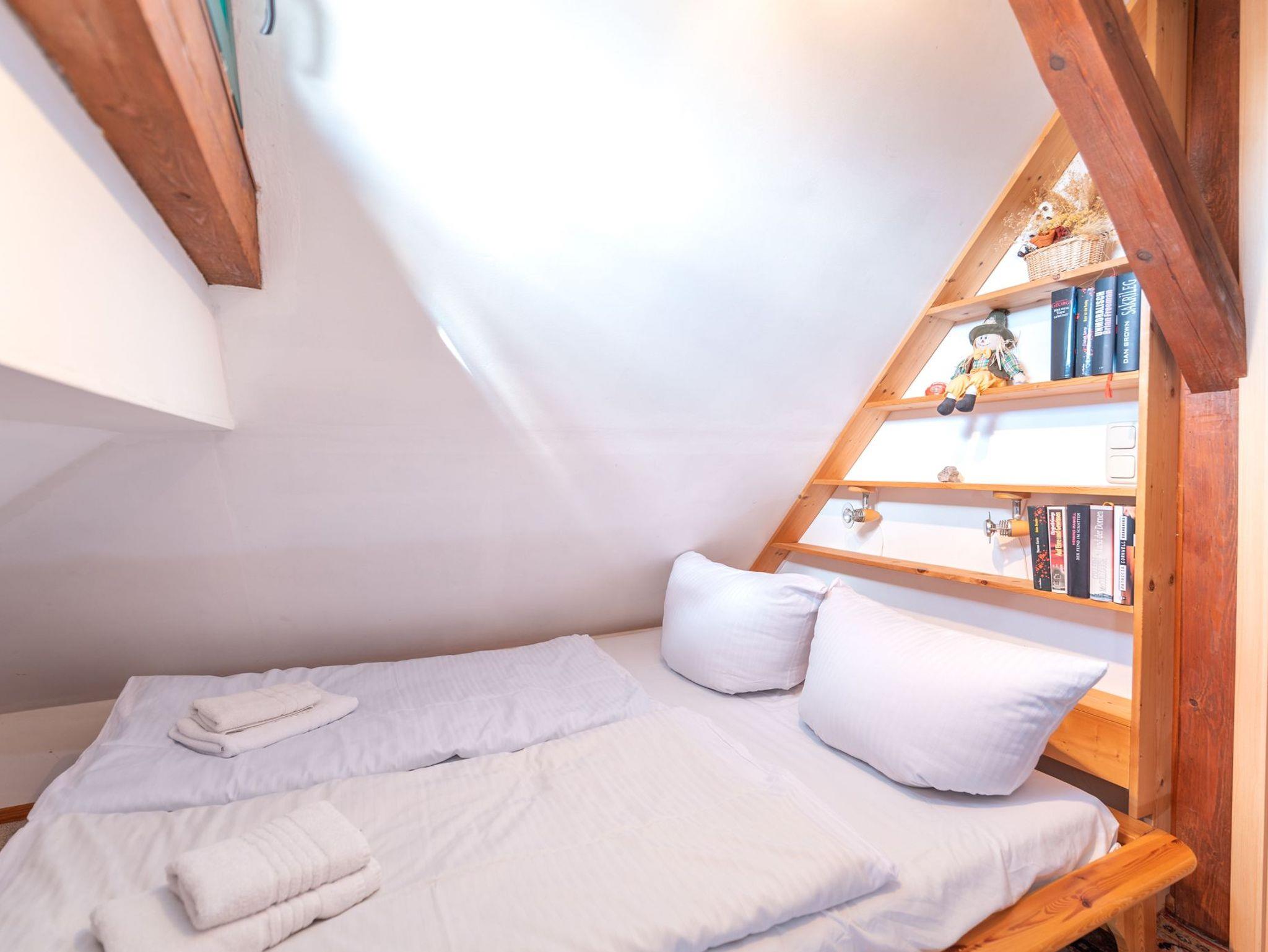 Diese gemütliche Wohnung umfasst eine großzügig ausgestattete Wohnküche, die sowohl einen Essplatz für vier Personen als auch eine einladende Sitzecke mit Fernseher bietet. Für die Nachtruhe stehen zwei Schlafzimmer bereit: eines mit einem komfortablen Doppelbett und ein weiteres mit einem schmaleren Doppelbett, ideal für Kinder oder zusätzliche Gäste. Wichtig zu beachten ist die eingeschränkte Deckenhöhe in den oberen Schlafräumen, die dem Raum eine besonders gemütliche Atmosphäre verleiht.