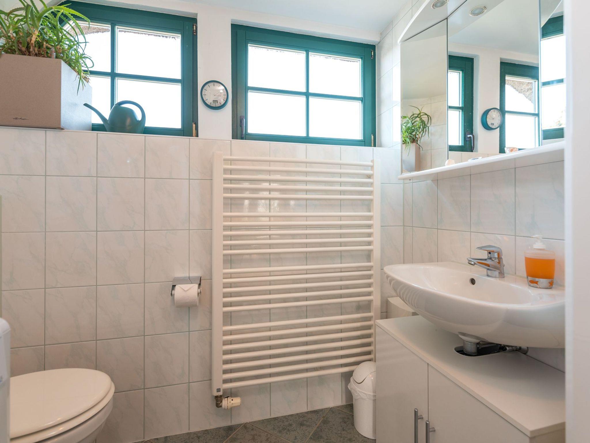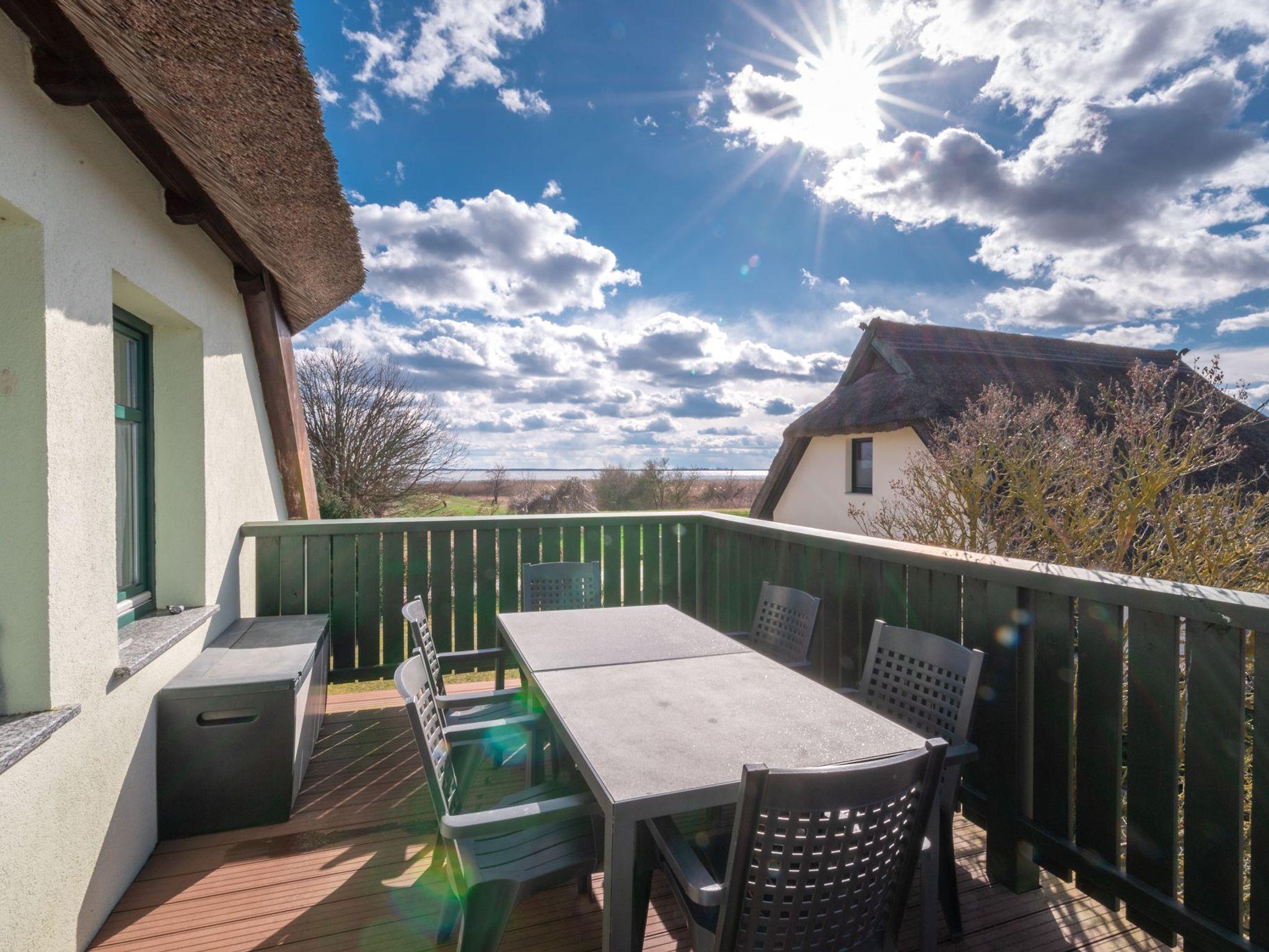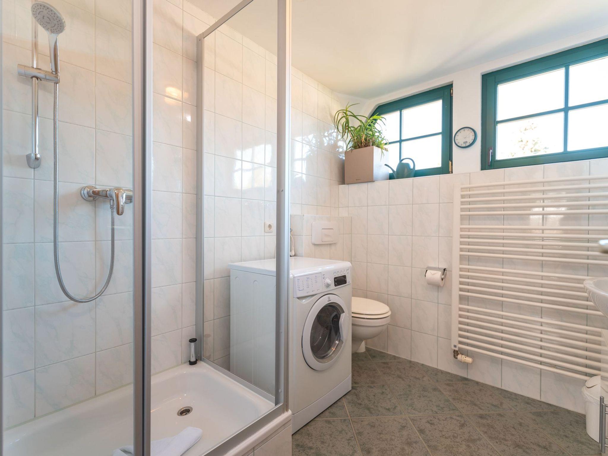 Das Badezimmer ist mit einer Dusche ausgestattet und bietet zusätzlich den Komfort einer Waschmaschine. Von der Wohnung aus führt eine Tür auf den großzügigen Balkon, der einen herrlichen Blick auf das Achterwasser ermöglicht und zum Entspannen im Freien einlädt.