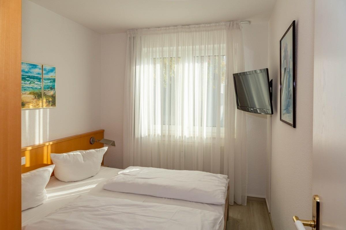 Schlafraum mit Doppelbett und TV