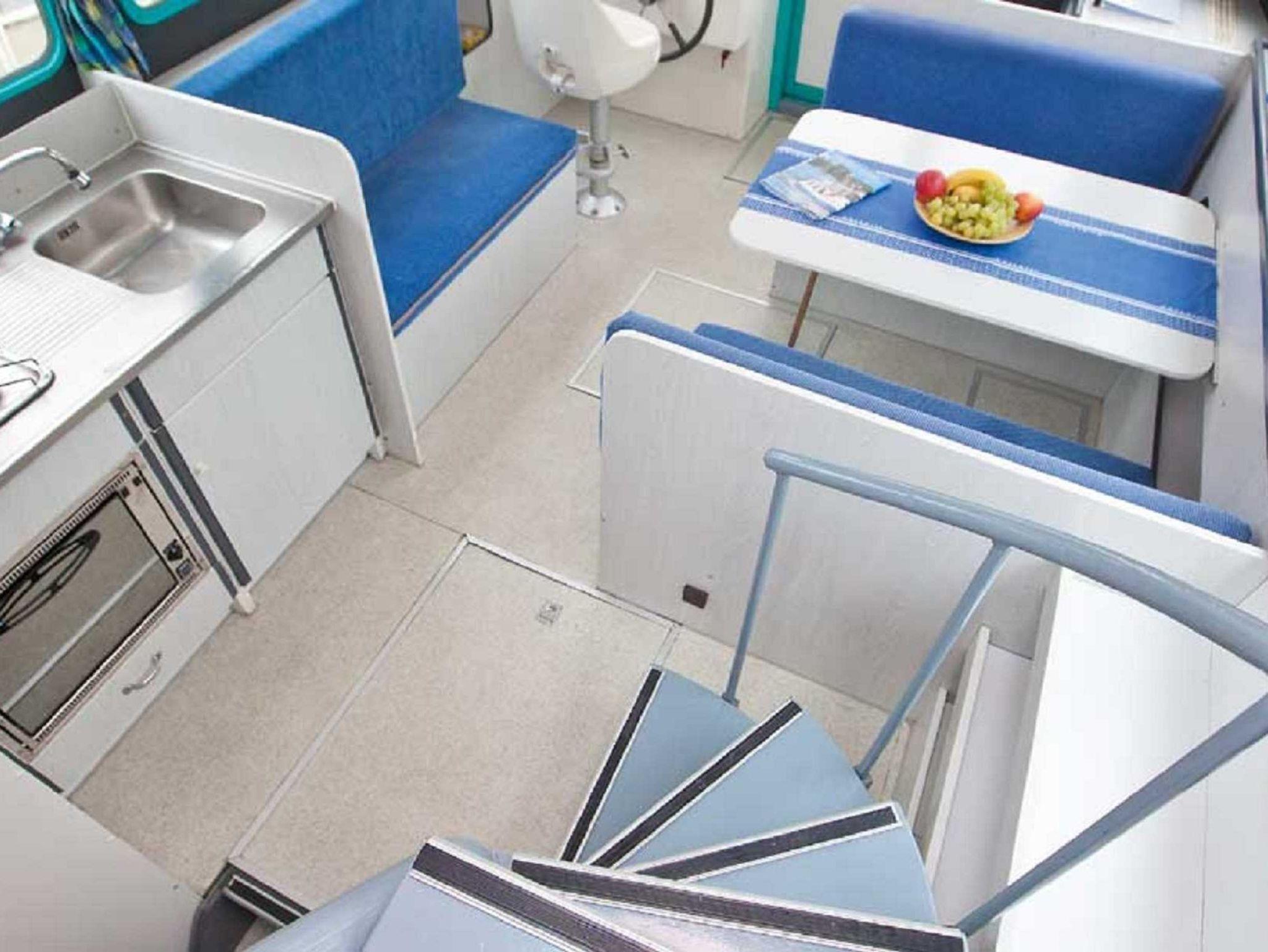 Modernes Hausboot im Yachtstil, Salon und Steuerstand bilden einen großen Raum, zweiter Steuerstand auf dem Sonnendeck, Heckplattform mit Badeleiter, Warmluftheizung, Pantry, zweite Außentür, Bugstrahlruder, Anschluss für Landstrom und iPod, MP3-Player oder Laptop. Ideal für größere Gruppen.