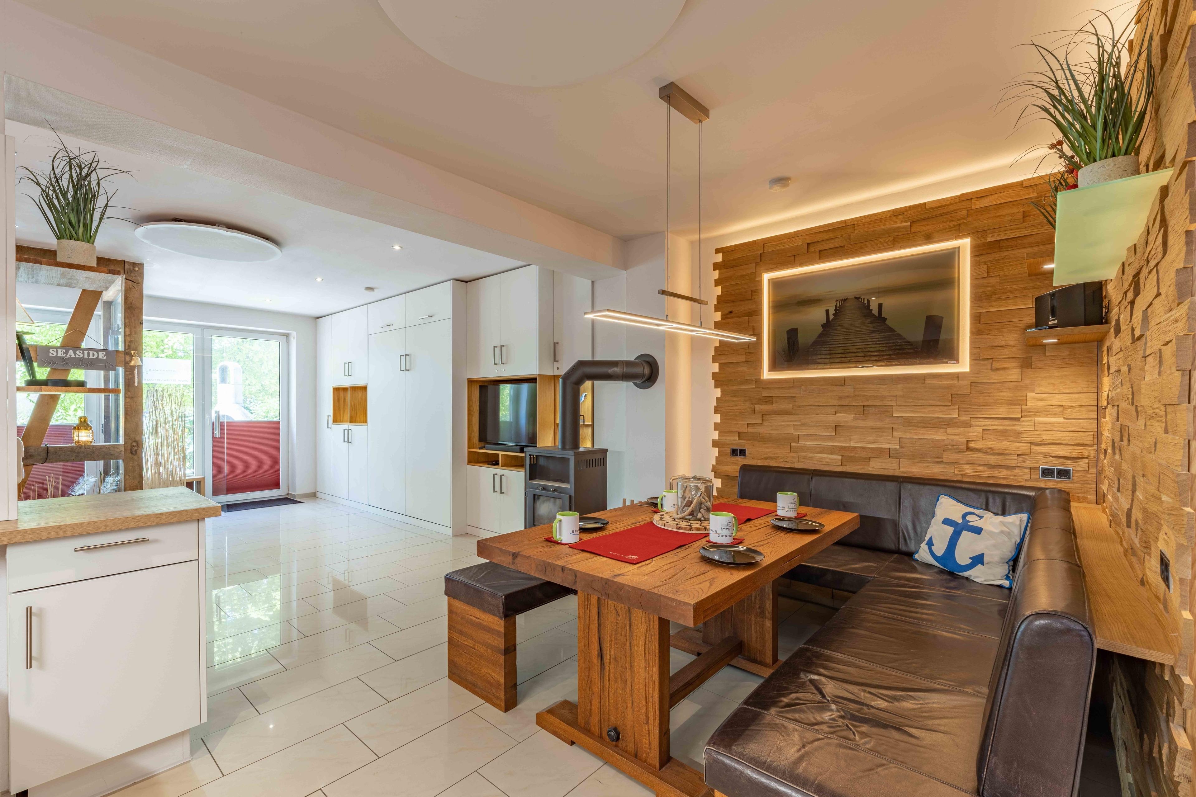Auch im Herbst und Winter lädt das Strandhaus Sie ein. Genießen Sie die Ruhe am Strand bei langen Spaziergängen beispielsweise zum Fliemsdorfer Huk. Anschließend kann man es sich vor dem Kamin mit einem Glas Rotwein gemütlich machen.