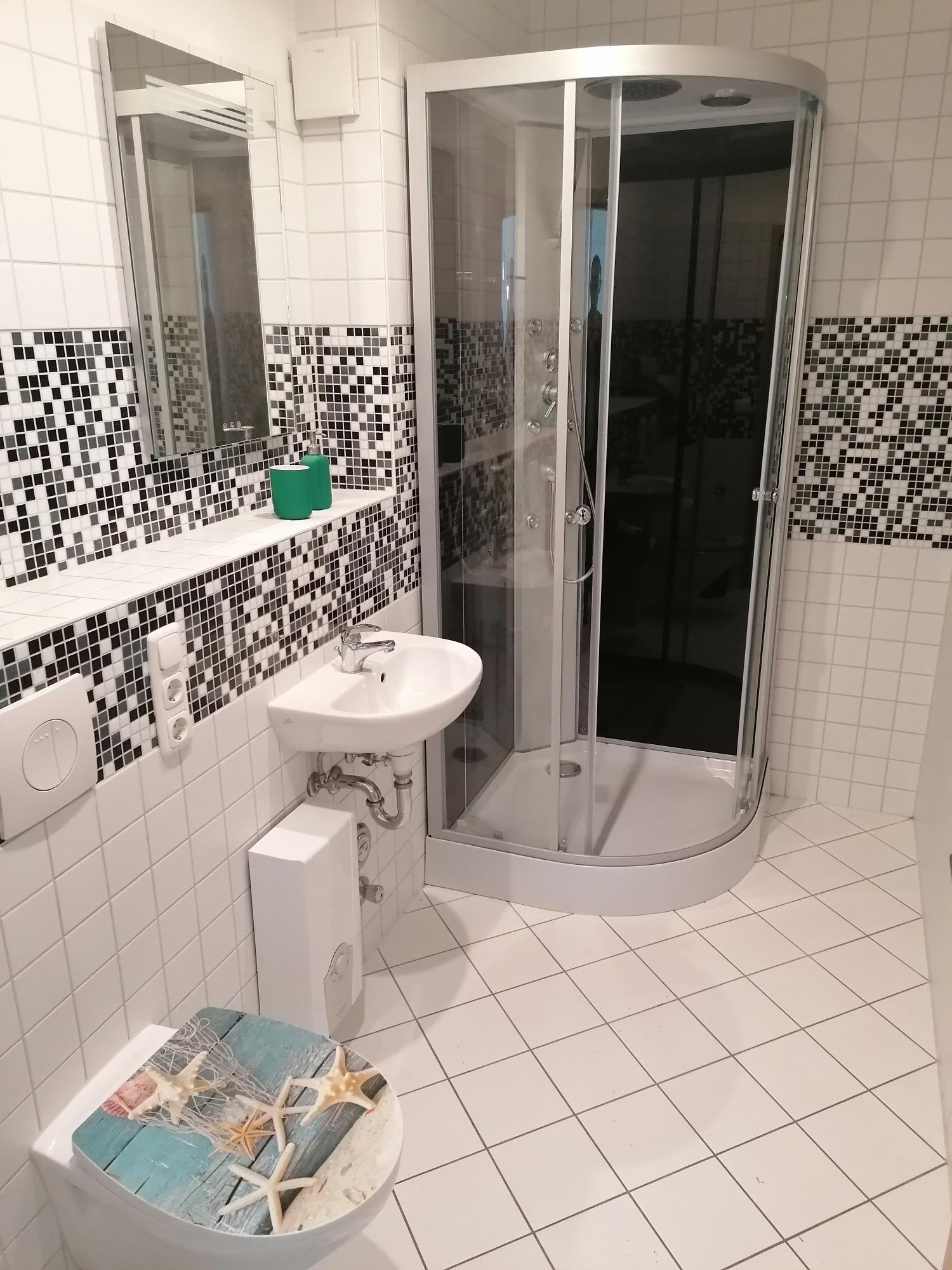 - Duschbad mit Dusche, WC, Spiegel und Föhn