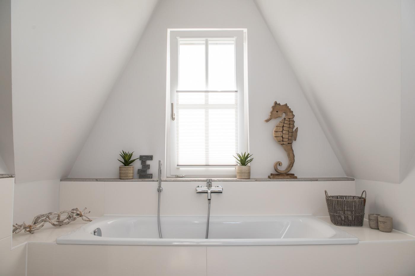 Im oberen Bereich stehen Ihnen zwei Schlafzimmer mit je einem Boxspringbett und Kommoden zur Verfügung. Ein 2. TV ist in einem Schlafzimmer vorhanden sowie eine Schlafcouch für weitere Personen. Das Duschbad mit Echtglasduschabtrennung, Waschbecken und WC ist in der typischen Fledermausgaube des Reethauses eingerichtet.