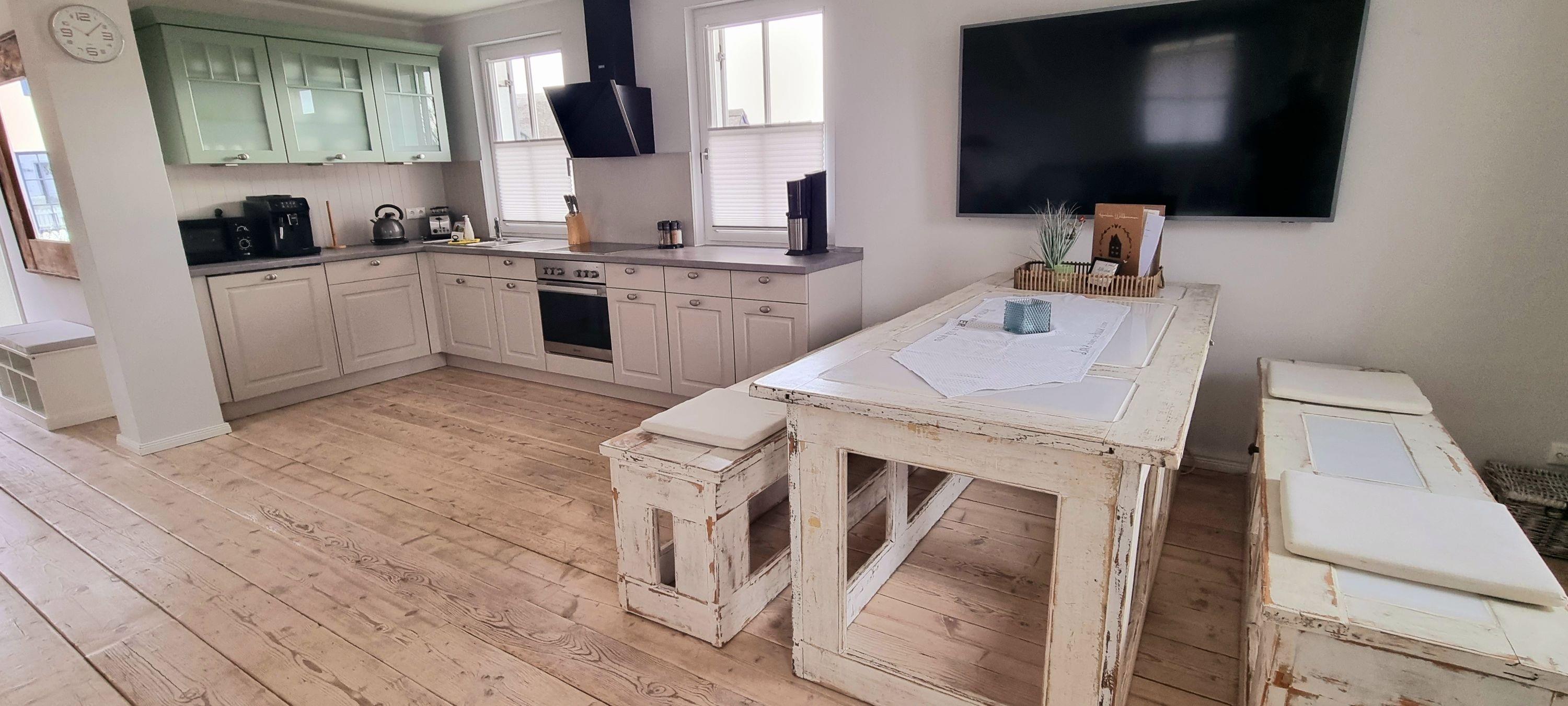 Im Garten zur Südseite können Sie es sich auf den Gartenmöbel bequem machen und Blicke über die Wiesen und Felder Ihre Blicken schweifen lassen. Ein Sonnenschirm ist vorhanden. Zusätzlich ist ein Strandkorb und Loungemöbel zum Entspannen im Garten vorhanden. Zum Grillen steht Ihnen ein Elektrogrill von Weber zur Verfügung. Für die kleinen Gäste stehen ein Bollerwagen und Spielzeug bereit. Der Spielturm im Garten bringt Kinderaugen zum leuchten, während Sie ganz entspannt auf der Terrasse Ihren Kaffee trinken und Ihre Kleinen beim Spielen beobachten können.