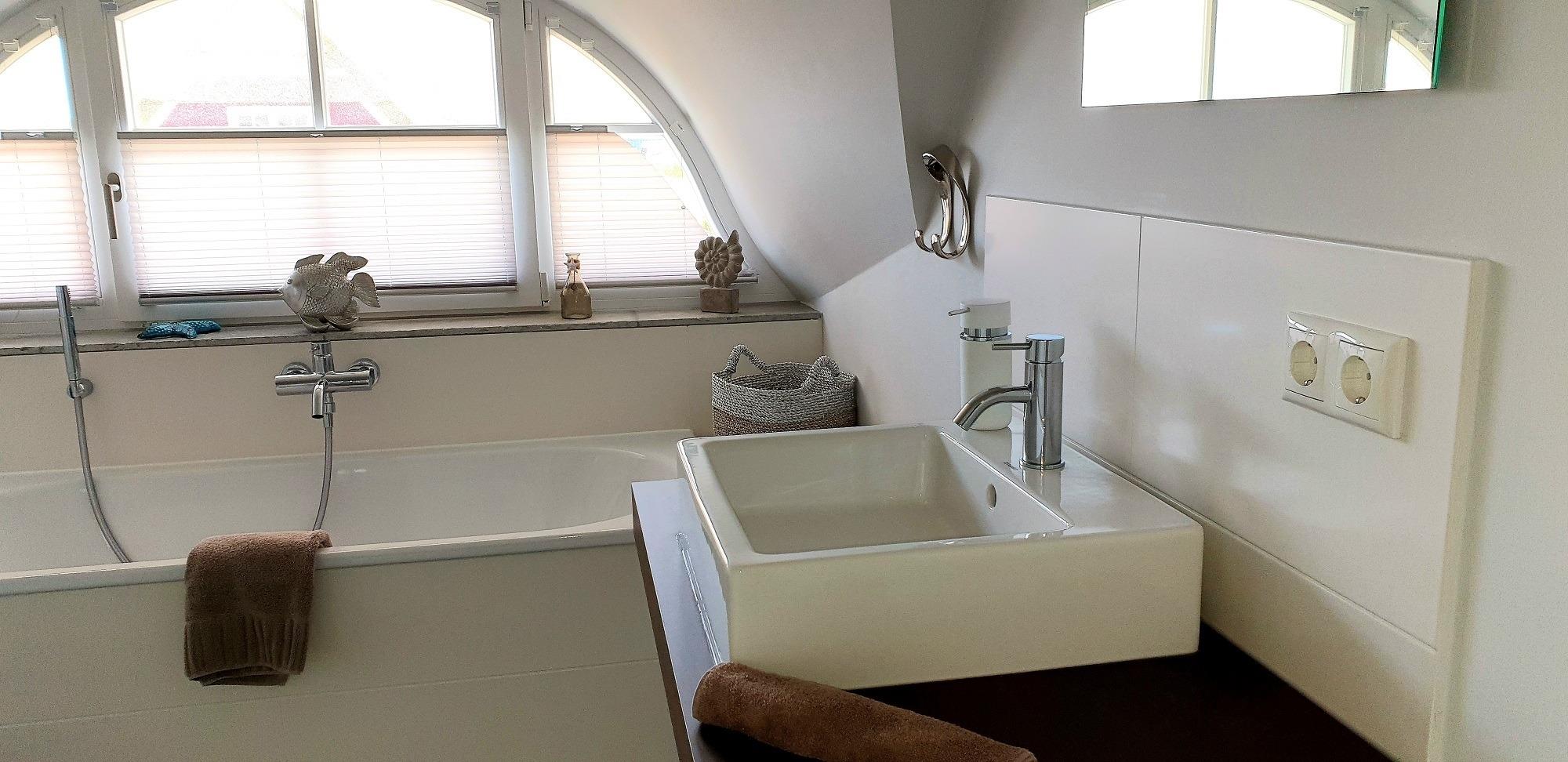 Im oberen Bereich stehen Ihnen ein Schlafzimmer mit einem Boxspringbett und zwei weitere Schlafzimmer mit je einem Einzelbett zur Verfügung. In allen Schlafzimmern ist ein TV vorhanden. Das Vollbad mit Echtglasduschabtrennung, Waschbecken und WC ist in der typischen Fledermausgaube des Reethauses eingerichtet. Im gesamten Haus ist eine Fußbodenheizung verlegt. Zum Sichtschutz sind Pliesses, Vorhänge und Fensterklappläden angebracht. Ein Waschmaschine und Trockner und diverse Putzutensilien sowie Bügelbrett und Bügeleisen sind im HWR verstaut.